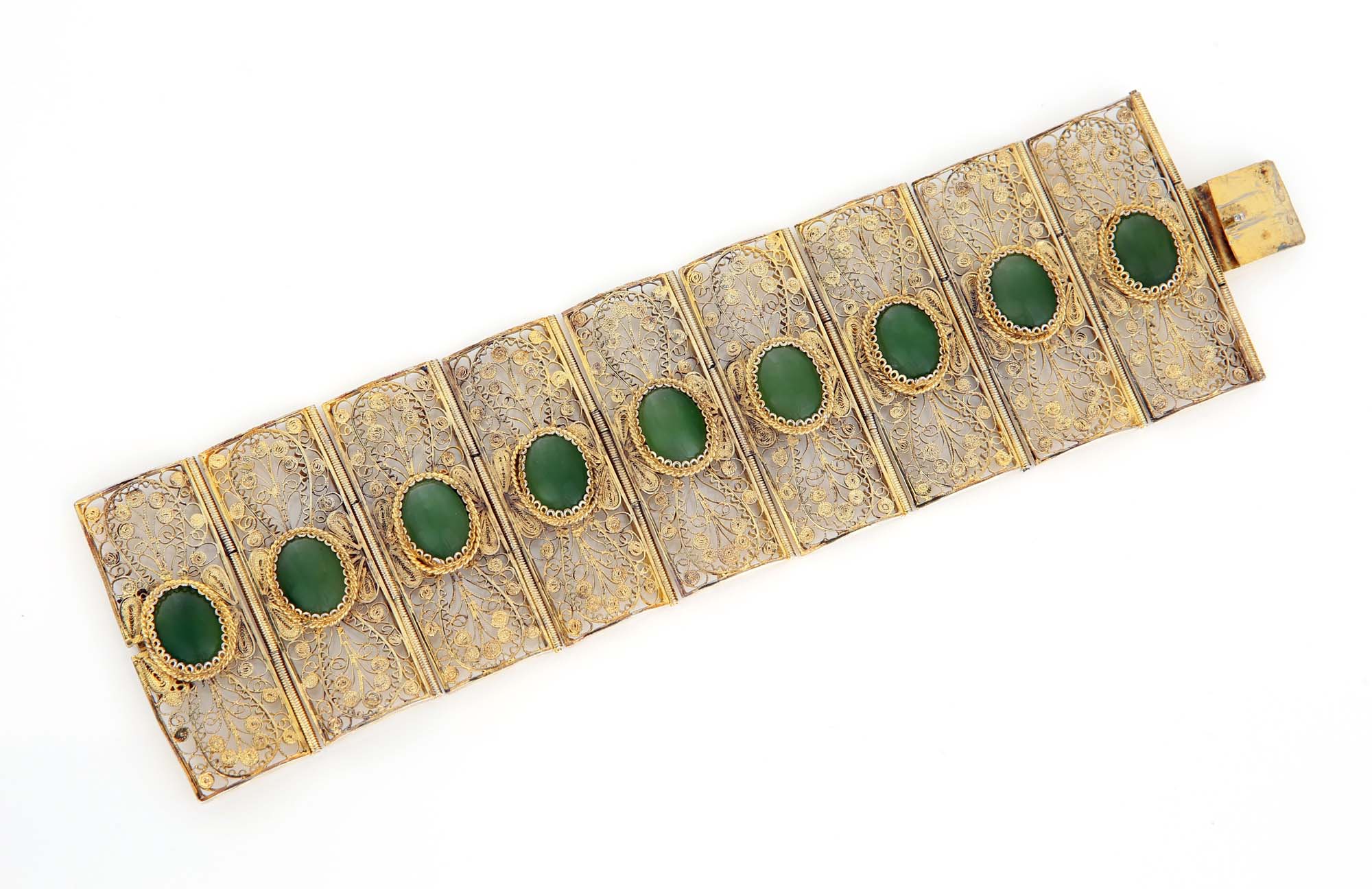 Bracciale in argento dorato e giade Argento 800/000. Punzoni del fascio...