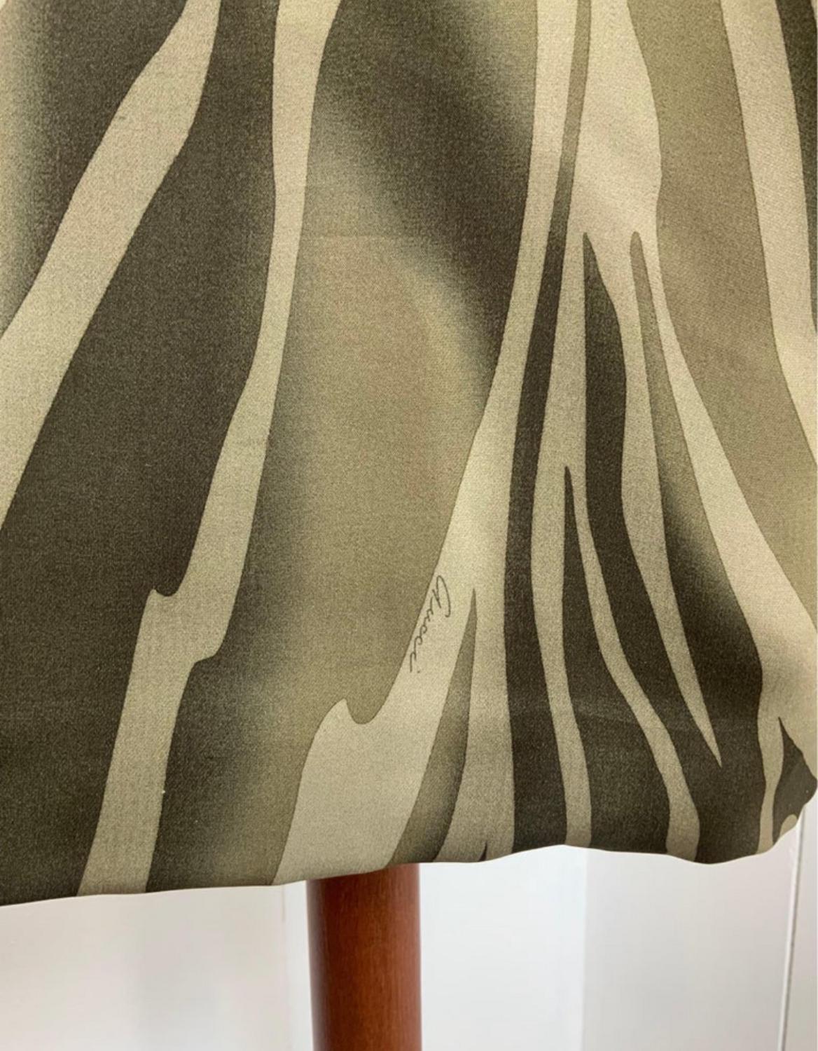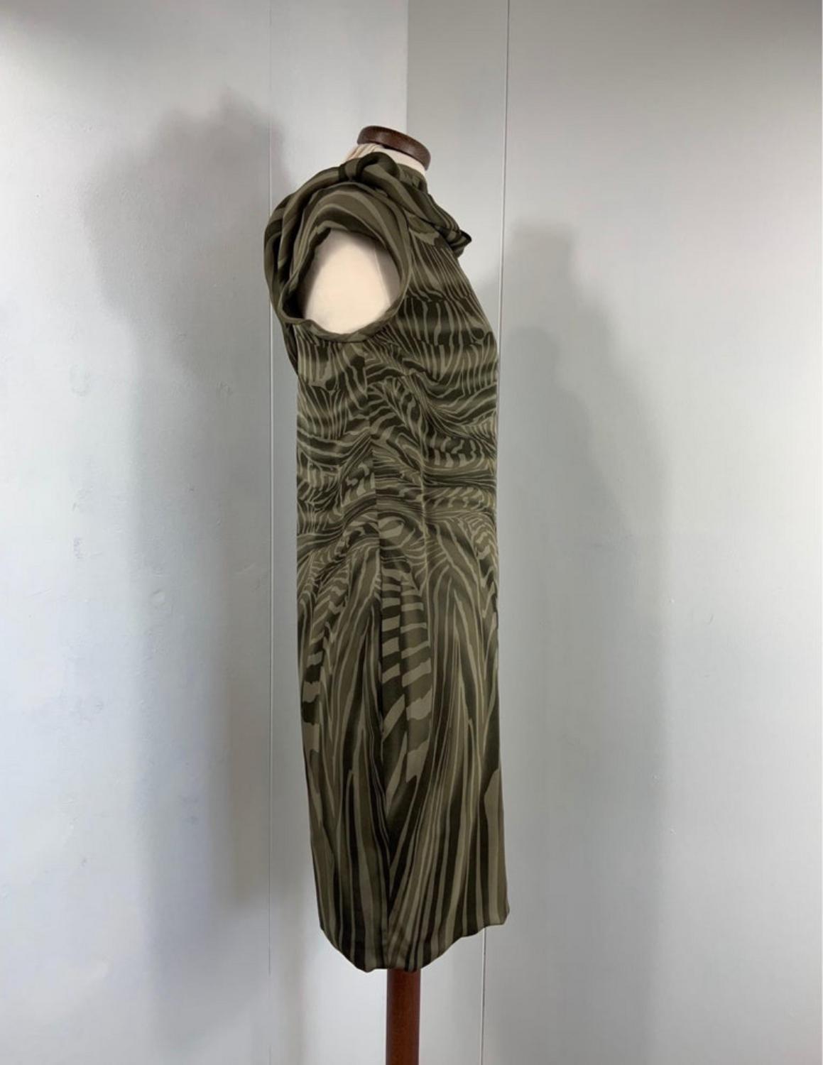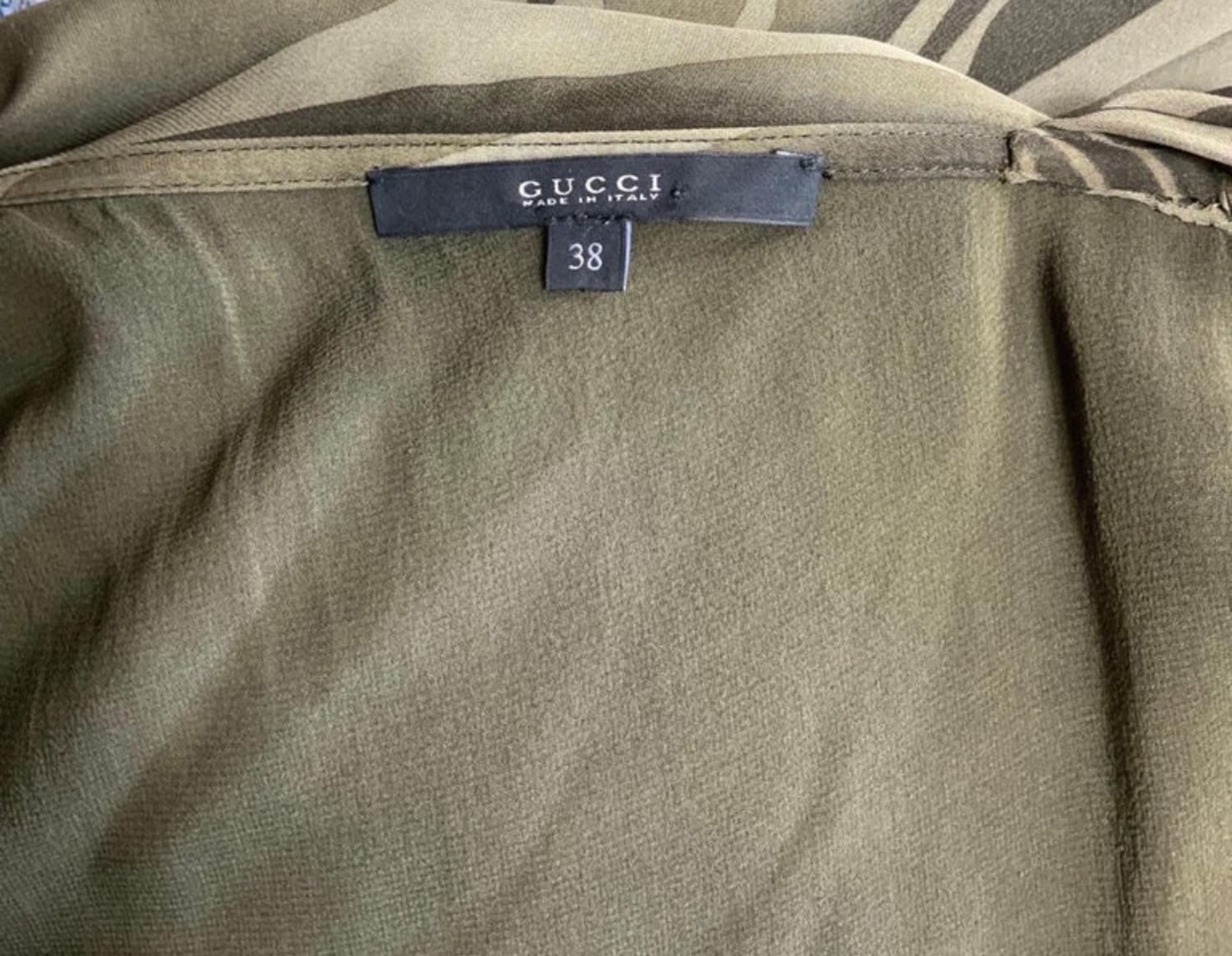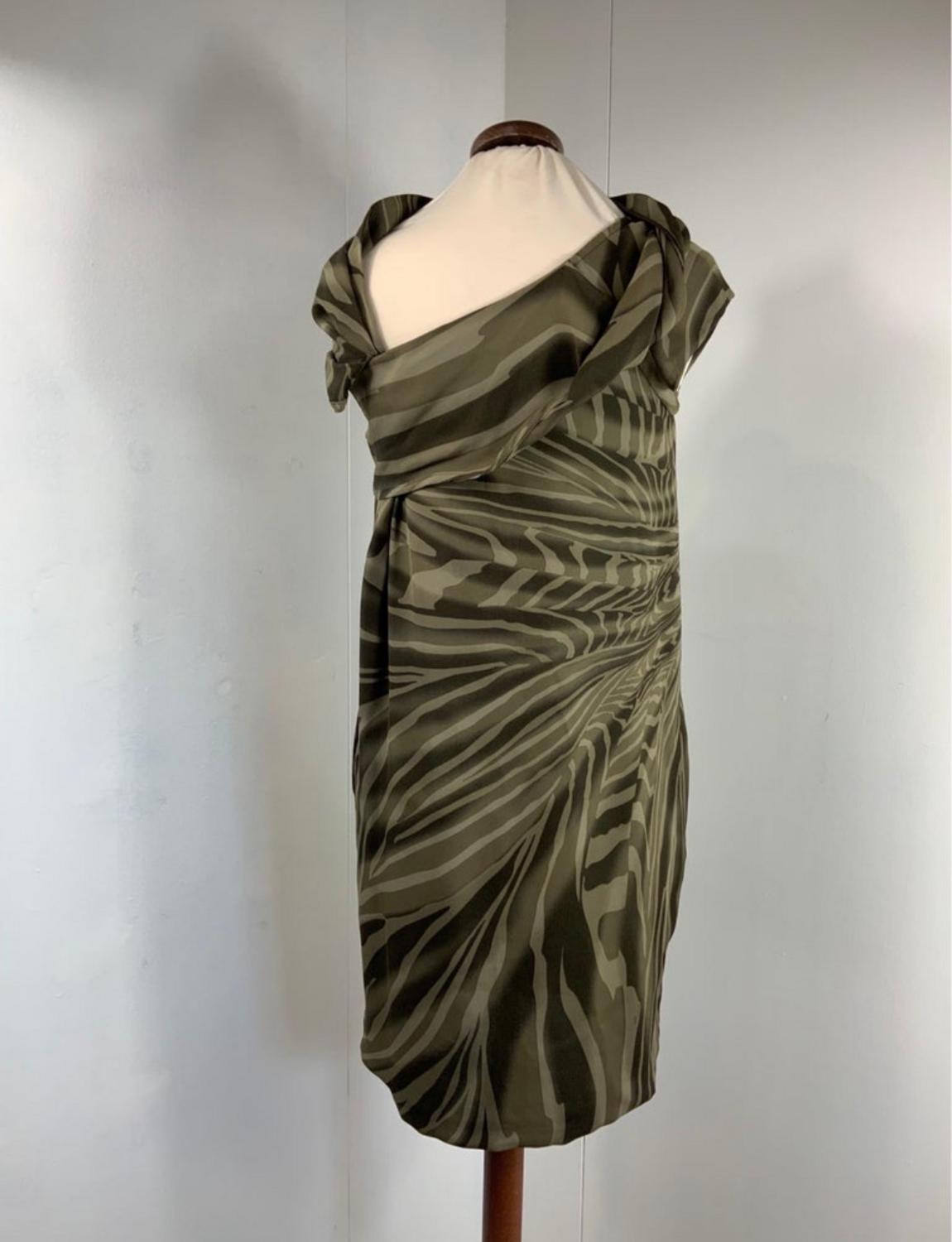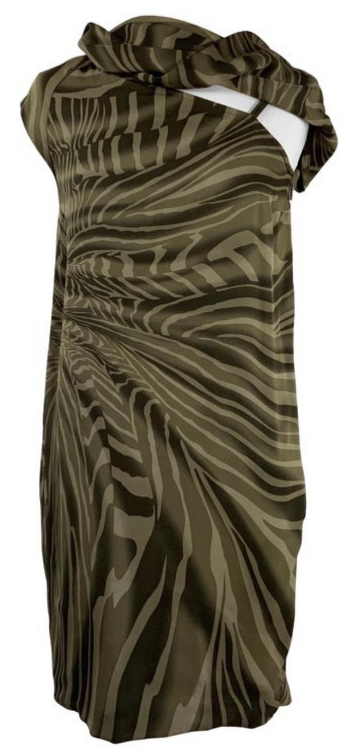 Abito zebrato Gucci by Tom Ford. Stile primi anni 2000. Abito asimmetrico in chiffon di seta con stampa zebrata verde oliva e kaki con dettagli in pelle e spalle scoperte. Chiusura con zip laterale e gancio. Taglia 38 italiana. Spalla 38 cm Busto 88 cm Lunghezza 88 cm In ottime condizioni, presenta piccoli segni di utilizzo e qualche filo tirato