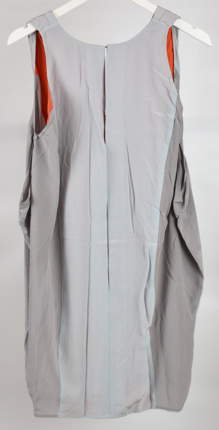 Abito a palloncino in seta grigio e blu con fodera interna a contrasto. Dettaglio cut-out nella parte frontale. Tglia XS. Prodotto in Cina. Qualche macchia. Ben conservato.