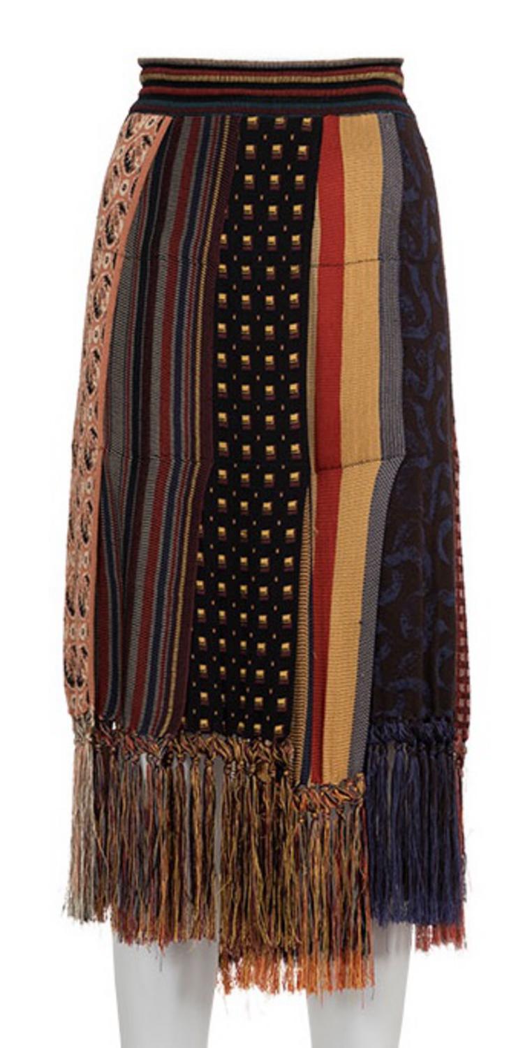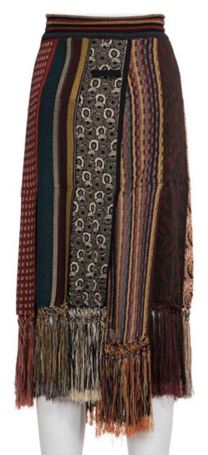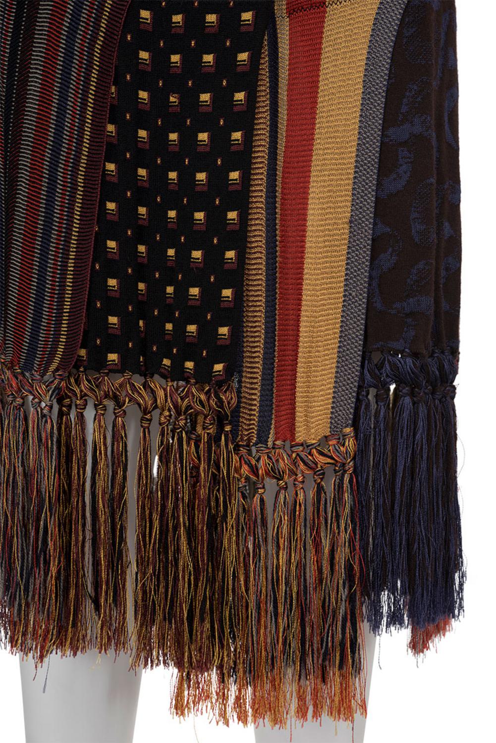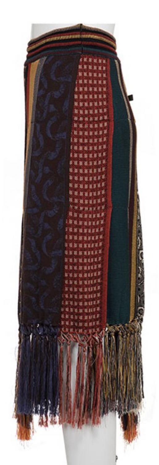 Iconic patchwork knitted jacquard paneled skirt with fringe trim from Fall Winter '02 collection. 100% wool. Size S. EXCELLENT CONDITION