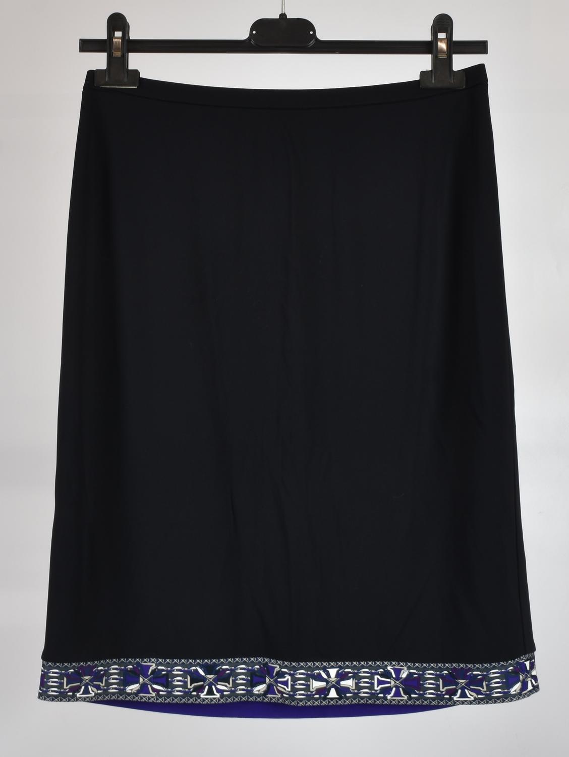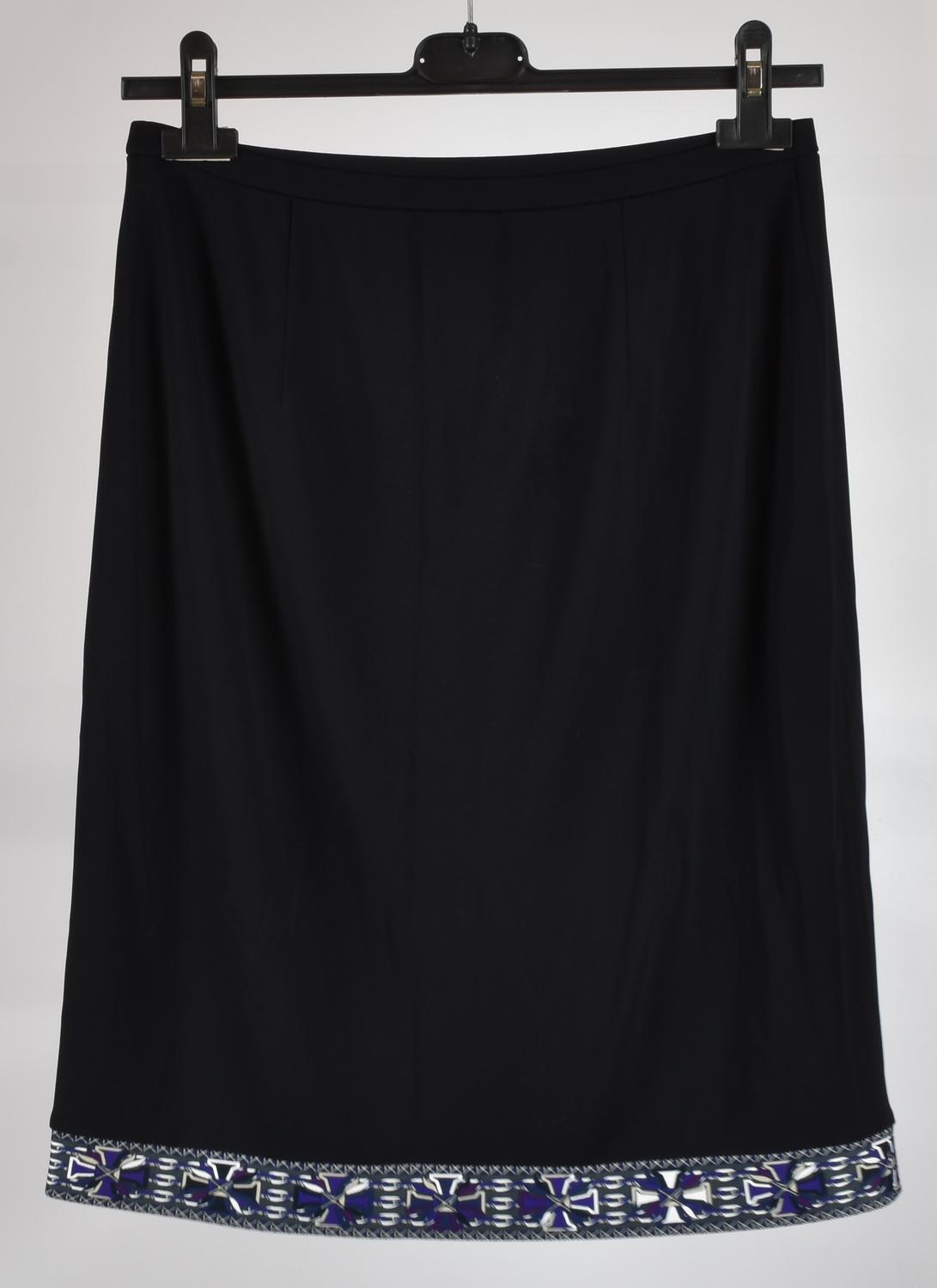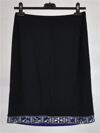 Gonna nera in viscosa elasticizzata con elastico in vita e banda decorata sull’orlo inferiore. Taglia 42 IT. Prodotta in Italia. Perfettamente conservata.