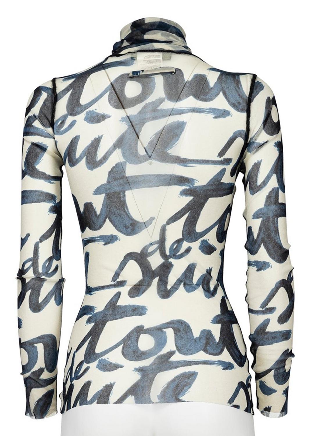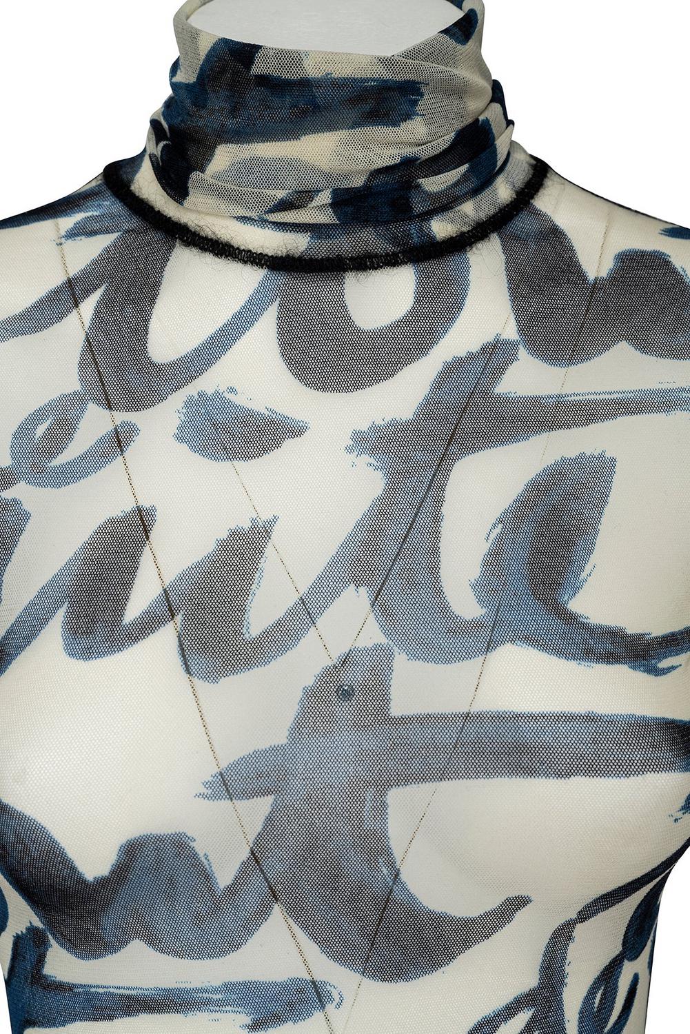 Iconic long sleeve turtleneck printed mesh sheer top with visible stitching from Fall Winter '01 collection. 100% nylon. Size XS. EXCELLENT CONDITION