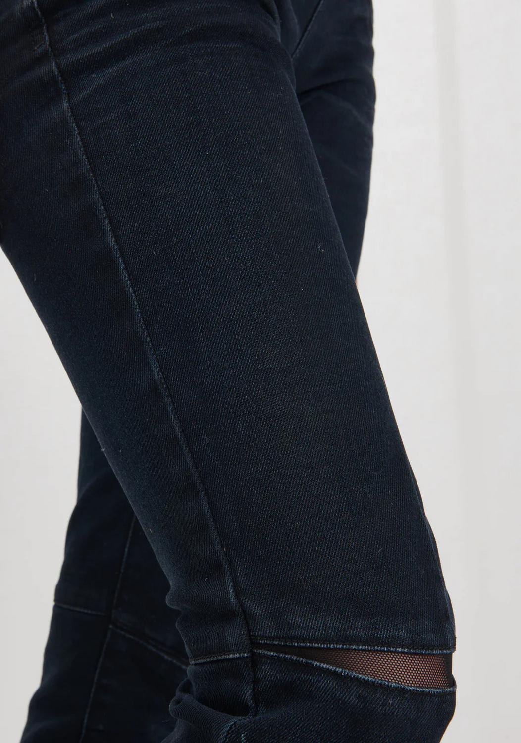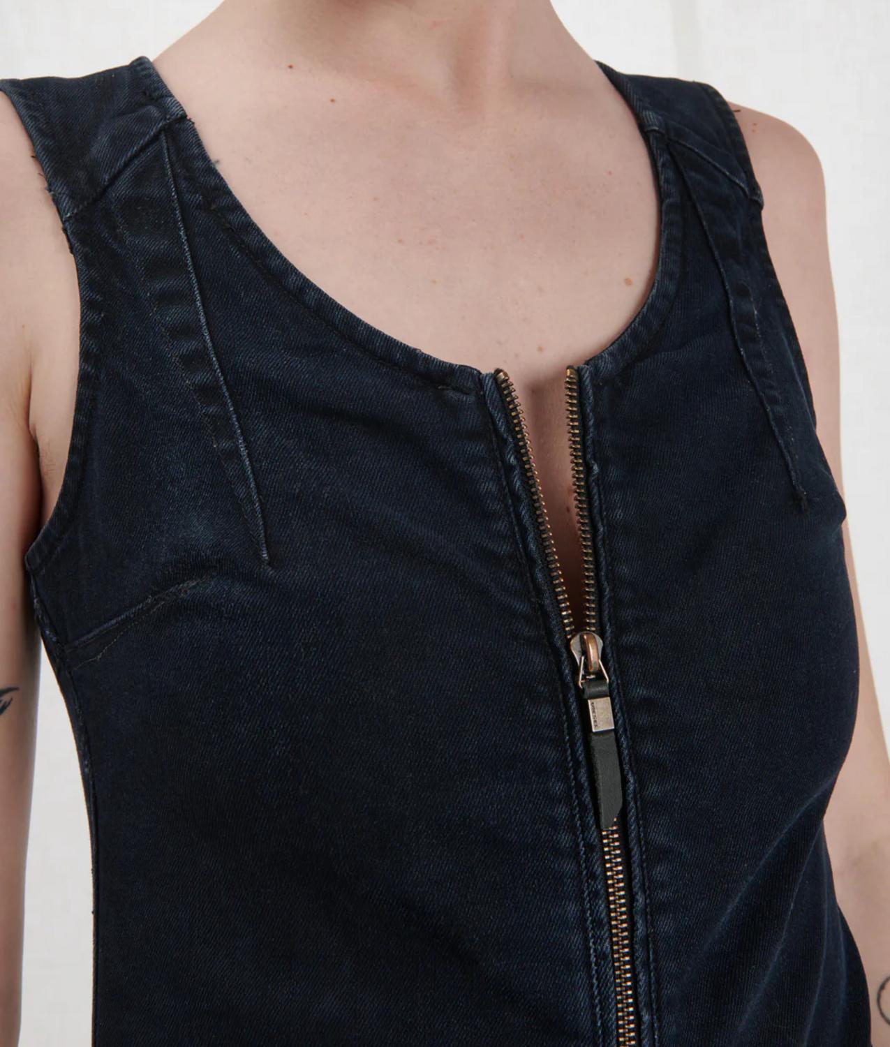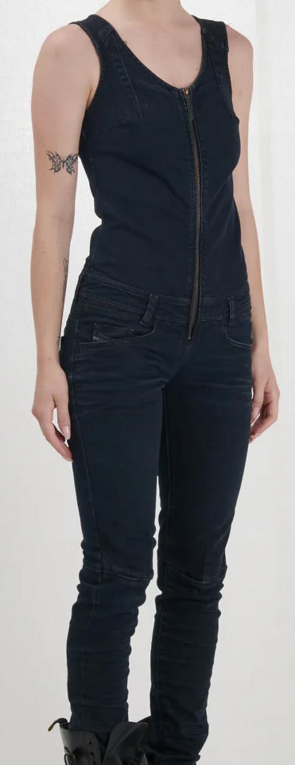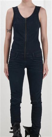 Salopette classica aderente smanicata in jeans. Primi anni 2000. Zip in metallo sul centro e dettagli neri trasparenti in tulle bielastico per consentire movimenti comodi sul retro e sul pantalone. Taglia etichetta: XS. Composizione: 100% denim. Made in Italy.