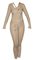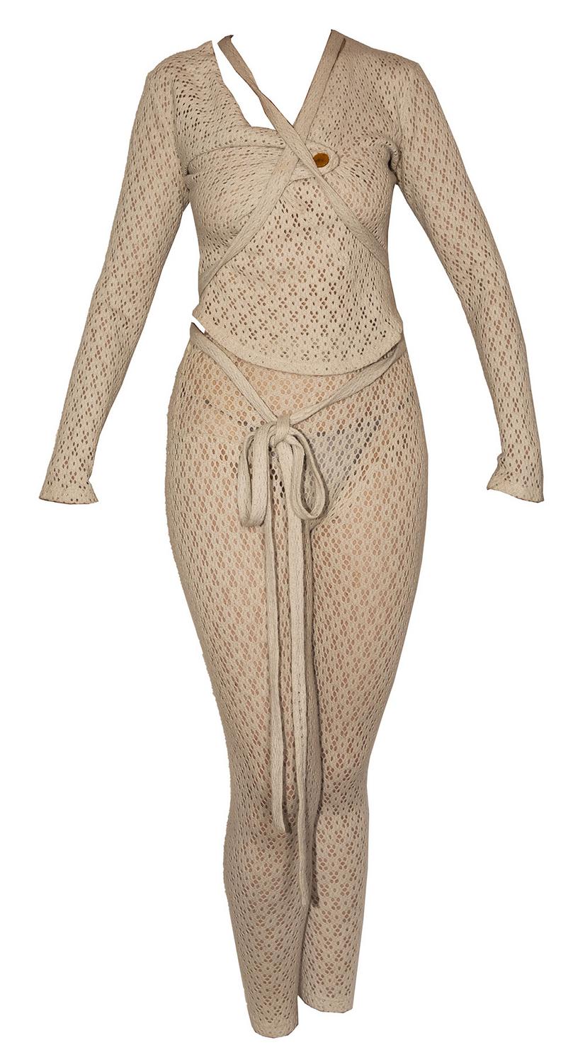 due pezzi per questo jumpsuit fatto di misto lana in lavorazione raschel. Leggings senza piede e t-shirt con stringhe bondage color bianco naturale. Tg M. Made in Italy. Primi anni ’90. Perfettamente conservato