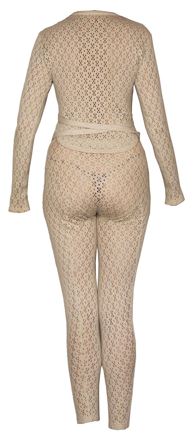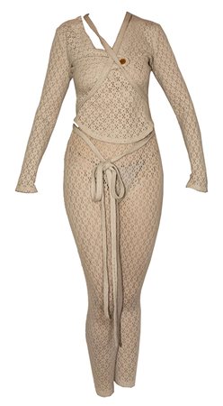 two pieces for this jumpsuit made of raschel knit wool blend. Footless leggings and t-shirt with natural white bondage strings. Tg M. Made in Italy. Early 90s. Perfectly preserved