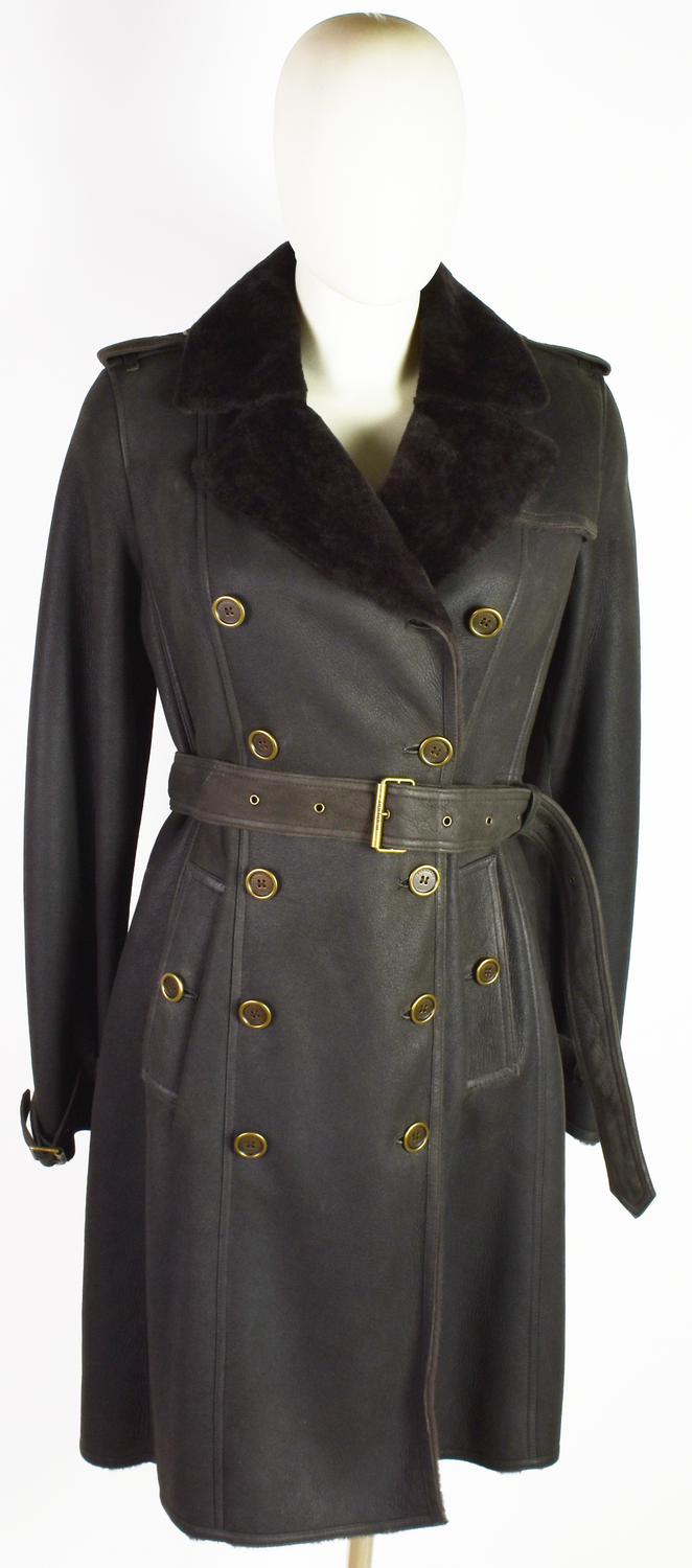 Cappotto doppiopetto da donna in pelle d'agnello. Presenta cintura in vita, due cinturini decorativi sulle maniche e bottoni in metallo con inciso il nome della Maison. Tasche a filetto. Taglia 42 IT. Proposto con copriabiti in plastica originale Burberry. Prodotto in Turchia. Eccellente, ancora con cartellino.