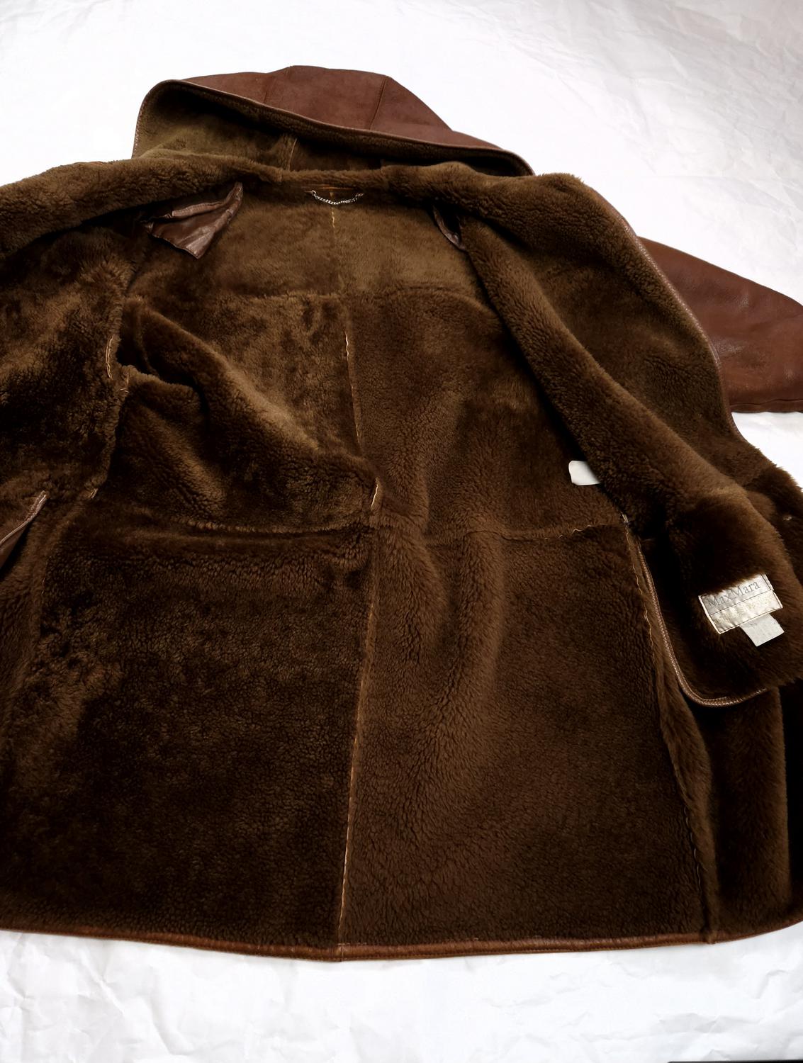 Hooded Shearling Coat Original Max Mara Vintage. The size label is not legible, but it fits like an L/XL. Shows signs of wear. DISCREETLY PRESERVED