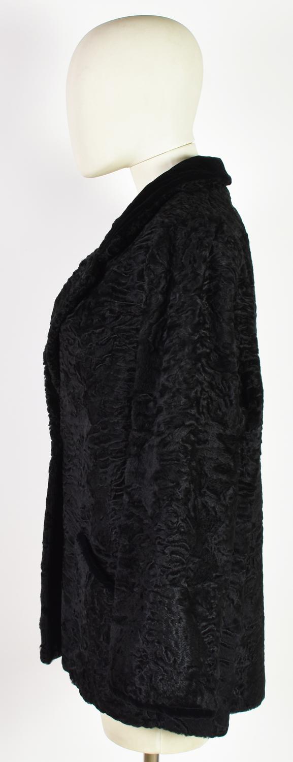 Pelliccia di Astrakan con particolari in velluto nero, lavorazione artigianale. Lunghezza cm 73, diametro cm 114. Pellicceria Sorari, Milano. Ben conservata.