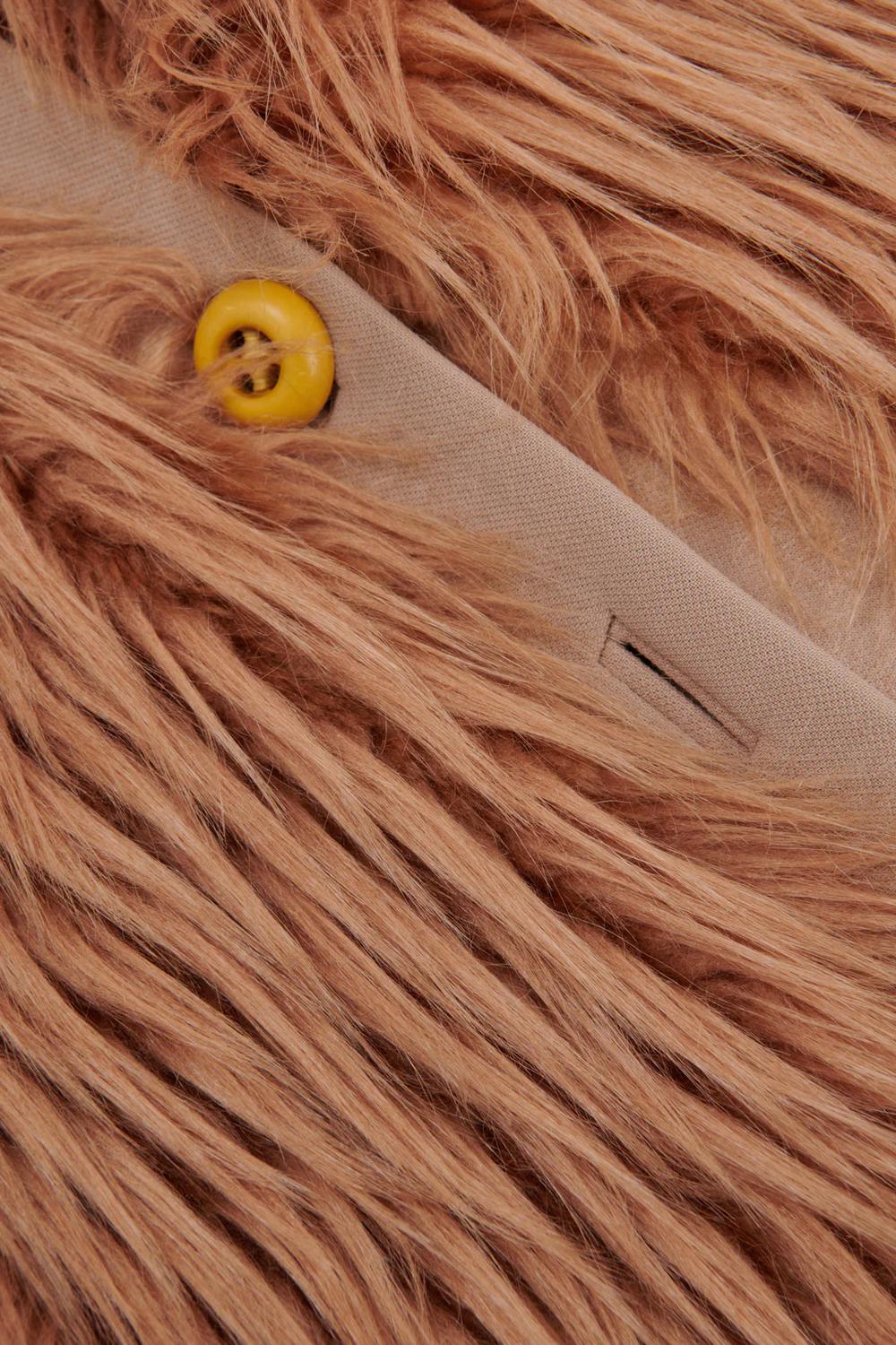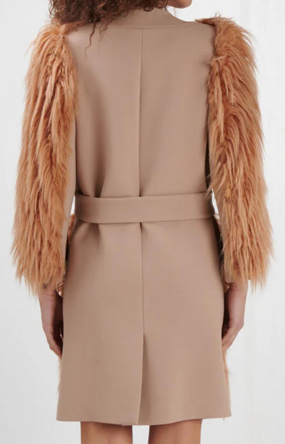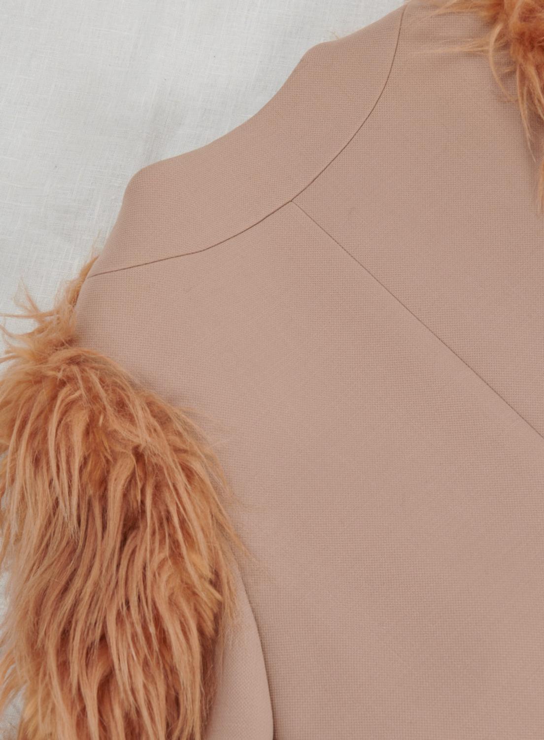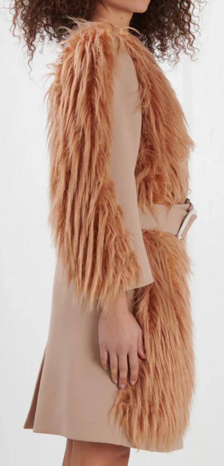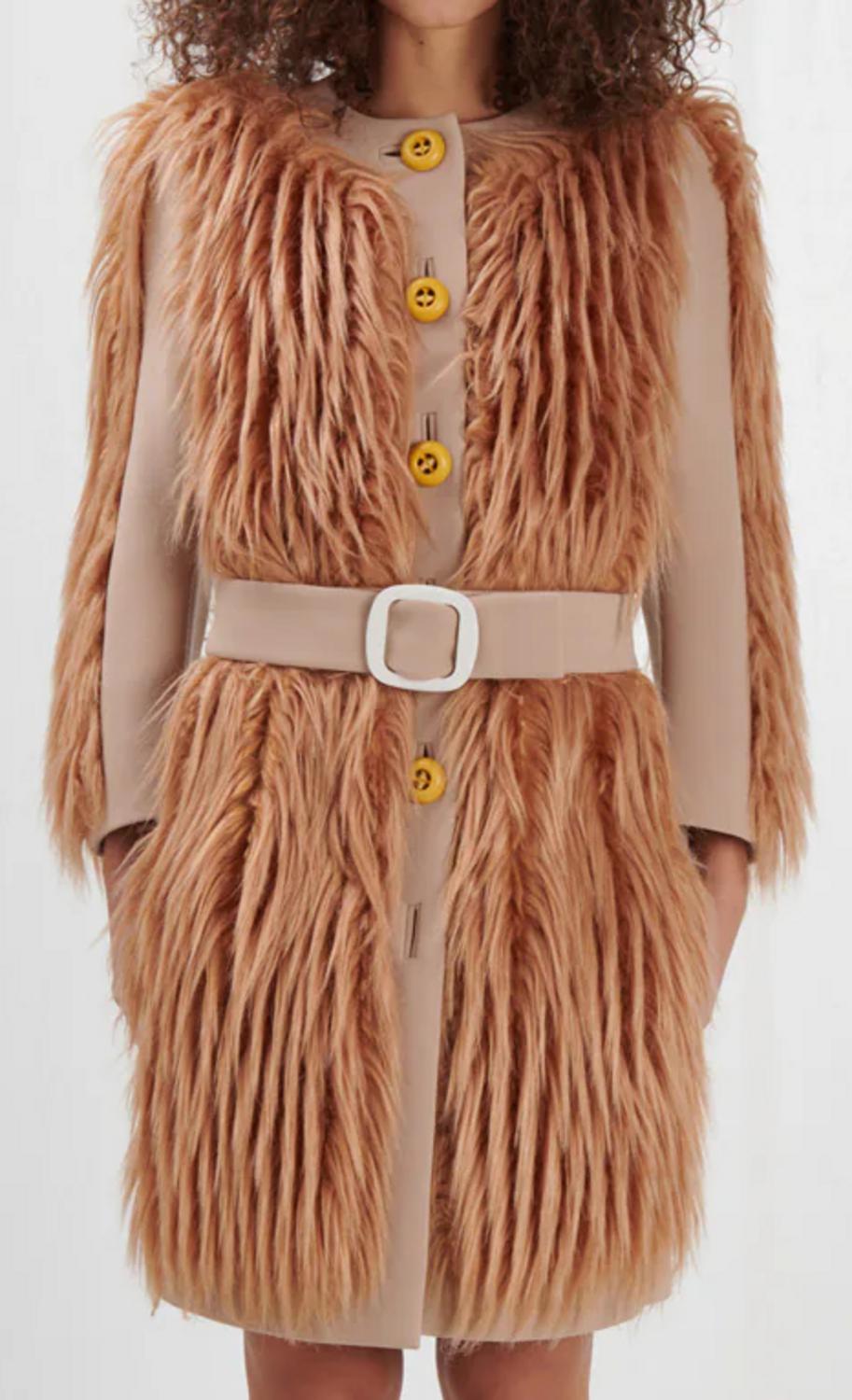 Cappotto color cipria in lana con inserti in finto pelo color salmone su corpino e maniche. Cintura alta con fibbia bianca logata, bottoni decorativi senape, asole a doppio filetto. Da iconica sfilata A/W 2011-2012. Taglia etichetta: 40. Composizione: Davanti e maniche: 59% acrilica, 27% modacrilica, 9% cotone, 3% poliestere, 3% viscosa. Dietro, maniche, collo e bordi: 100% lana vergine. Fodera: 100% viscosa. Interfodera: 100% polietilenica. Made in Italy.