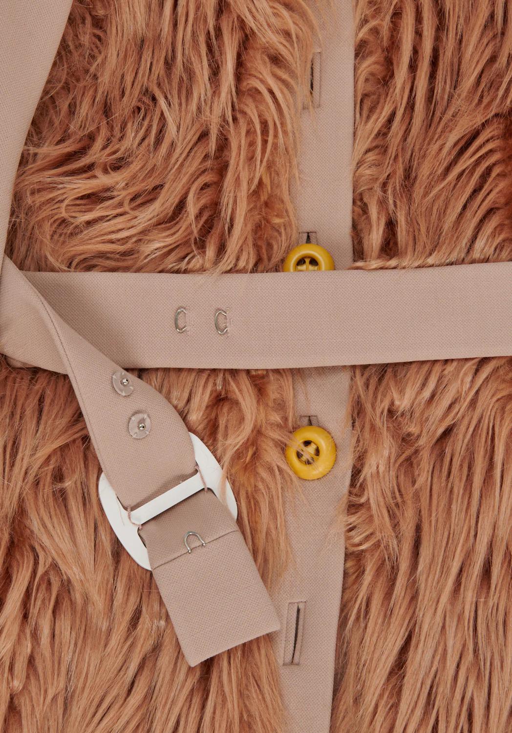 Powder-colored wool coat with salmon-colored faux fur inserts on the bodice and sleeves. High belt with white logo buckle, mustard decorative buttons, double welt buttonholes. From the iconic A/W 2011-2012 fashion show. Label size: 40. Composition: Front and sleeves: 59% acrylic, 27% modacrylic, 9% cotton, 3% polyester, 3% viscose. Back, sleeves, collar and edges: 100% virgin wool. Lining: 100% viscose. Interlining: 100% polyethylene. Made in Italy.