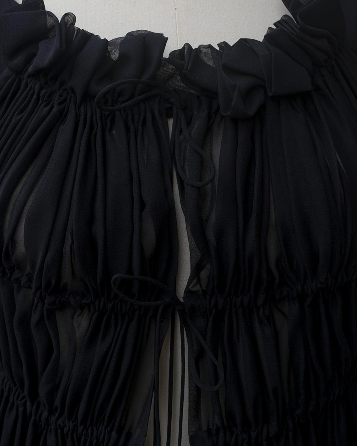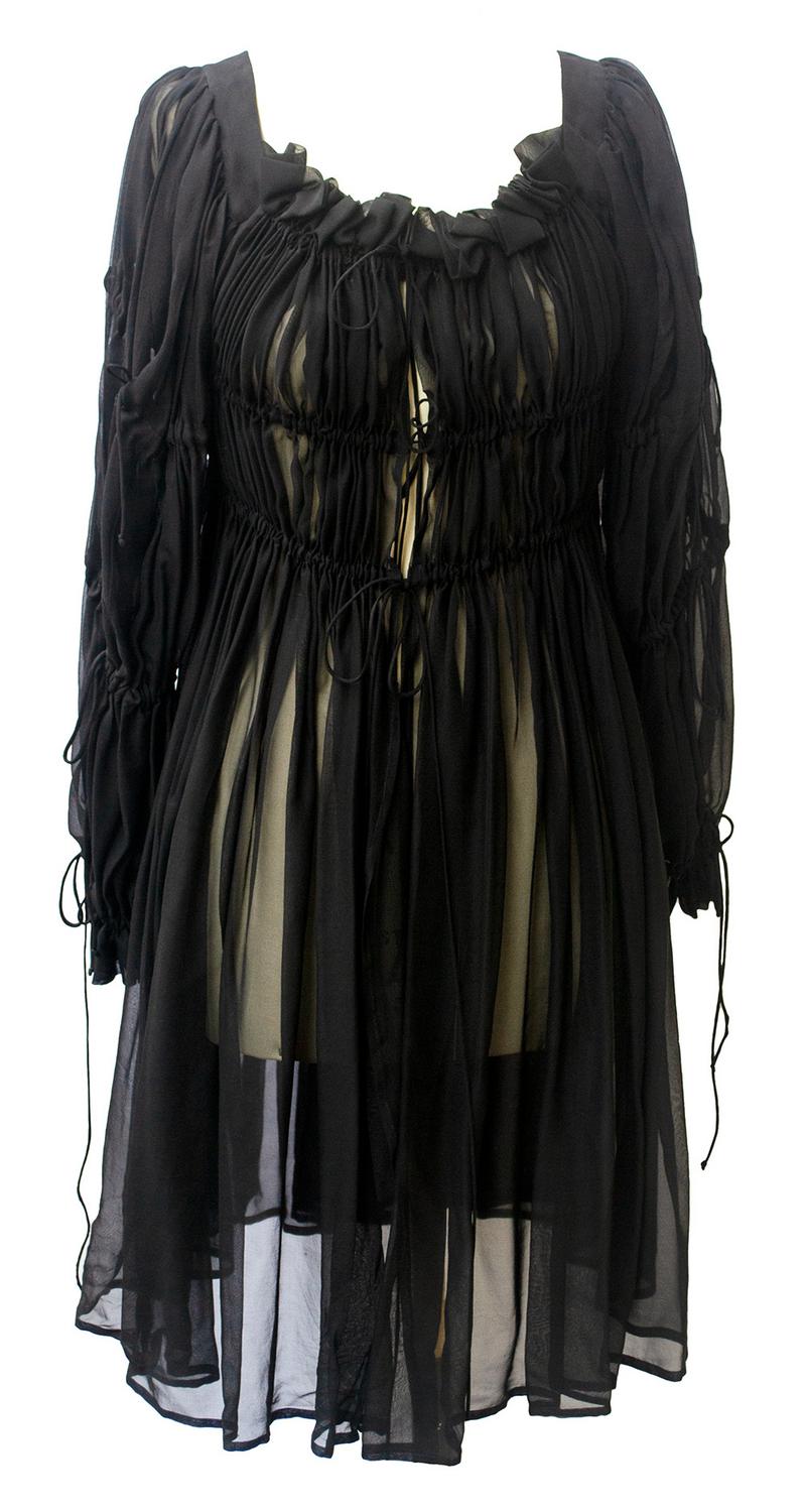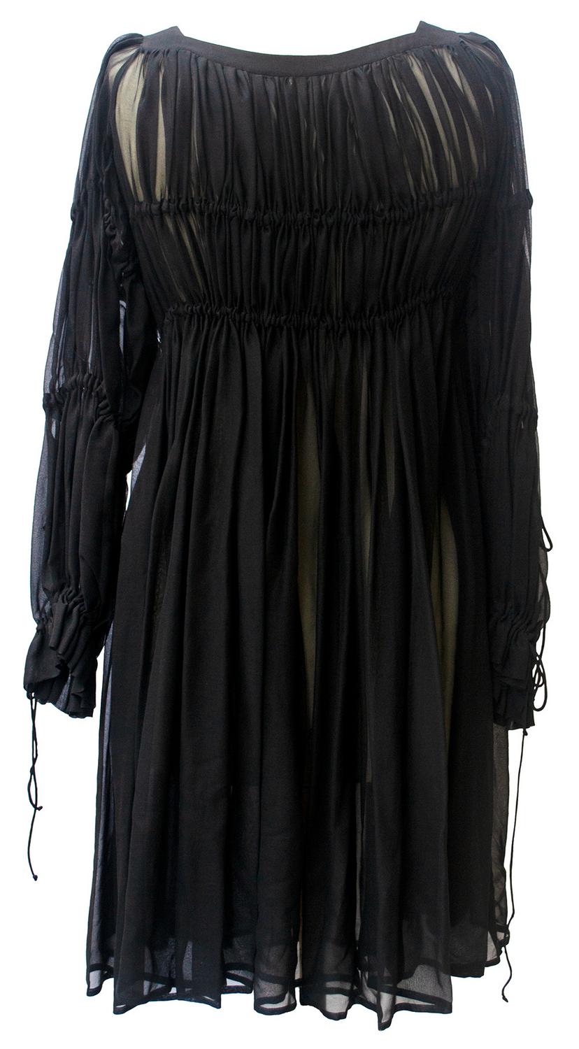 Blouse dress in black silk organdy.The width of the sleeves and of the body is adjusted through the drawstring fastening. Uk size 10. Made in England in the mid 90s. Excellent condition.