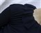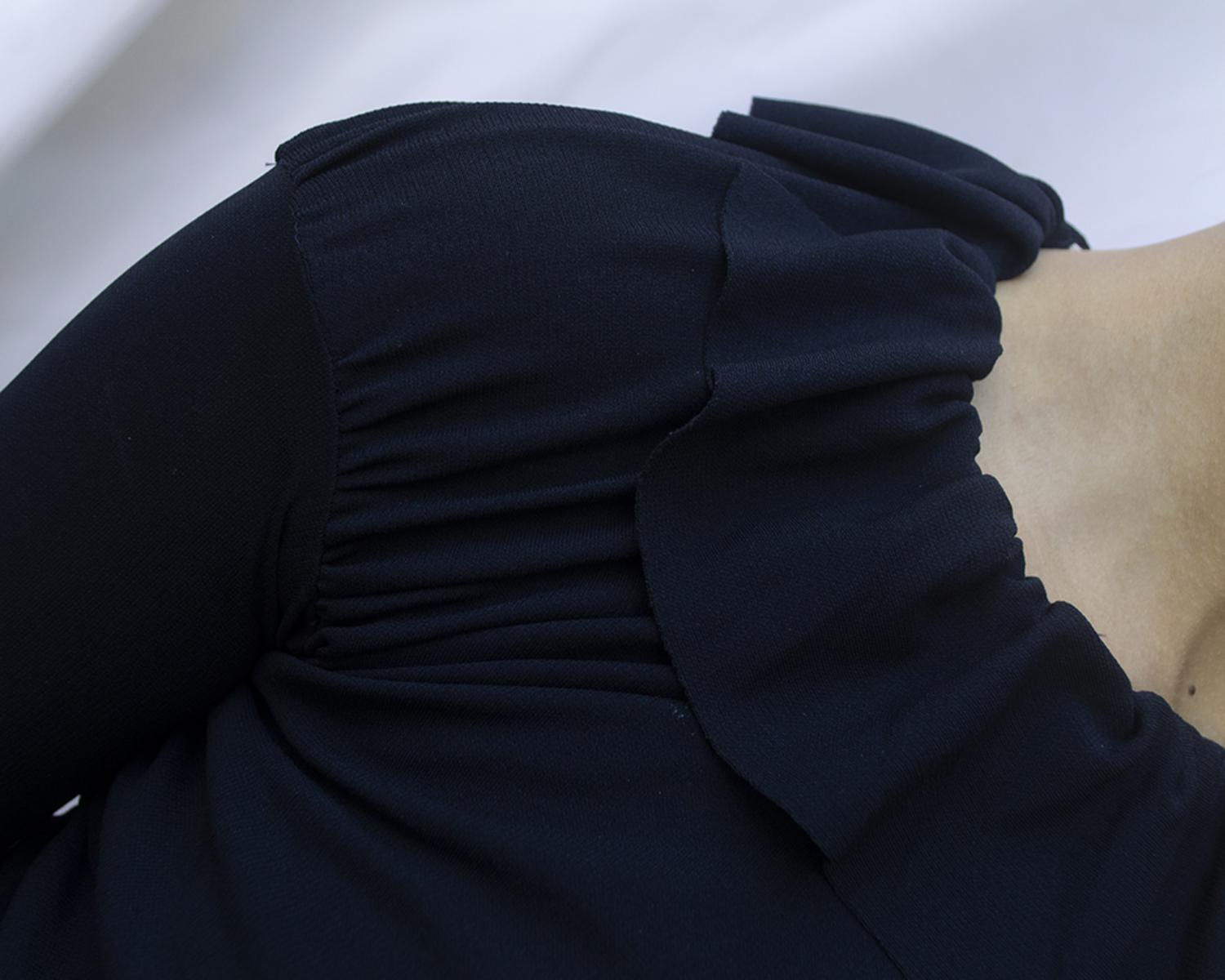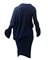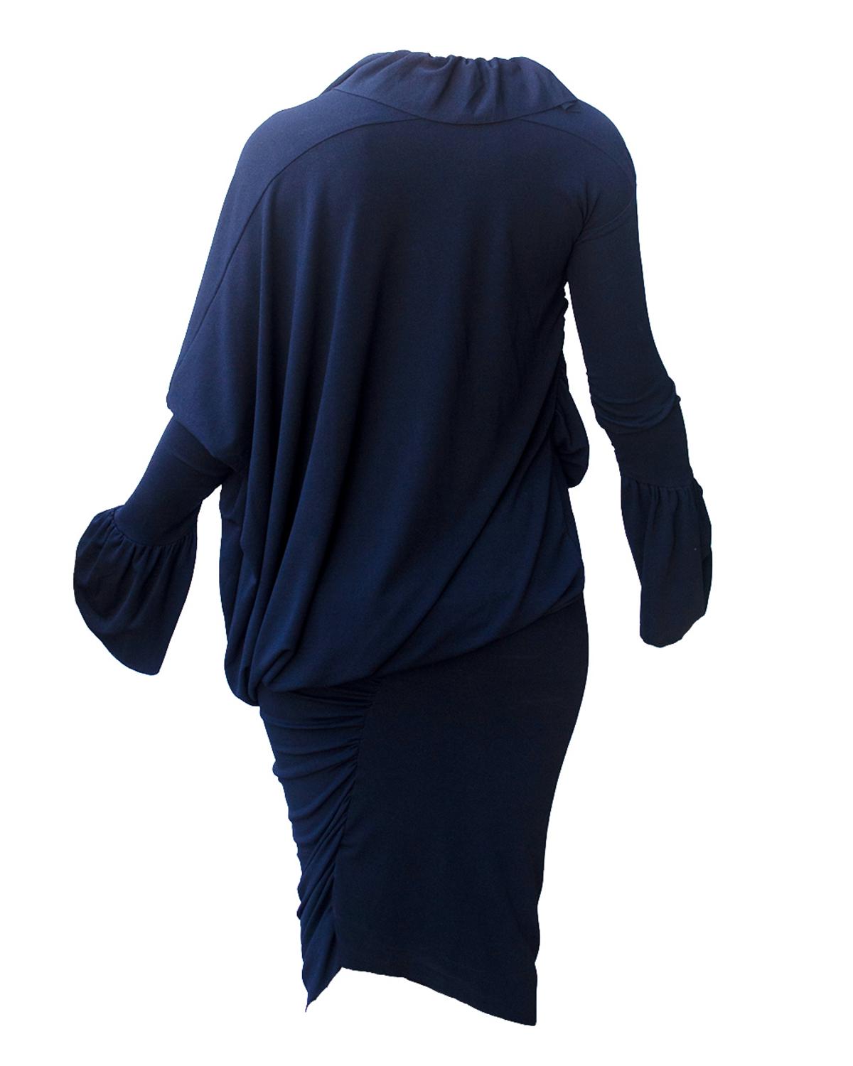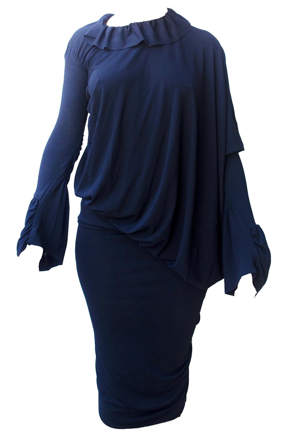 stretch crepe jersey for this cocktail dress in dark blue colour. Gathered collar and cuff for an asymmetrical and draped body sustained by a tight band skirt on the lower part to emphasize even more all the volume. Raw edges for hem collar and sleeves. Made in England in the early 90s. Size Uk 10. Perfectly preserved.