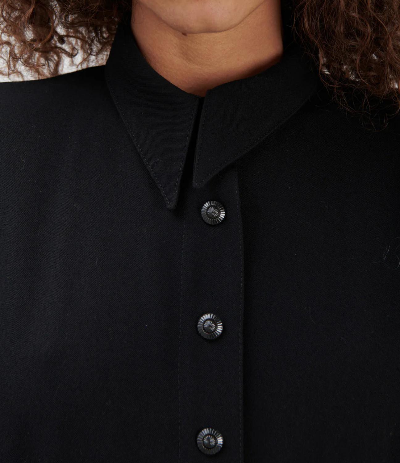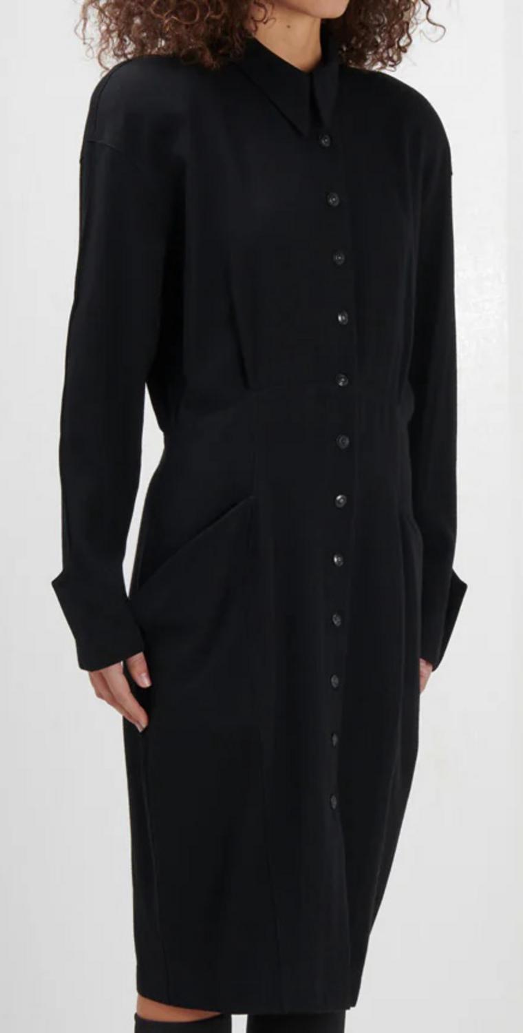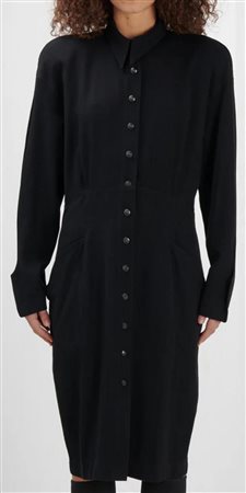Abito scamiciato nero sagomato con bottoni automatici grigio antracite. Spalla con spallina, giromanica abbassato, manica regolare decorata al fondo. Gonna a tubino con lunghezza al ginocchio. Etichetta non presente