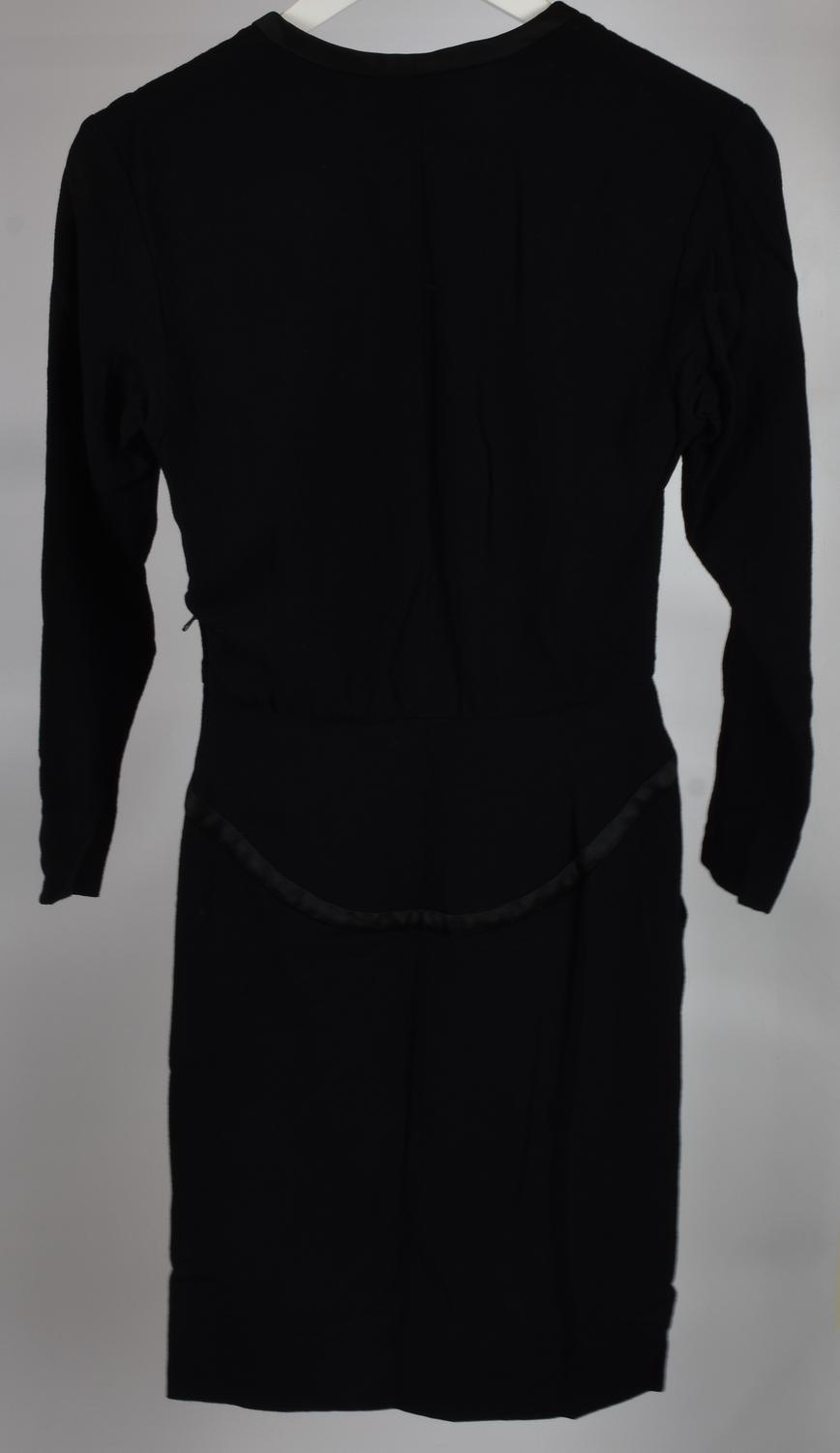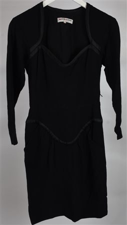 Abito nero con manica a tre quarti e due tasche frontali. Cerniera laterale. Taglia 38. Manca etichetta di composizione. Prodotto in Francia. Lievissimi segni del tempo non compromettono le eccellenti condizioni generali. Perfettamente conservato.