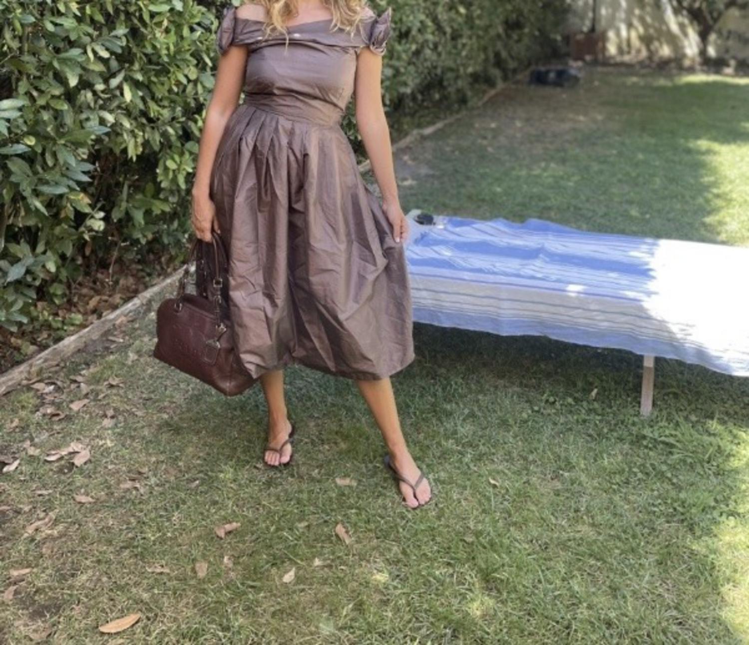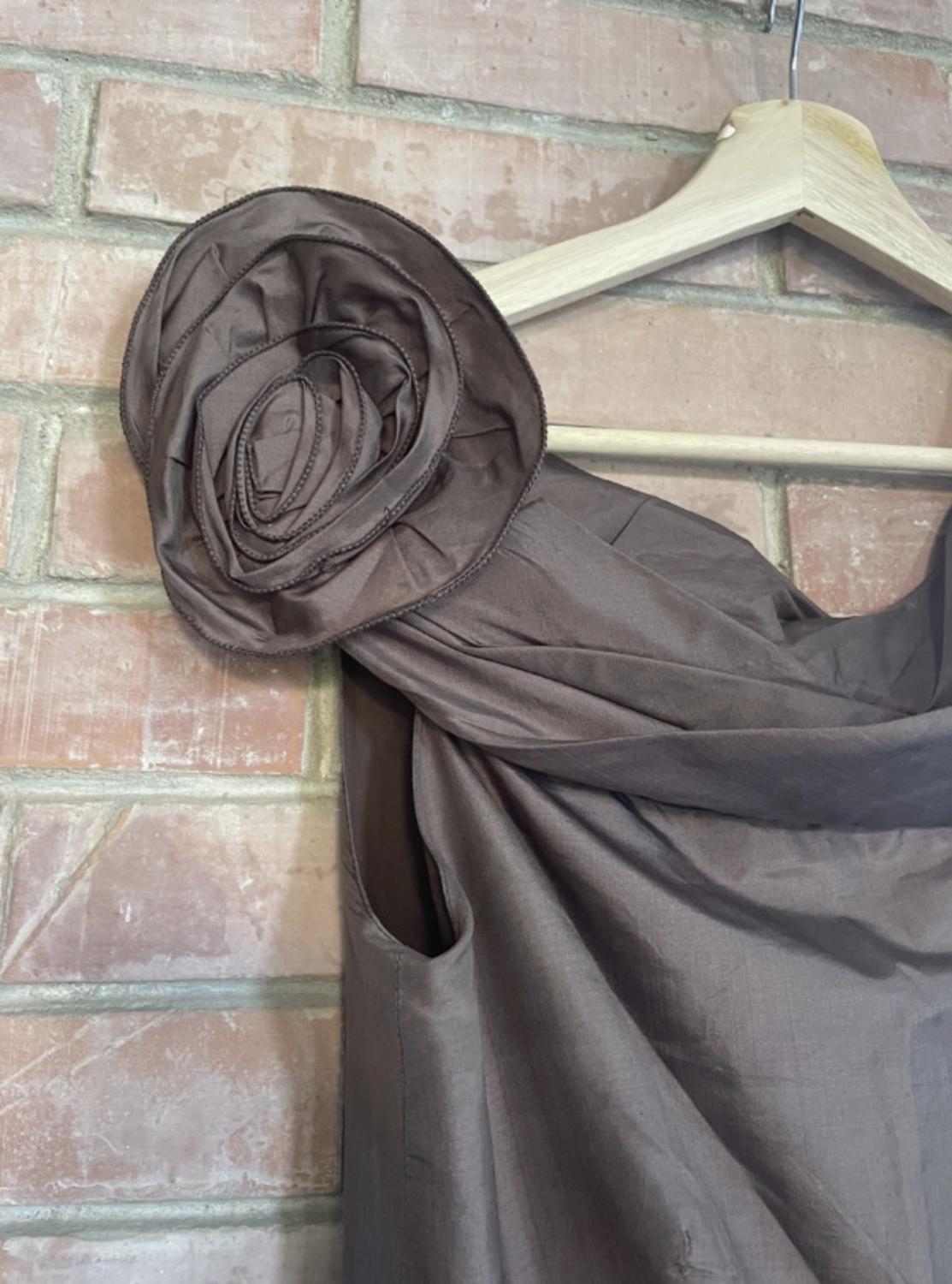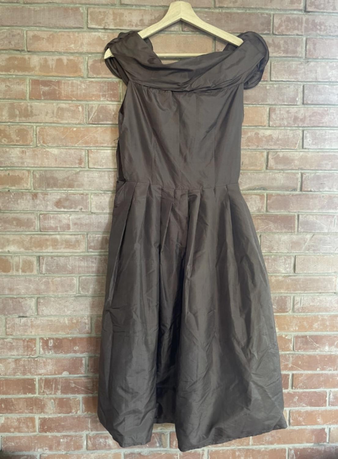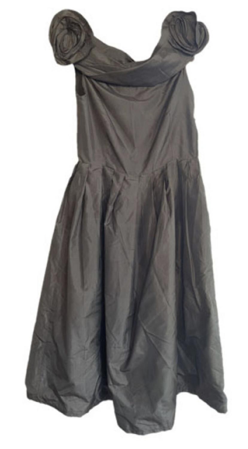 Abito Blumarine Folies in 100% seta modello simil anni 50, scollo a barchetta e fiori sulle spalle. Chiusura laterale con zip e bottoncino. Taglia indicata 44 ma veste più piccolo. Presenta qualche segno di utilizzo.