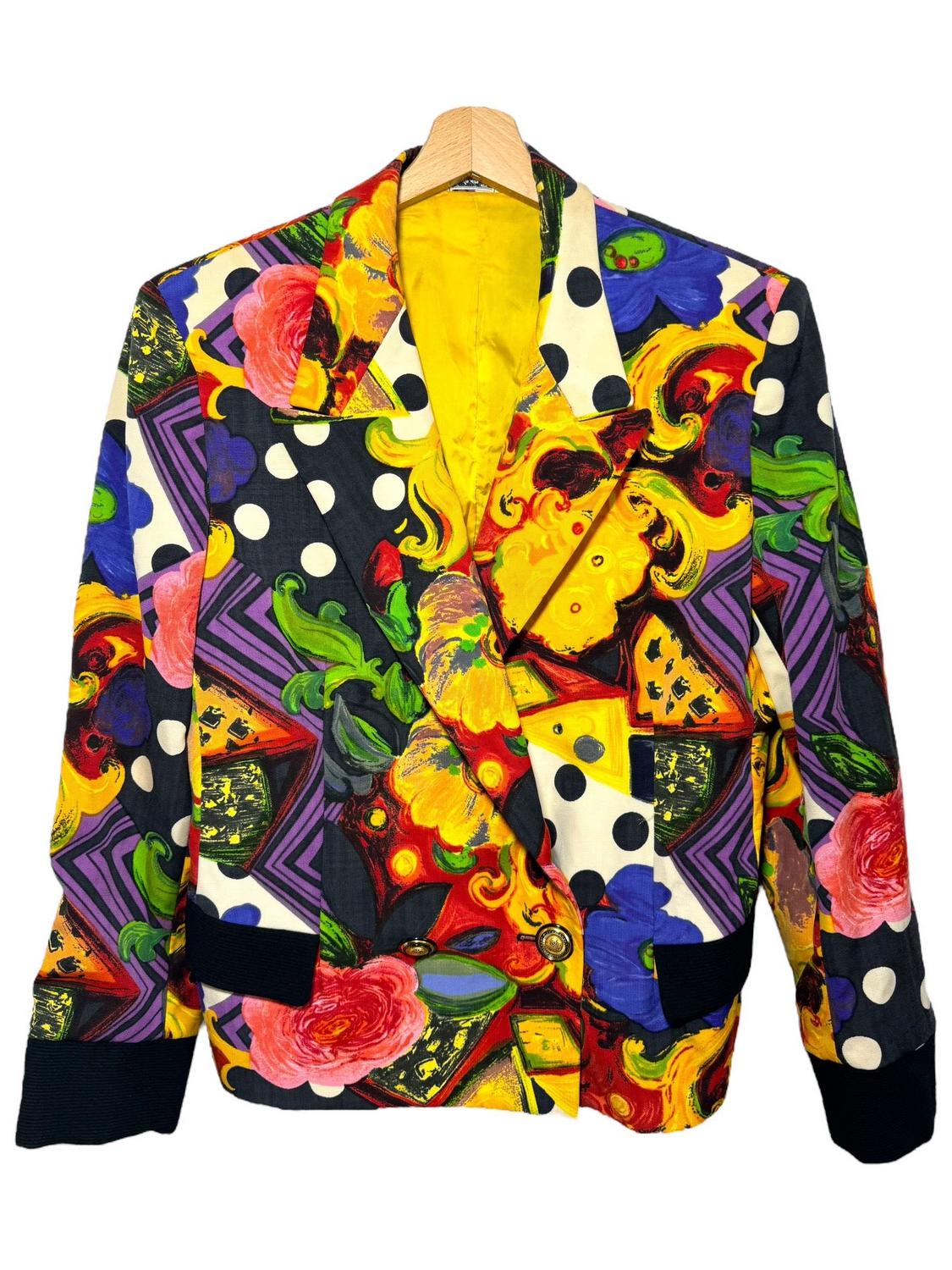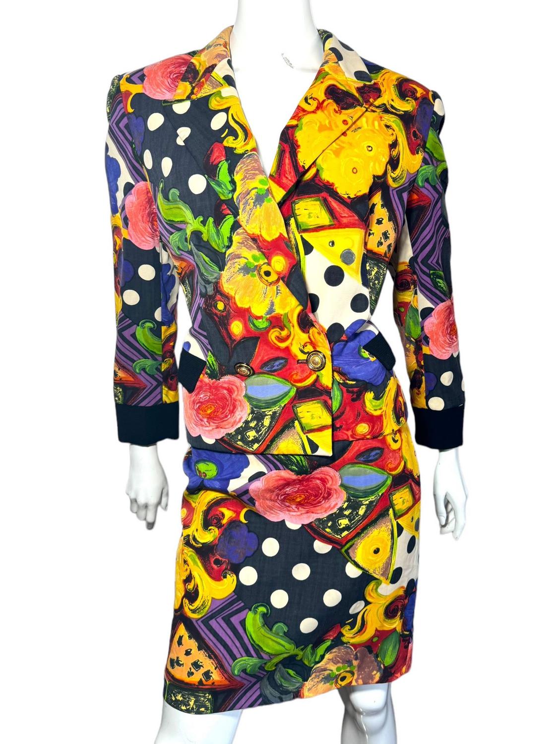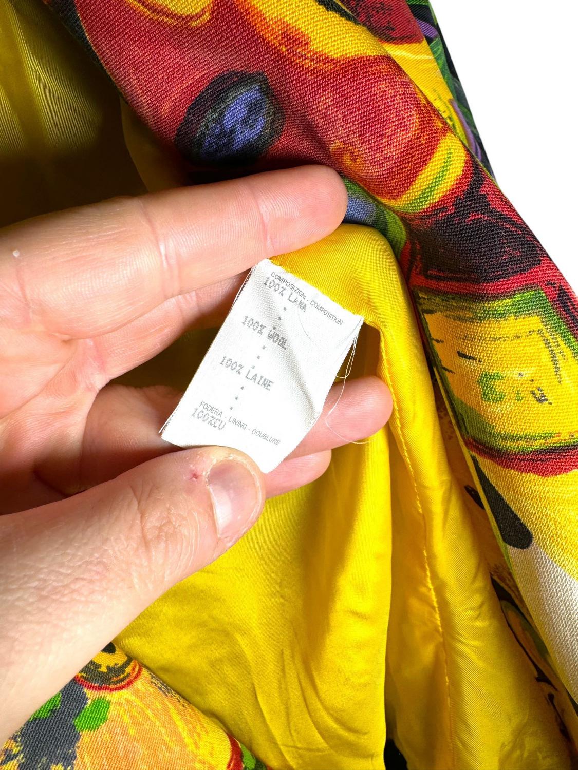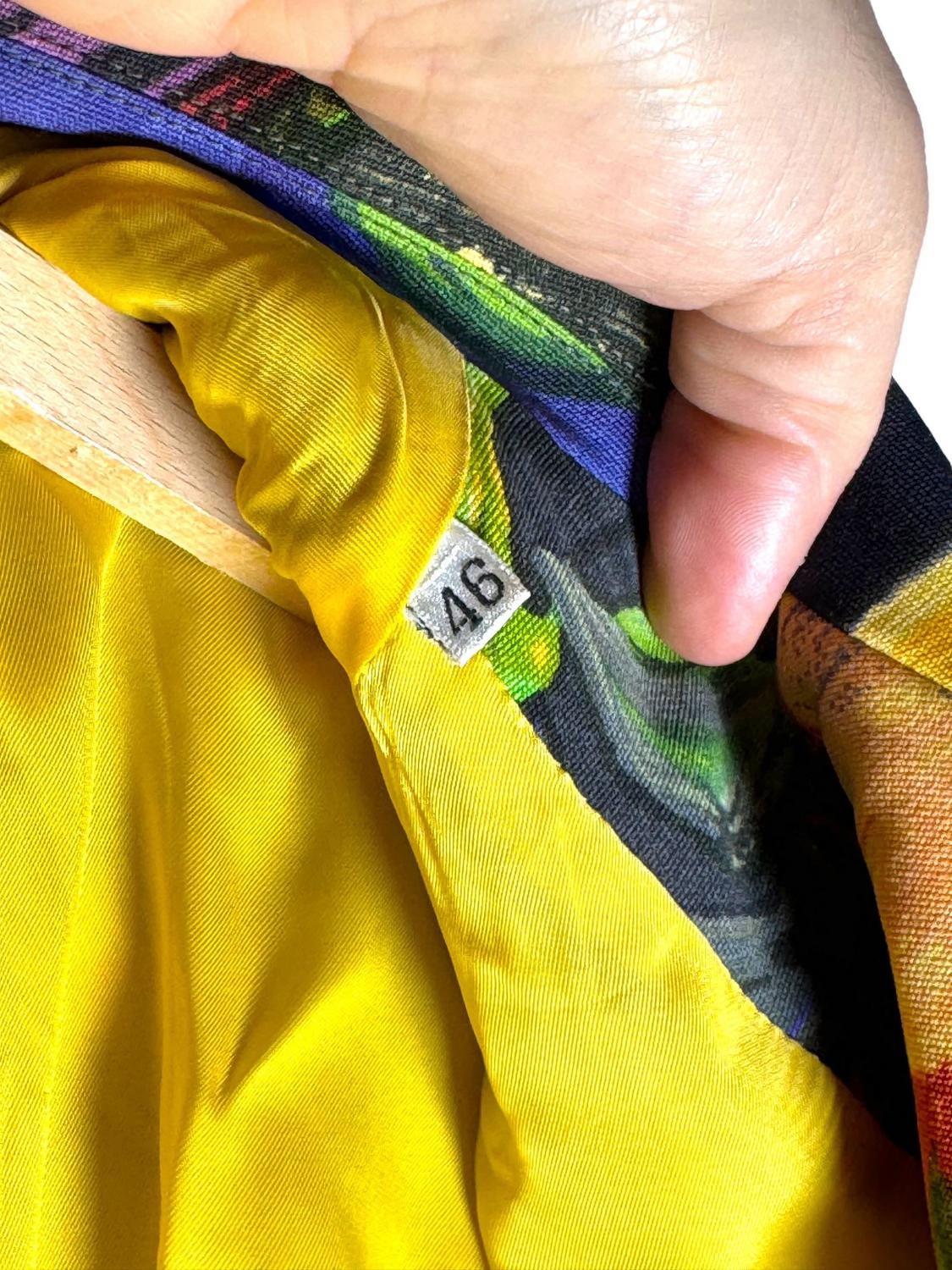 Composto da giacca a doppiopetto con bottoni gioiello e gonna. Ha una leggera macchiolina sul davanti, impercettibile, vedi ultima foto. Stampa su tessuto 100% lana. Vintage anni 90s.