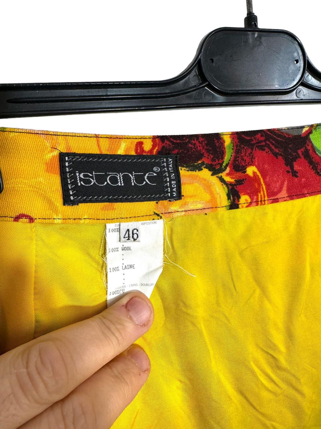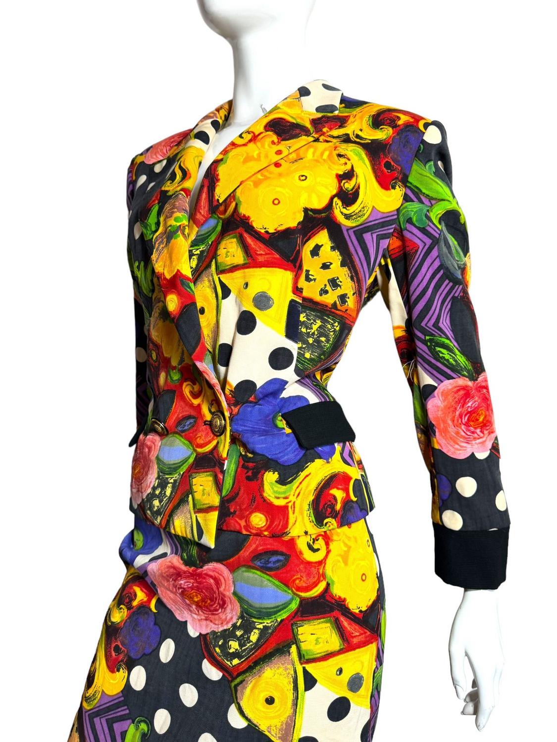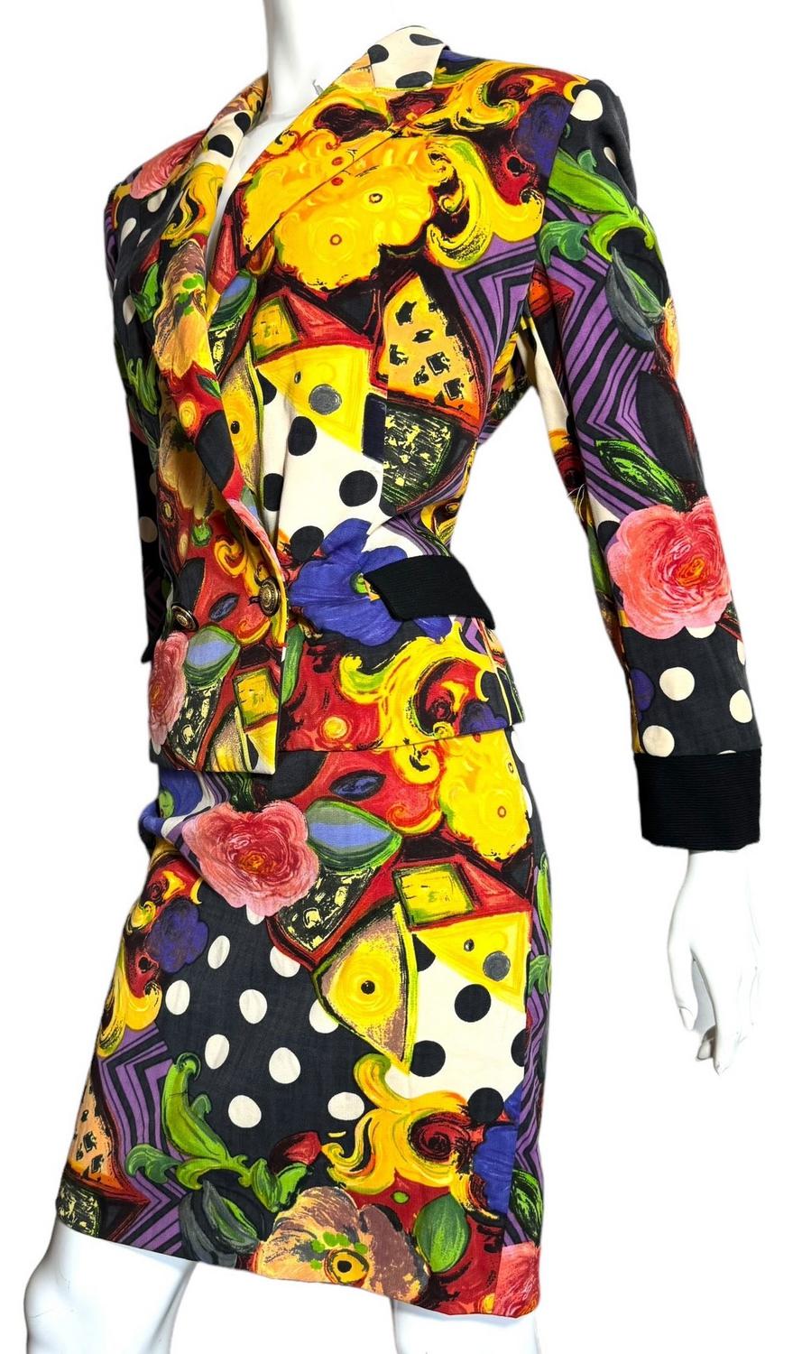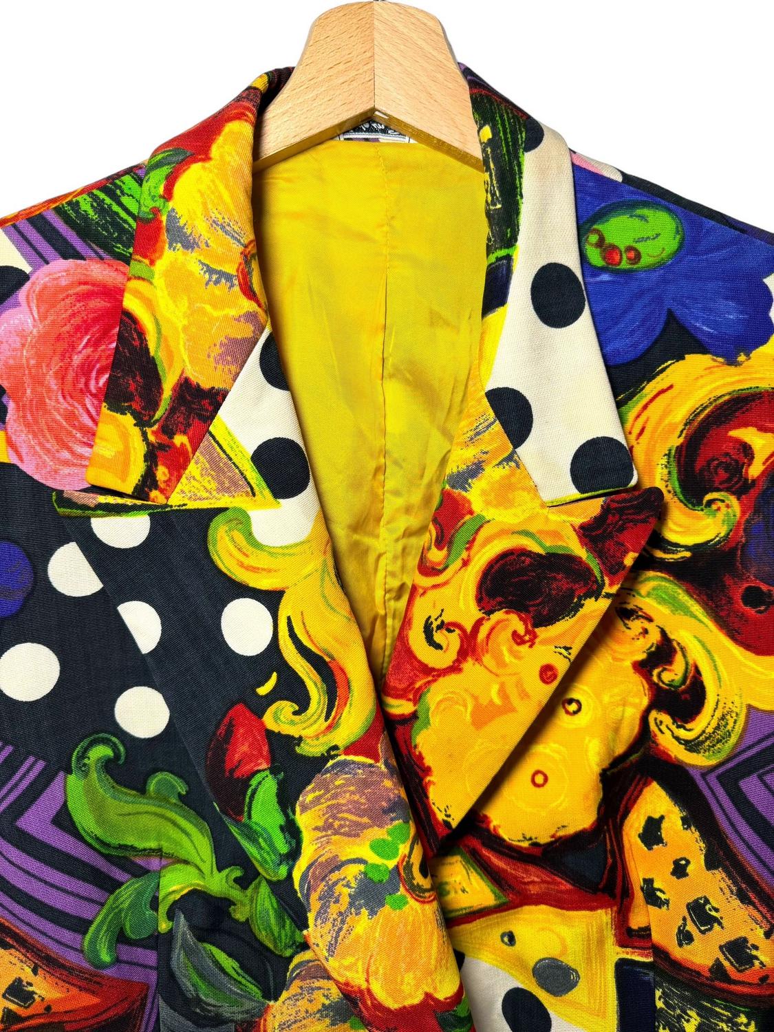 Composto da giacca a doppiopetto con bottoni gioiello e gonna. Ha una leggera macchiolina sul davanti, impercettibile, vedi ultima foto. Stampa su tessuto 100% lana. Vintage anni 90s.
