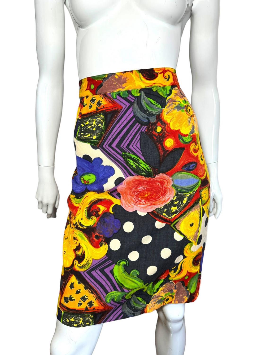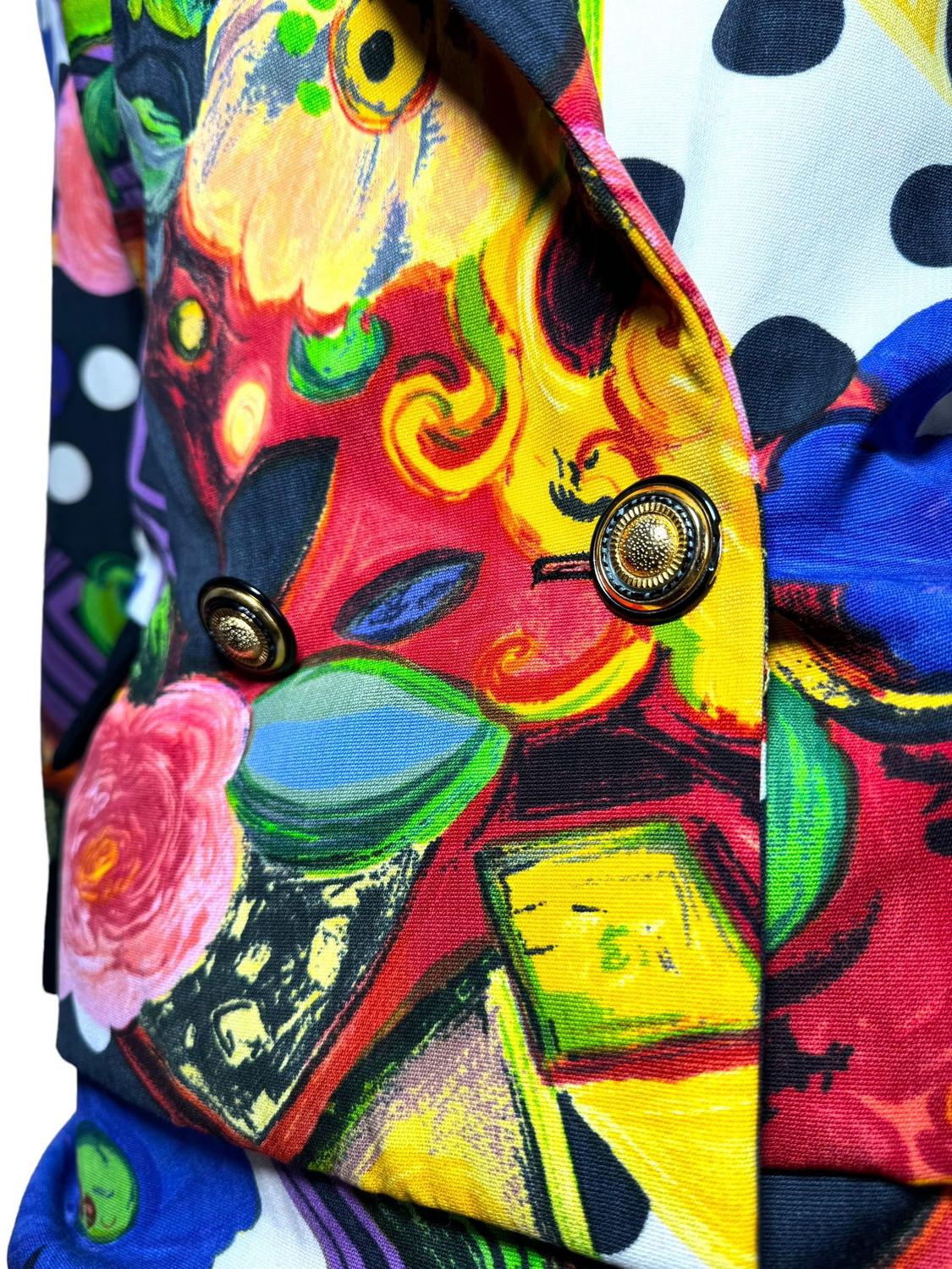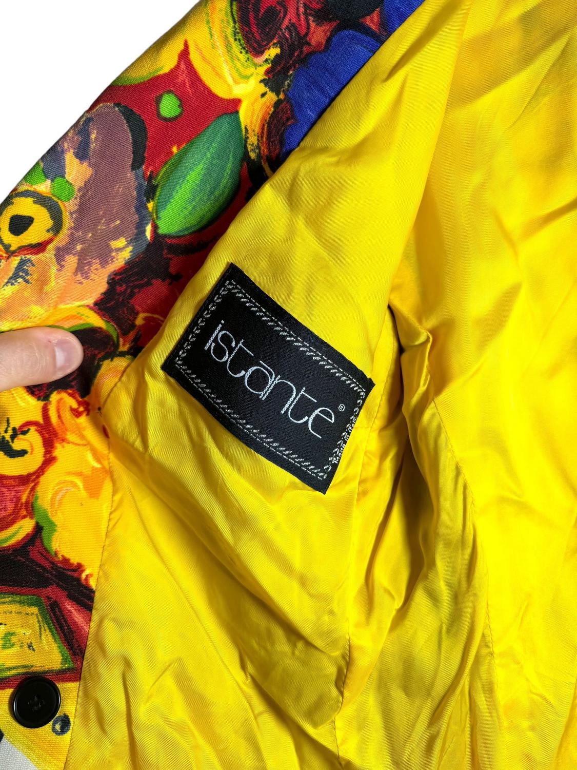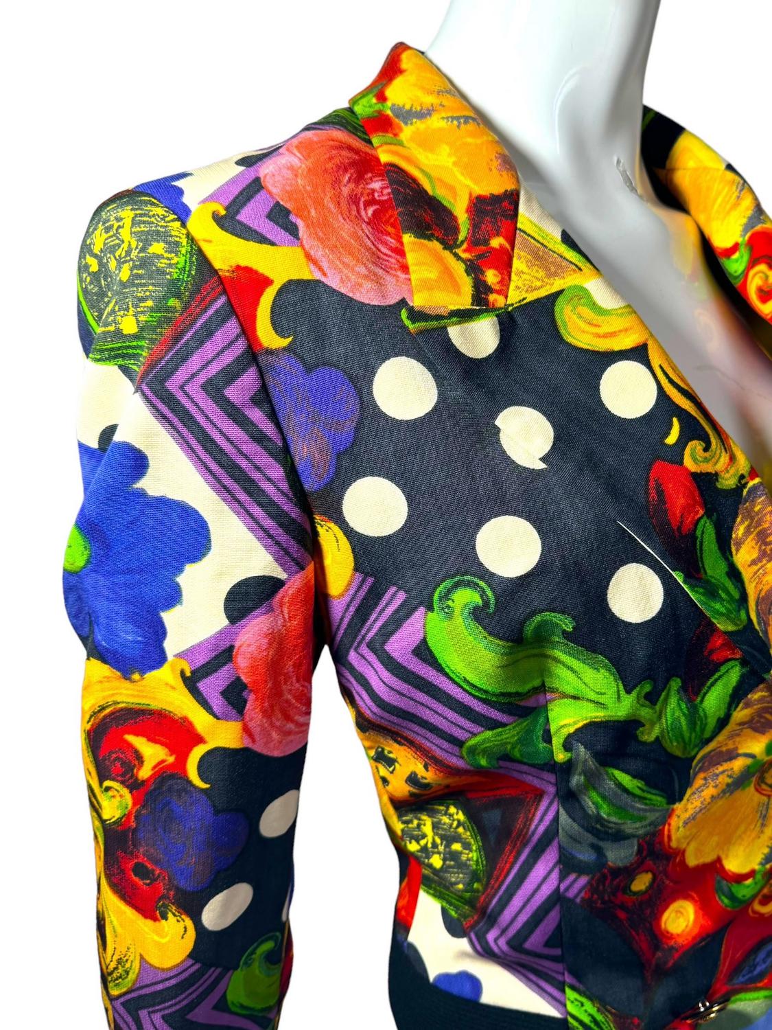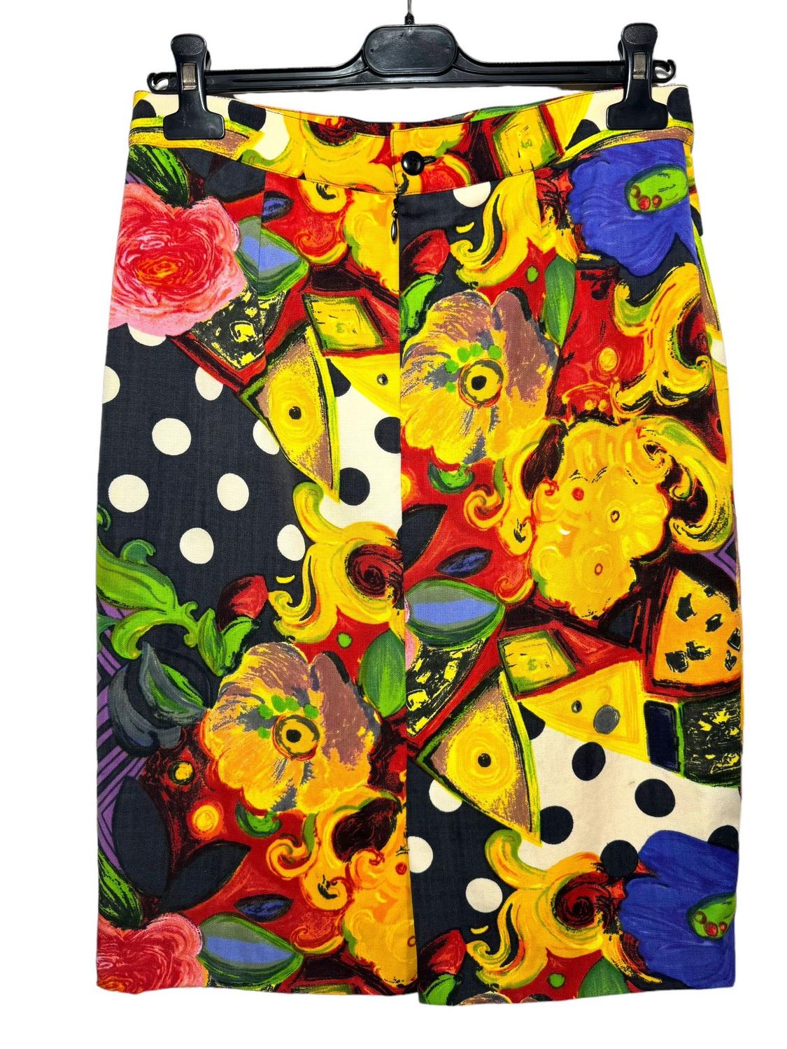 Composto da giacca a doppiopetto con bottoni gioiello e gonna. Ha una leggera macchiolina sul davanti, impercettibile, vedi ultima foto. Stampa su tessuto 100% lana. Vintage anni 90s.