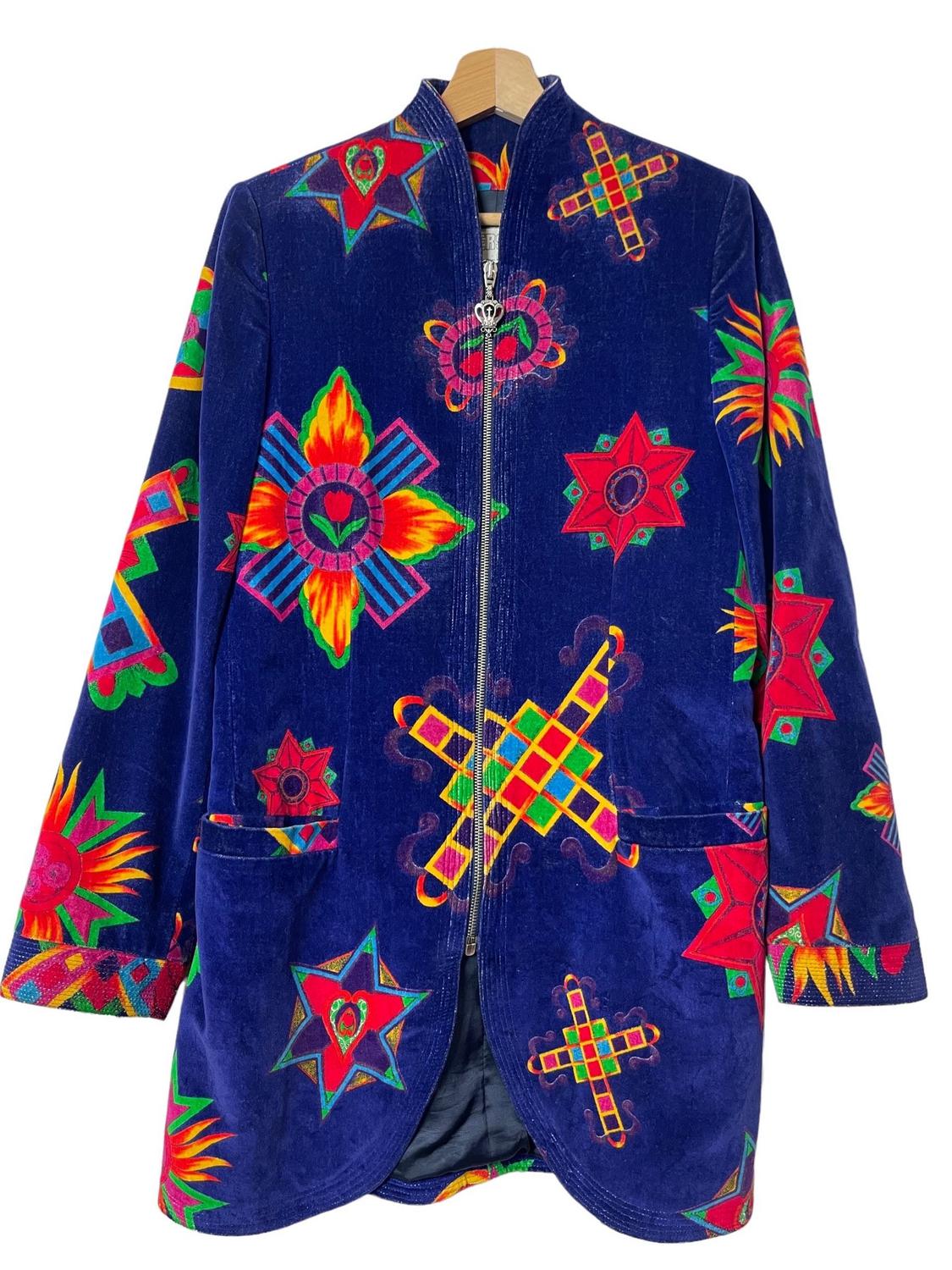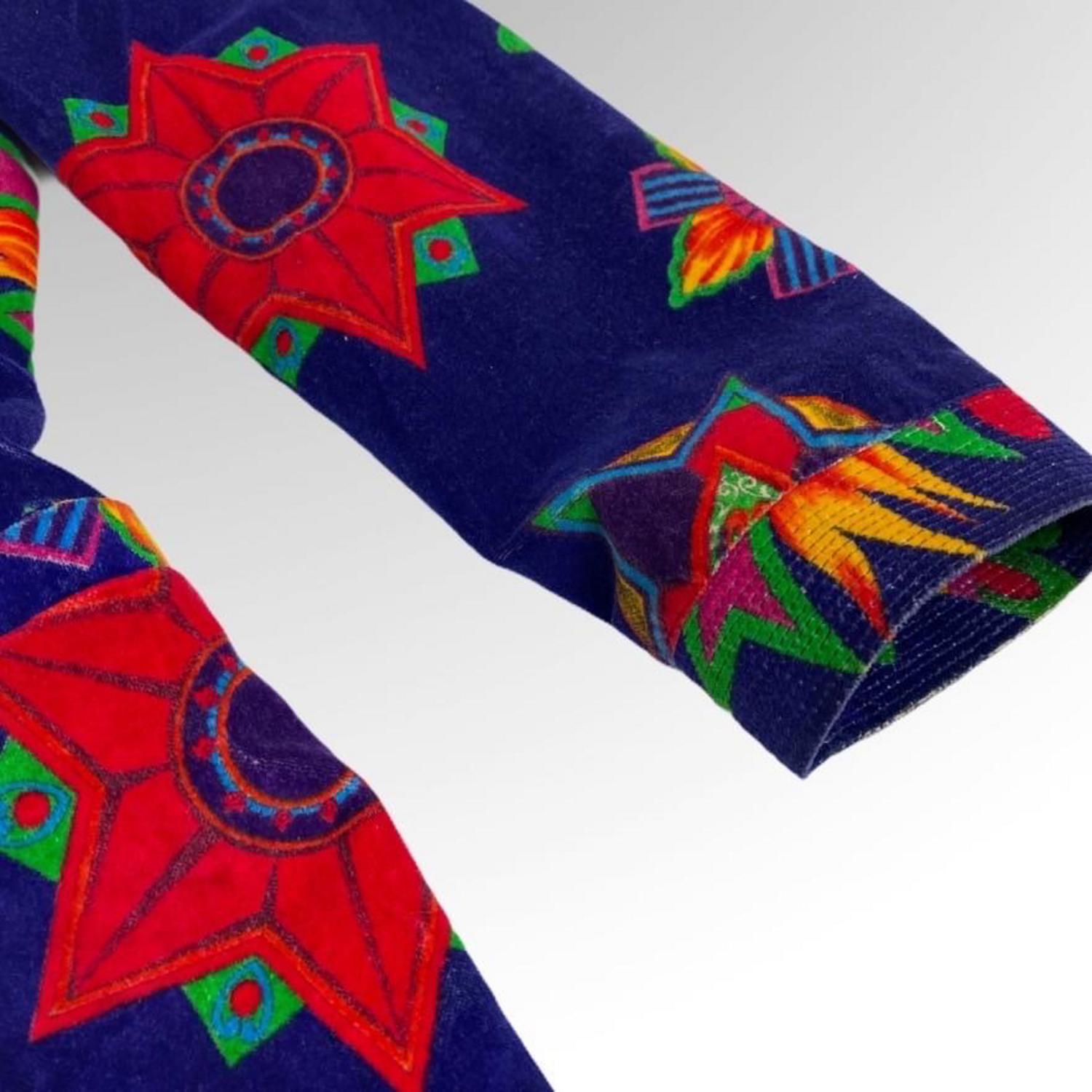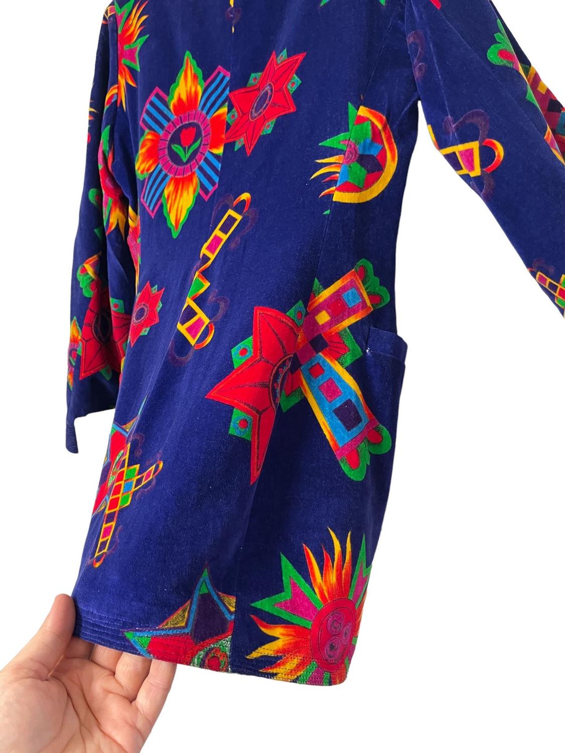 Blue velvet jacket by Versus Gianni Versace, vintage 90s. Byzantine-style cross print. Size 42. Made in Italy. PERFECTLY PRESERVED.