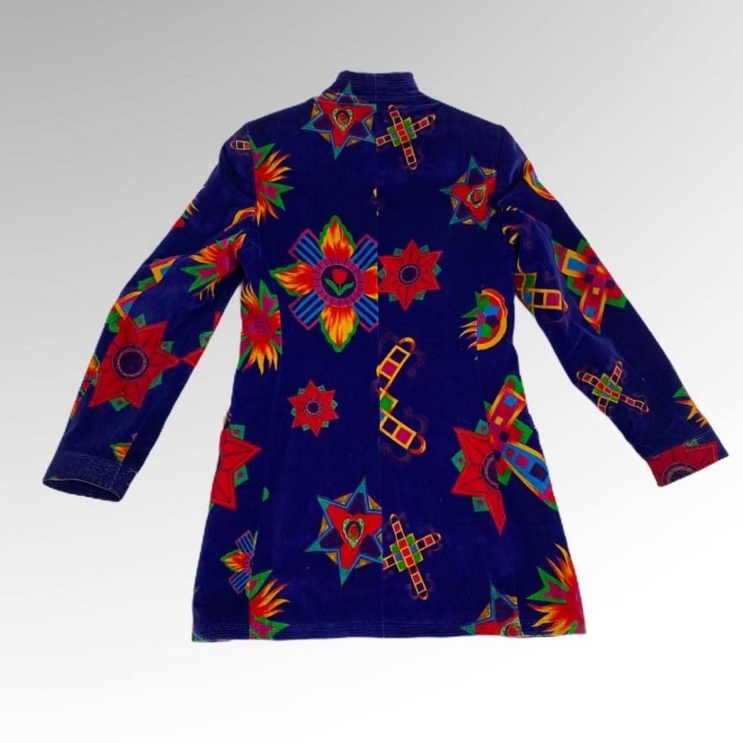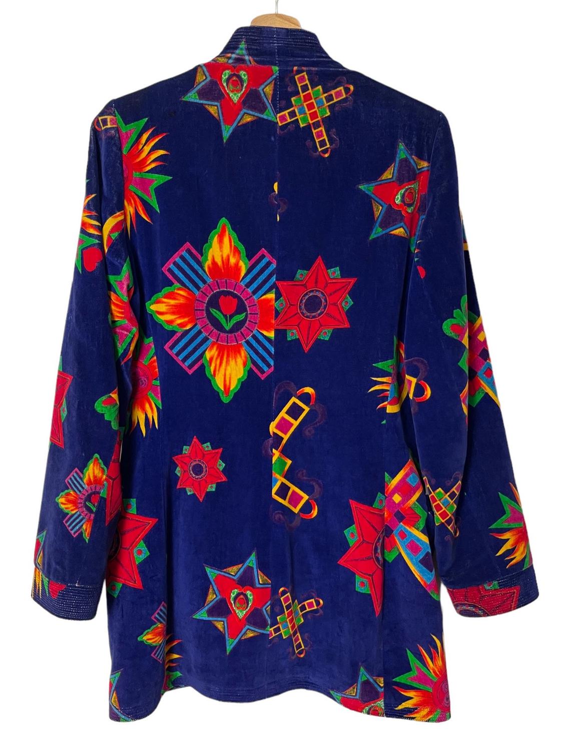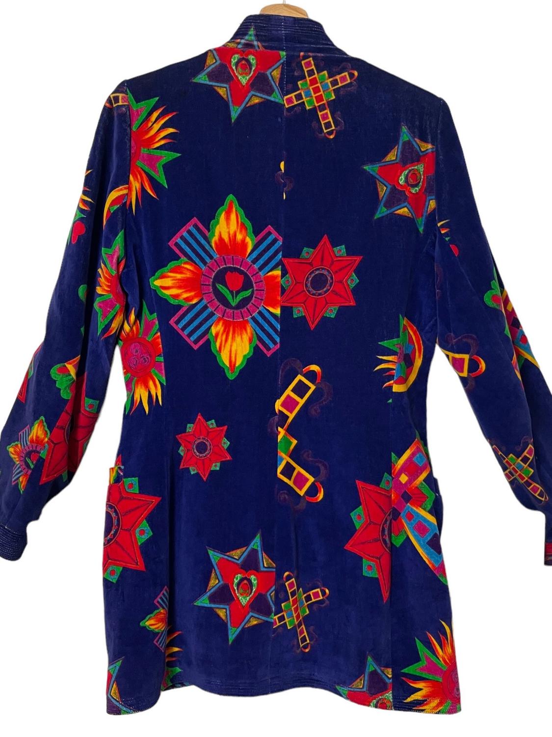 Blue velvet jacket by Versus Gianni Versace, vintage 90s. Byzantine-style cross print. Size 42. Made in Italy. PERFECTLY PRESERVED.