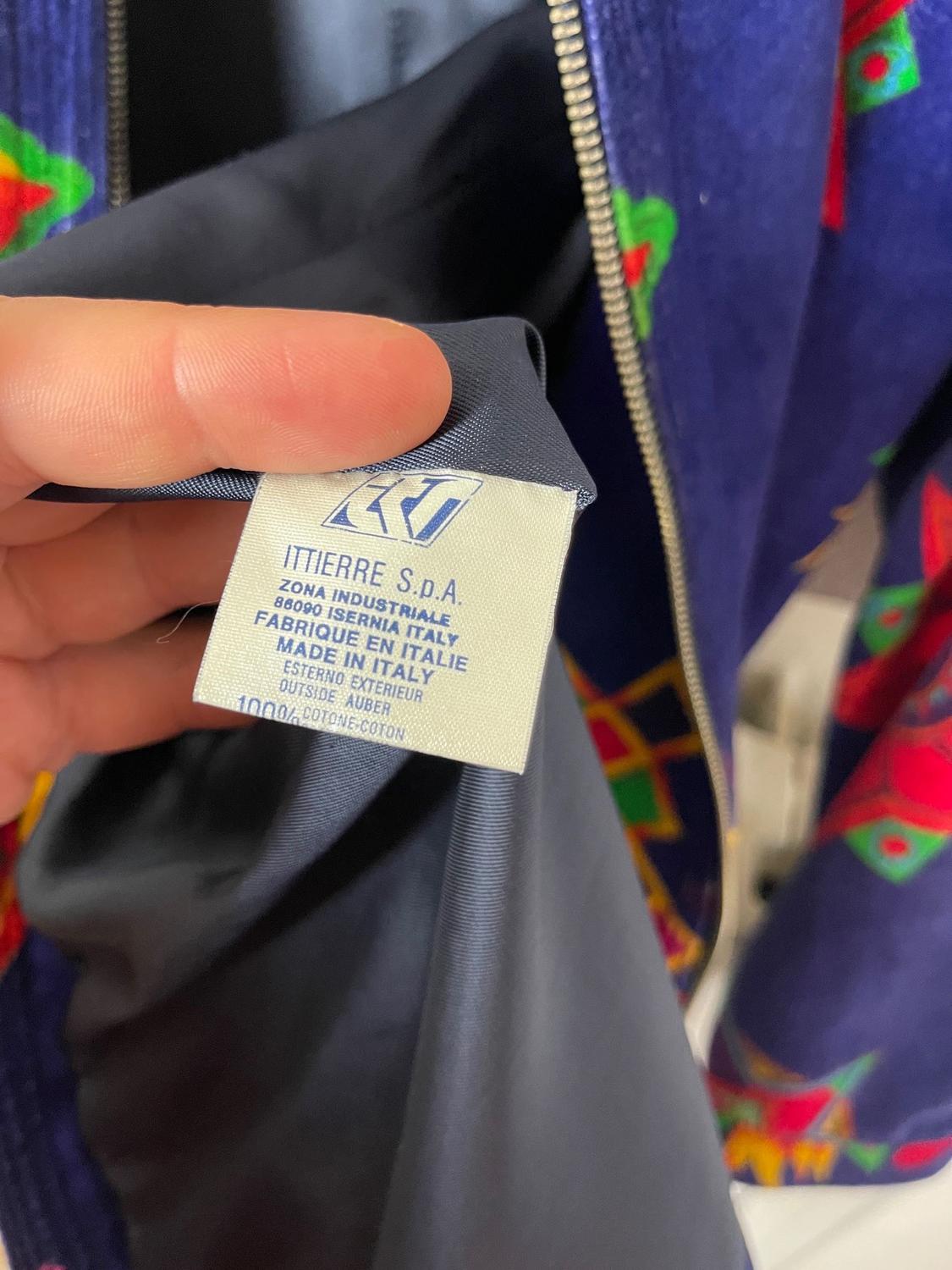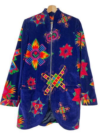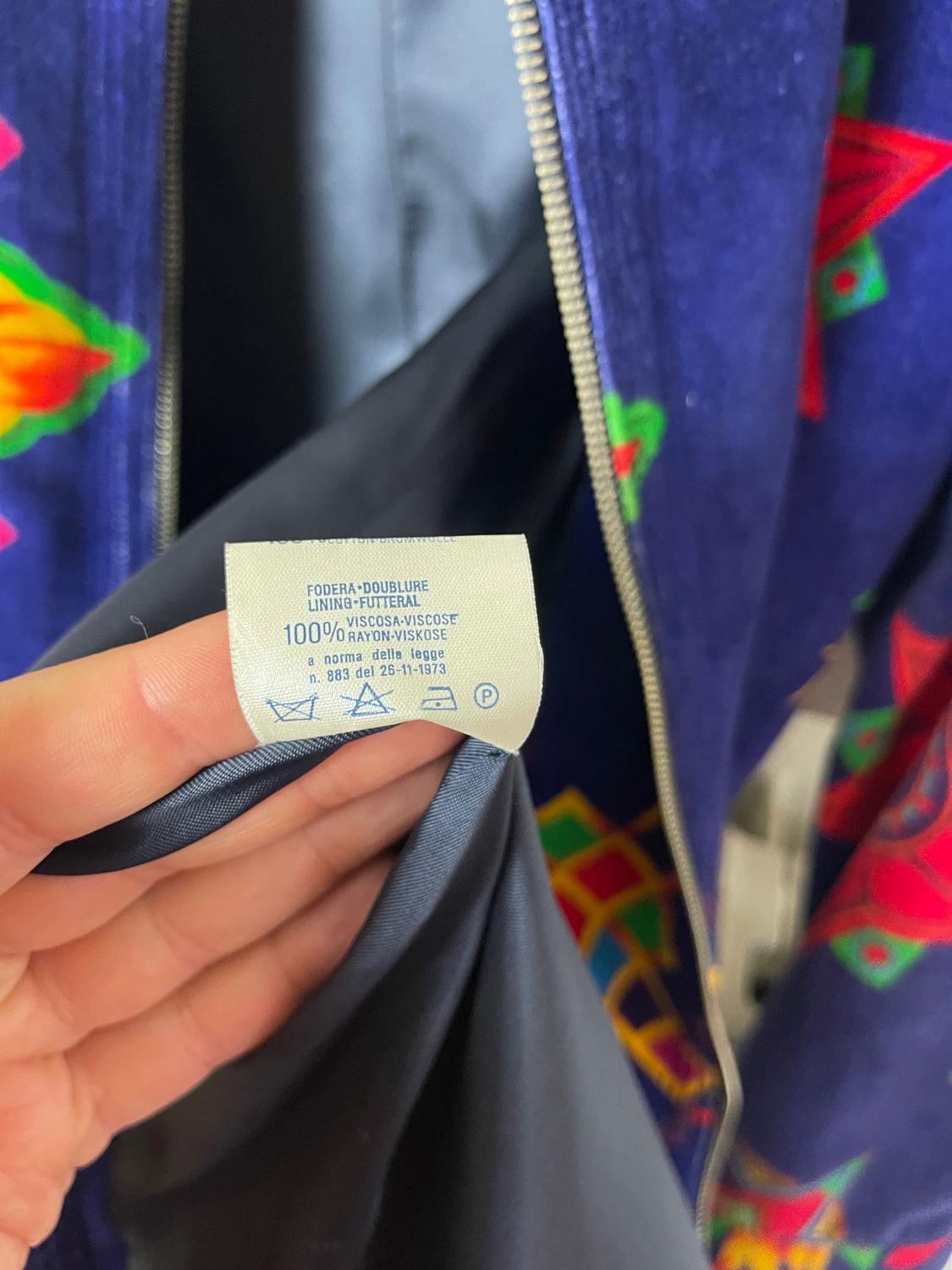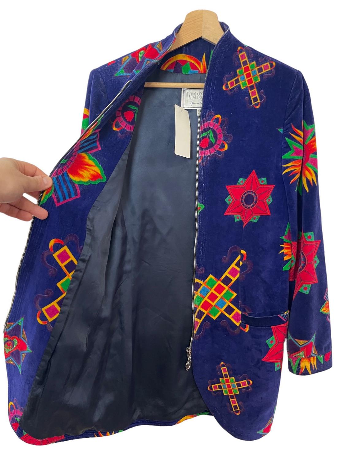 Giacca in velluto blu Versus Gianni Versace, vintage anni 90s. Stampa con croci in stile bizantino. Taglia 42. Prodotto in Italia. PERFETTAMENTE CONSERVATO.