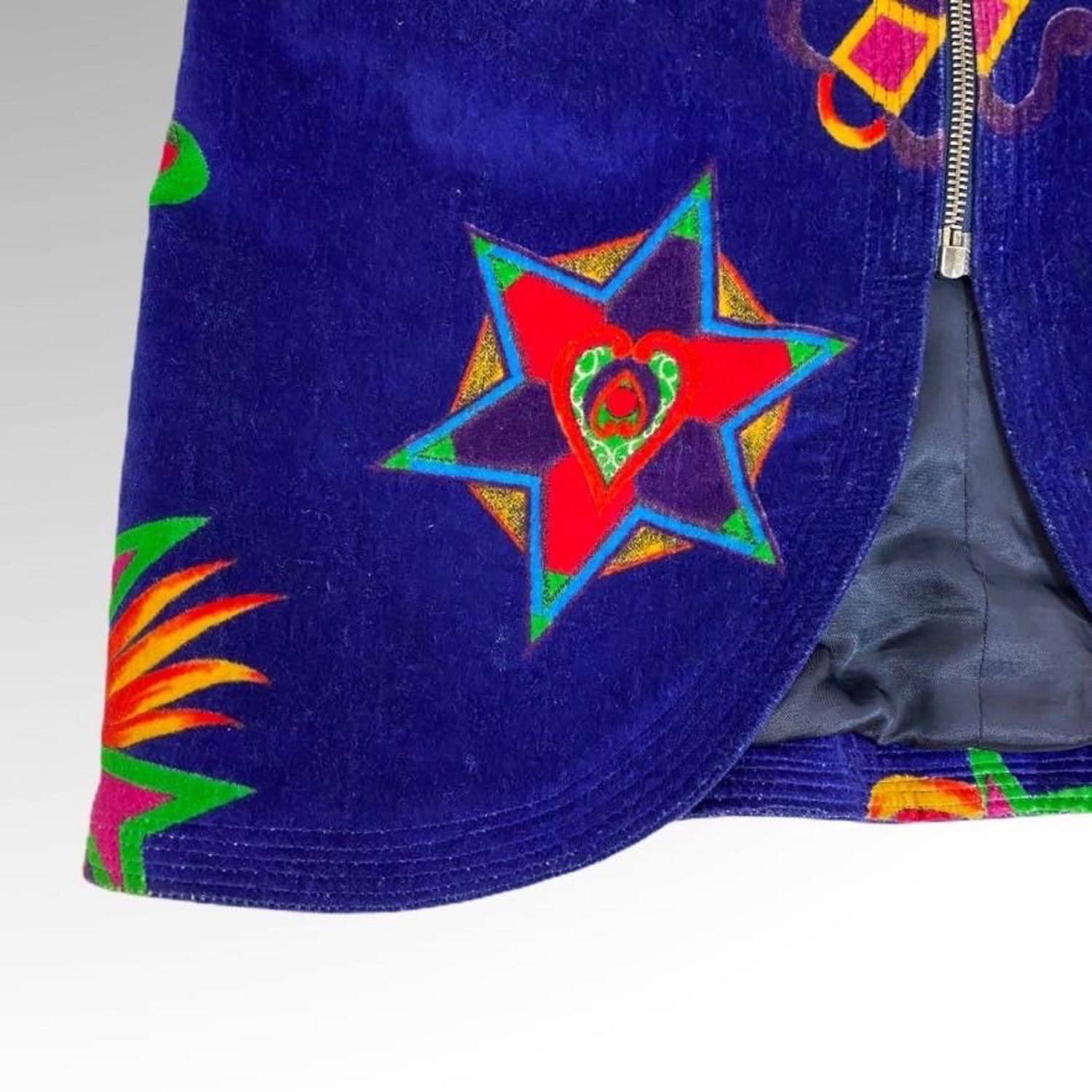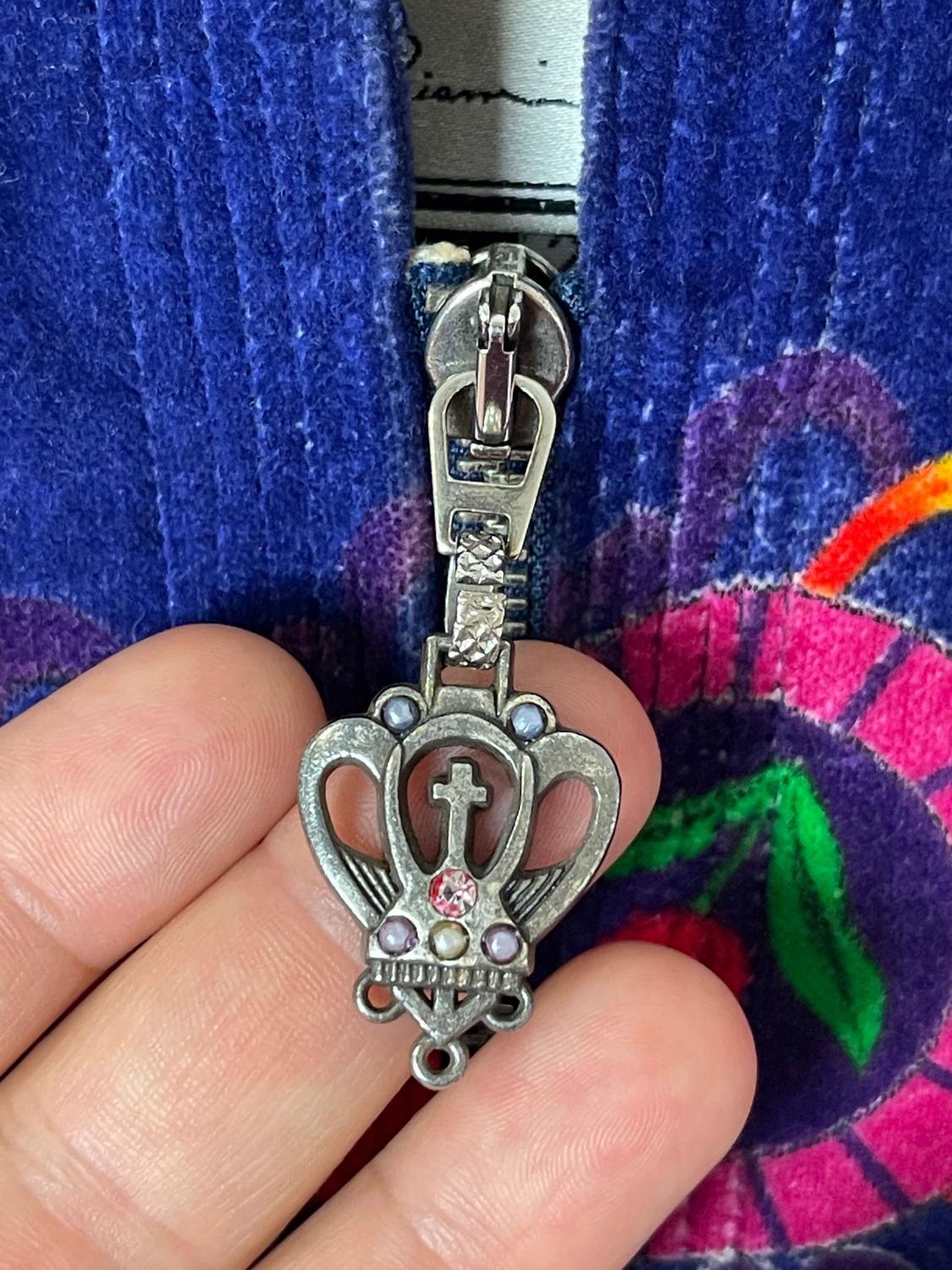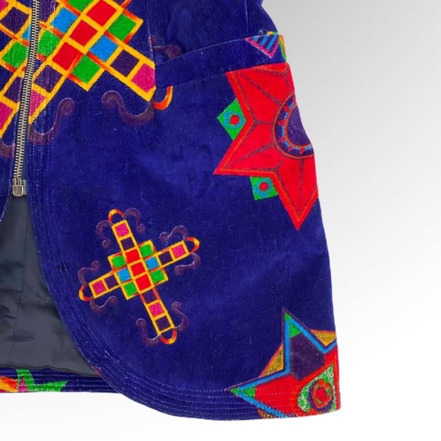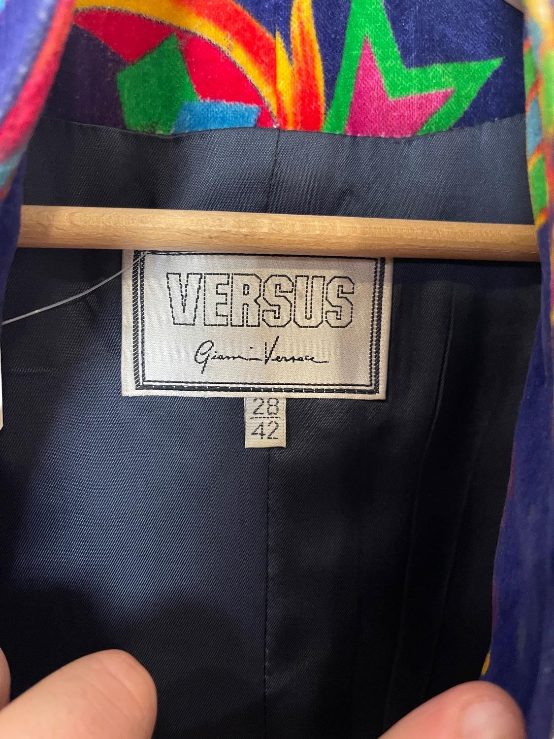 Giacca in velluto blu Versus Gianni Versace, vintage anni 90s. Stampa con croci in stile bizantino. Taglia 42. Prodotto in Italia. PERFETTAMENTE CONSERVATO.