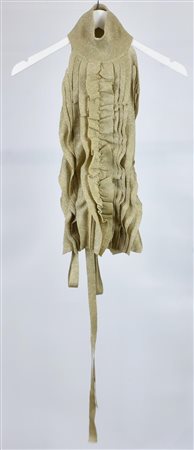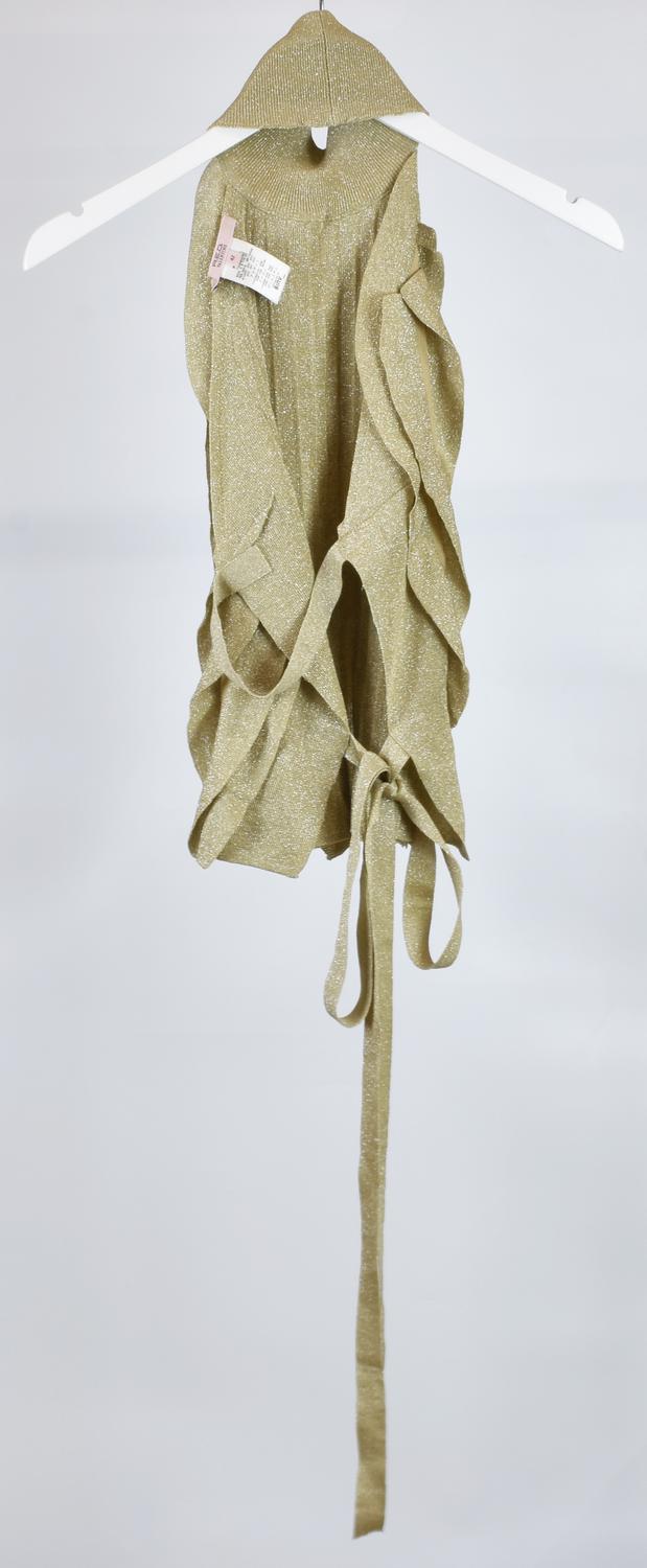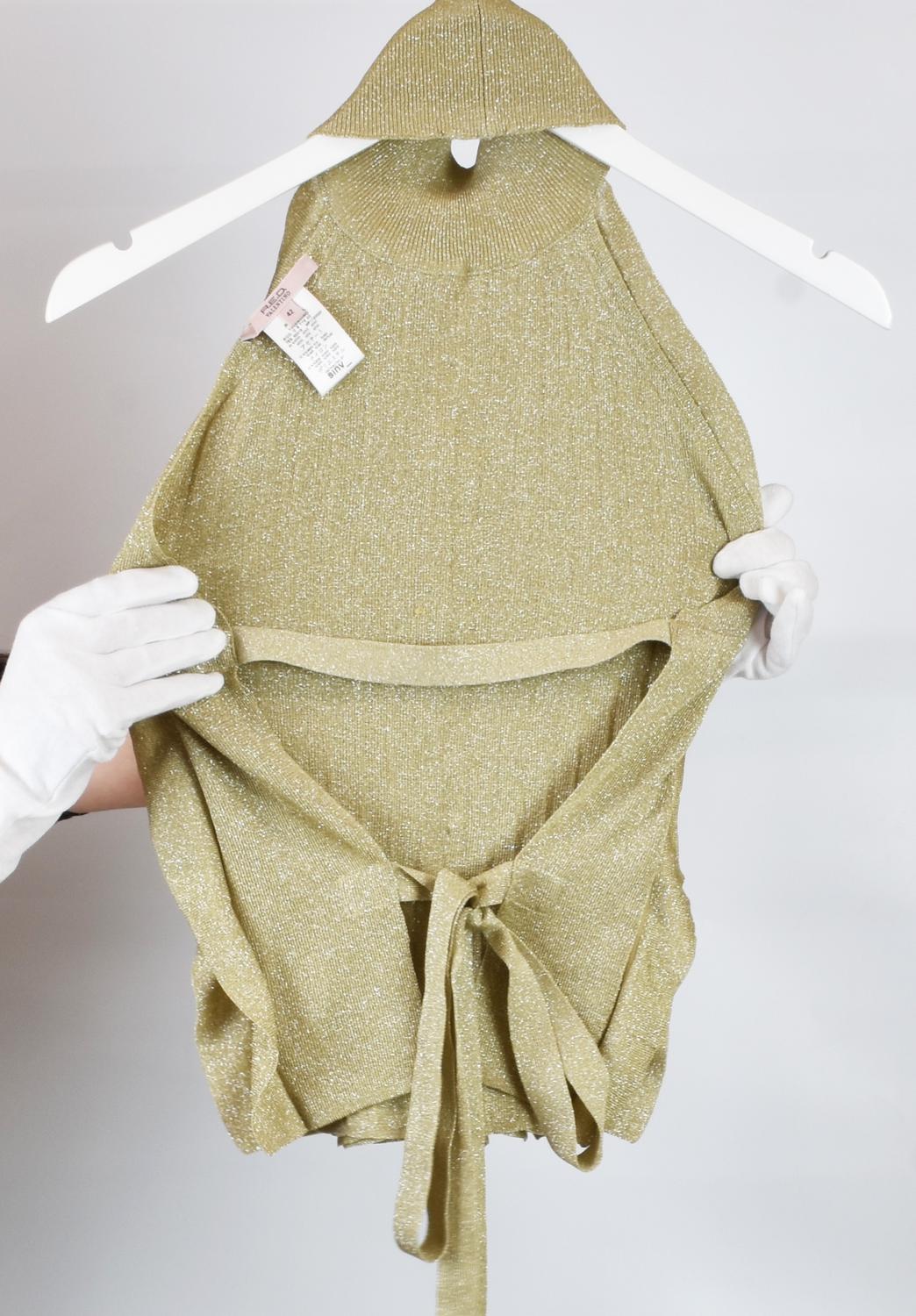 High-neck lurex top with ruffle decoration on the front and an open back. Ties at the back. Size 42 IT. Made in Italy. Perfectly preserved.