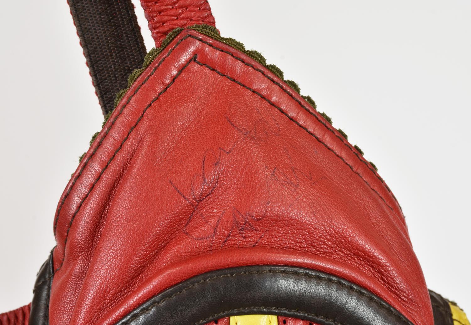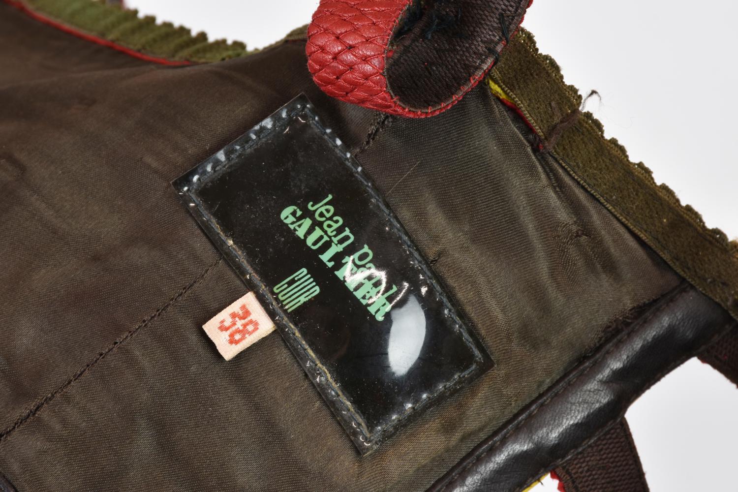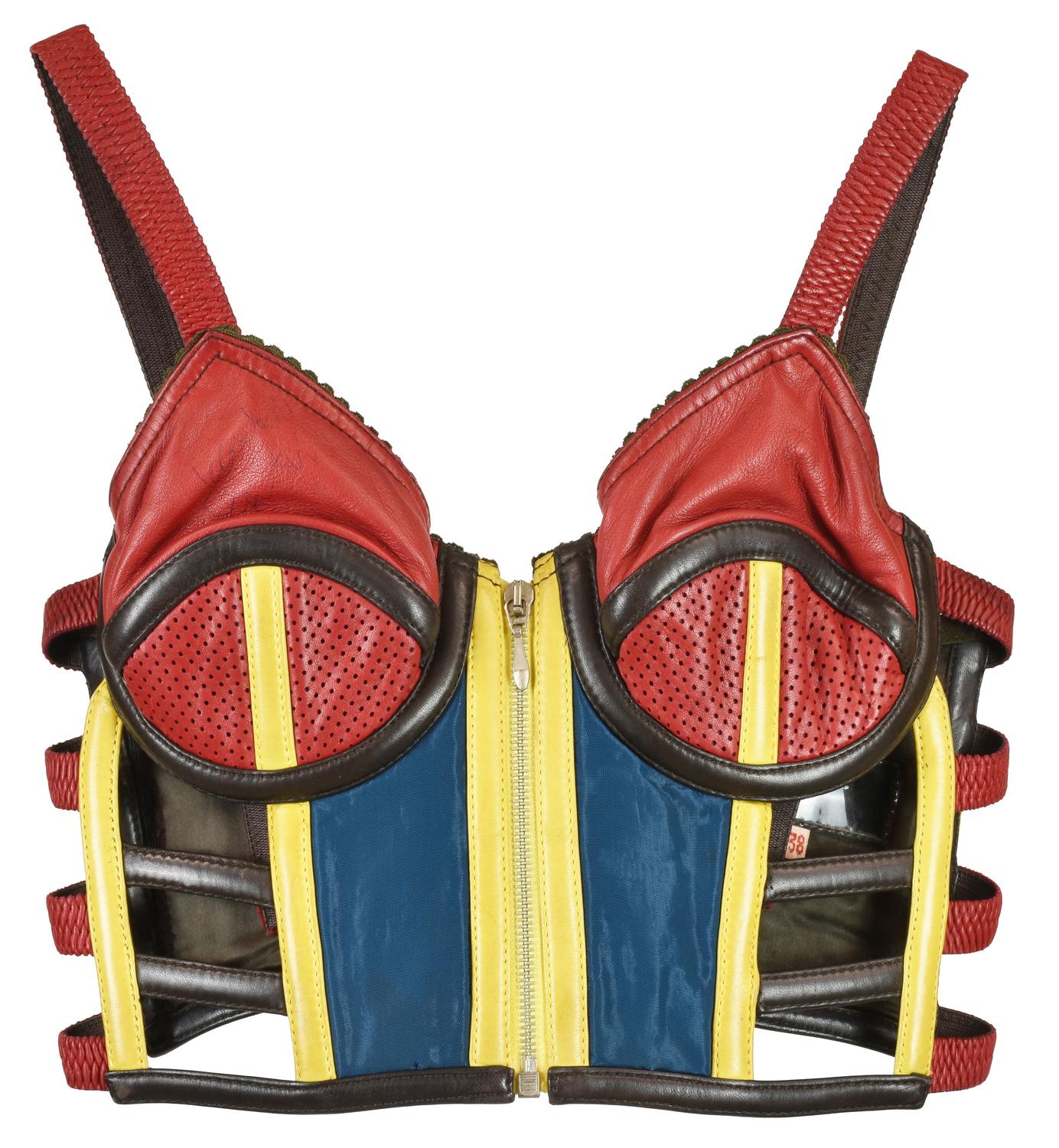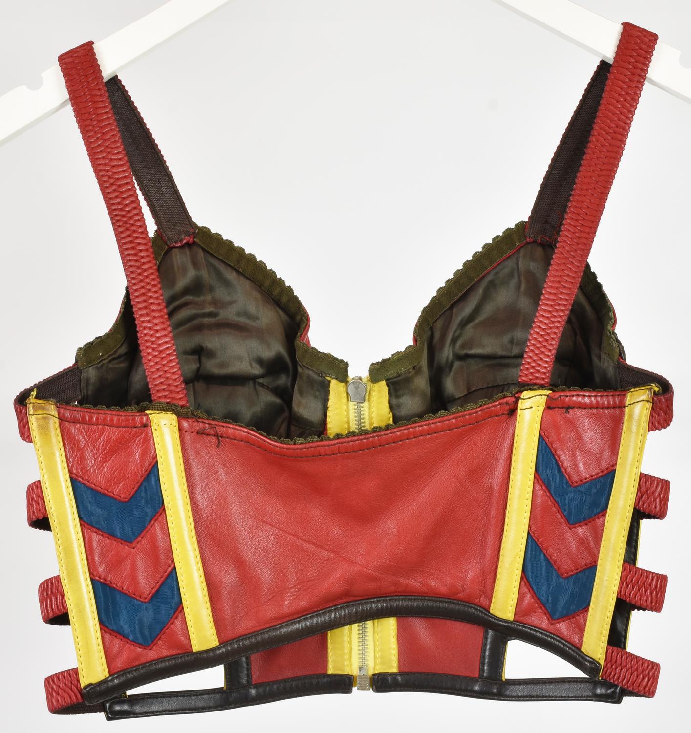 Iconico corsetto in pelle con inserti in tessuto tessuto, autografato dallo stilista sul seno destro. Zip frontale. Taglia 38. Qualche difetto alle cuciture delle spalline nella parte posteriore. Ben conservato.