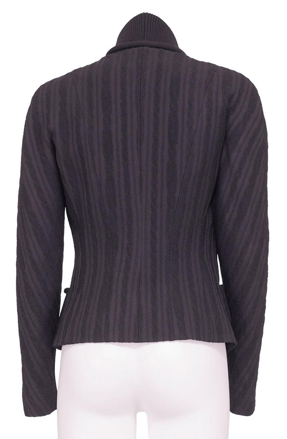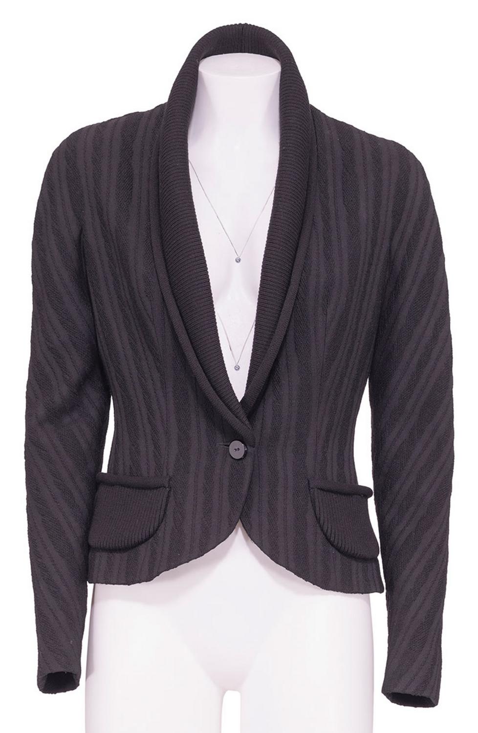 Iconica giacca con collo a scialle in maglia jacquard degli anni '90. Maniche intere senza cucitura. Completamente foderata. 98x100 lana, 1x100 nylon, 1x100 elastan. Fodera 100x100 seta. La taglia e' una FR 36. Eccellente.