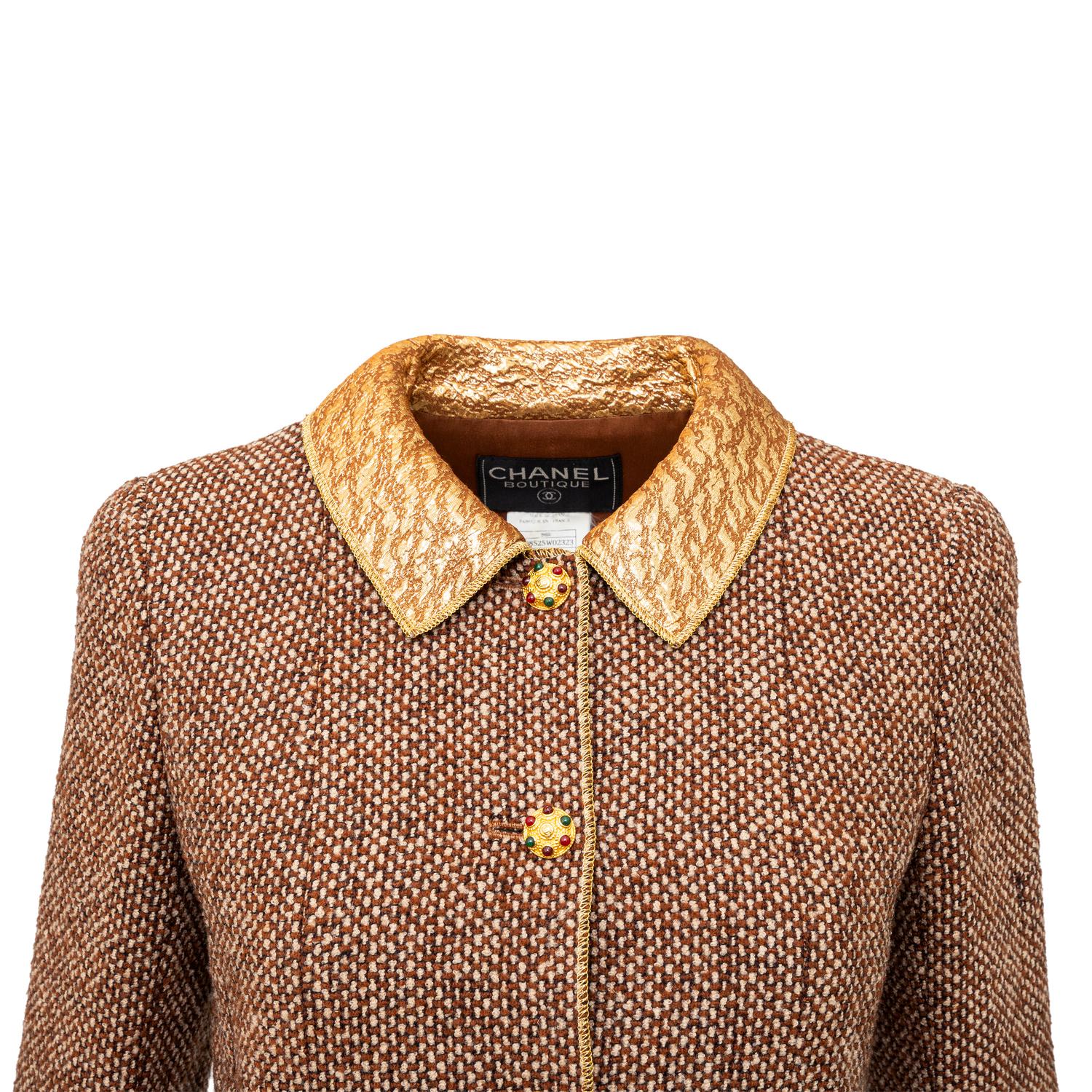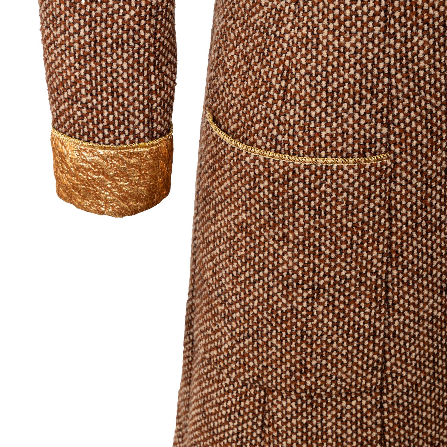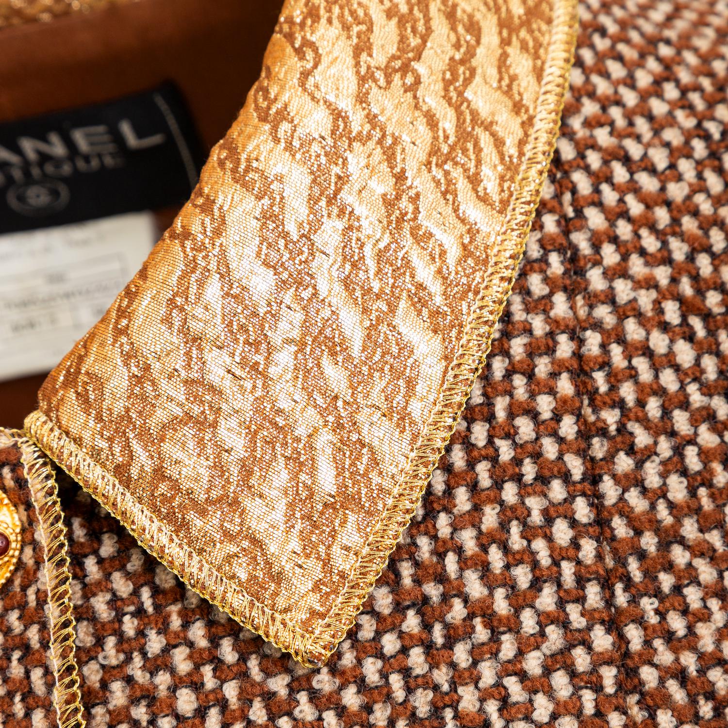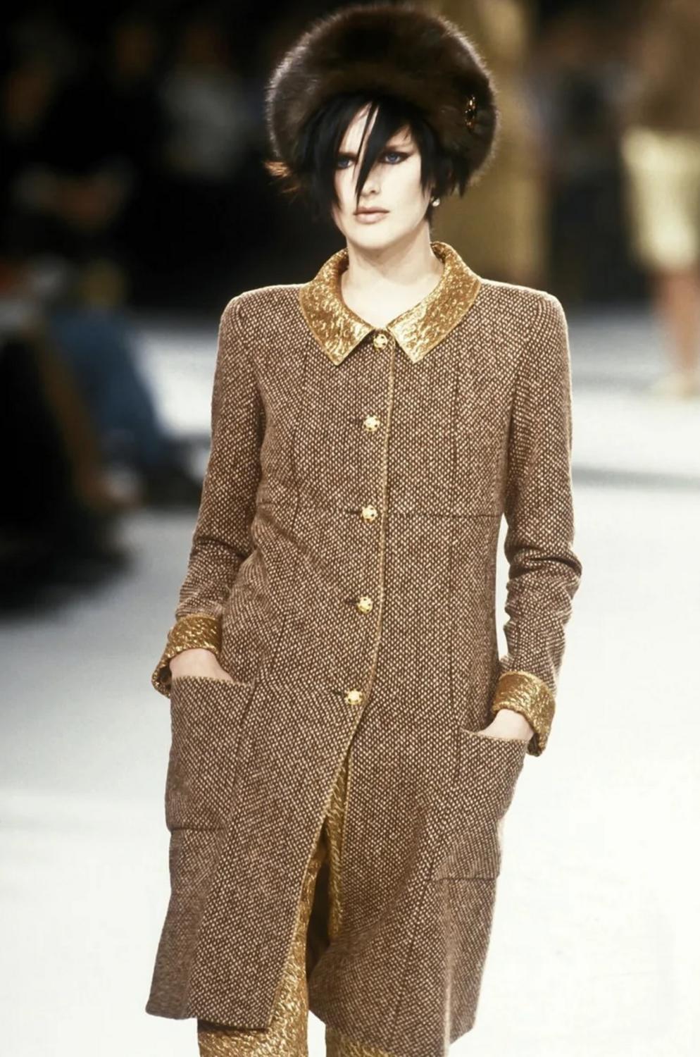 Exude vintage luxury in this 90s Chanel Vintage Long Jacket. From the Fall 1996 collection by Karl Lagerfeld, this wool blend jacket features a brown tweed pattern with glamorous gold lamé collar and cuffs, accented with glitter for a touch of glitz. Its knee-length design, slit pockets, and jeweled button closure complete the design. Size 38 FR. Remarks: There is a small fabric imperfection on the left sleeve. Very good condition