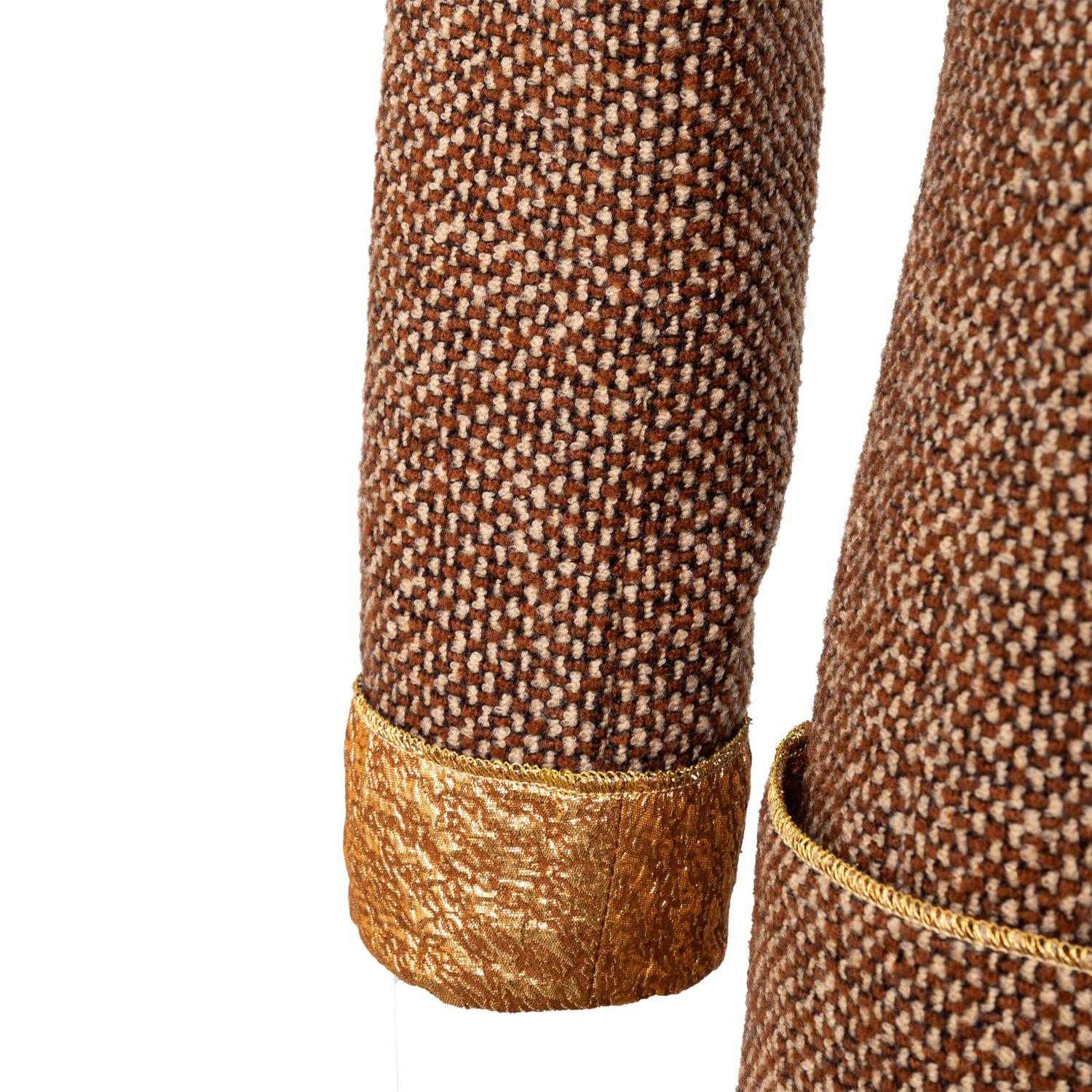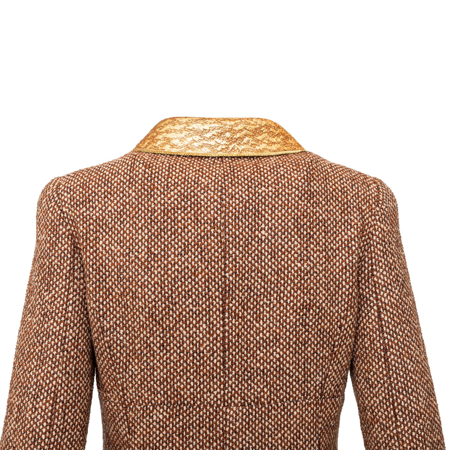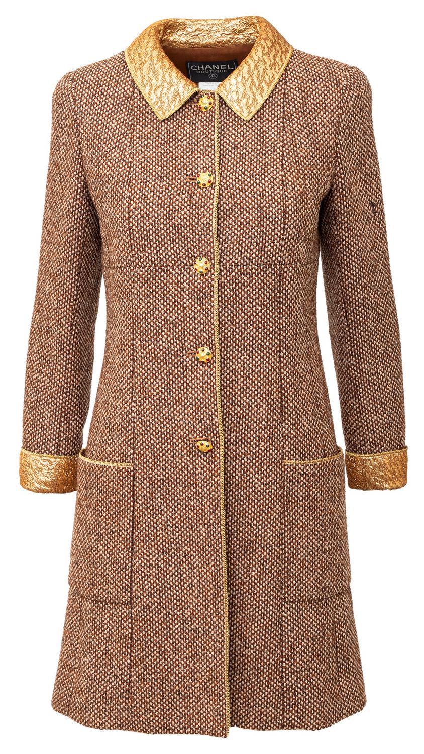 Exude vintage luxury in this 90s Chanel Vintage Long Jacket. From the Fall 1996 collection by Karl Lagerfeld, this wool blend jacket features a brown tweed pattern with glamorous gold lamé collar and cuffs, accented with glitter for a touch of glitz. Its knee-length design, slit pockets, and jeweled button closure complete the design. Size 38 FR. Remarks: There is a small fabric imperfection on the left sleeve. Very good condition