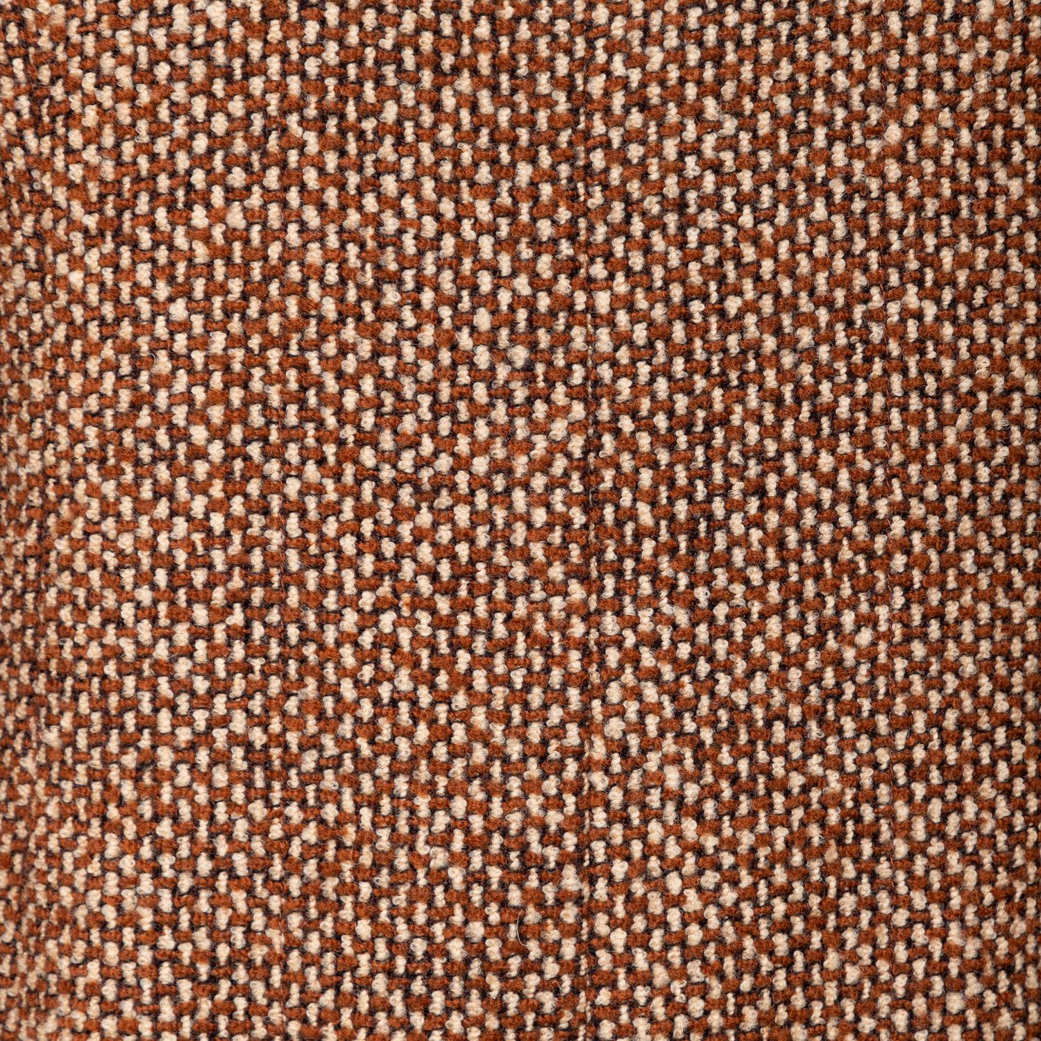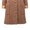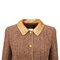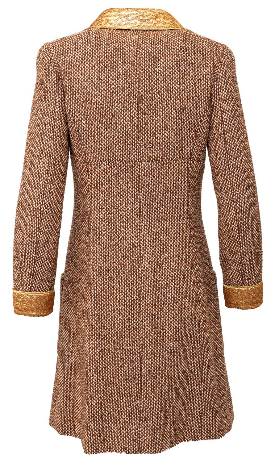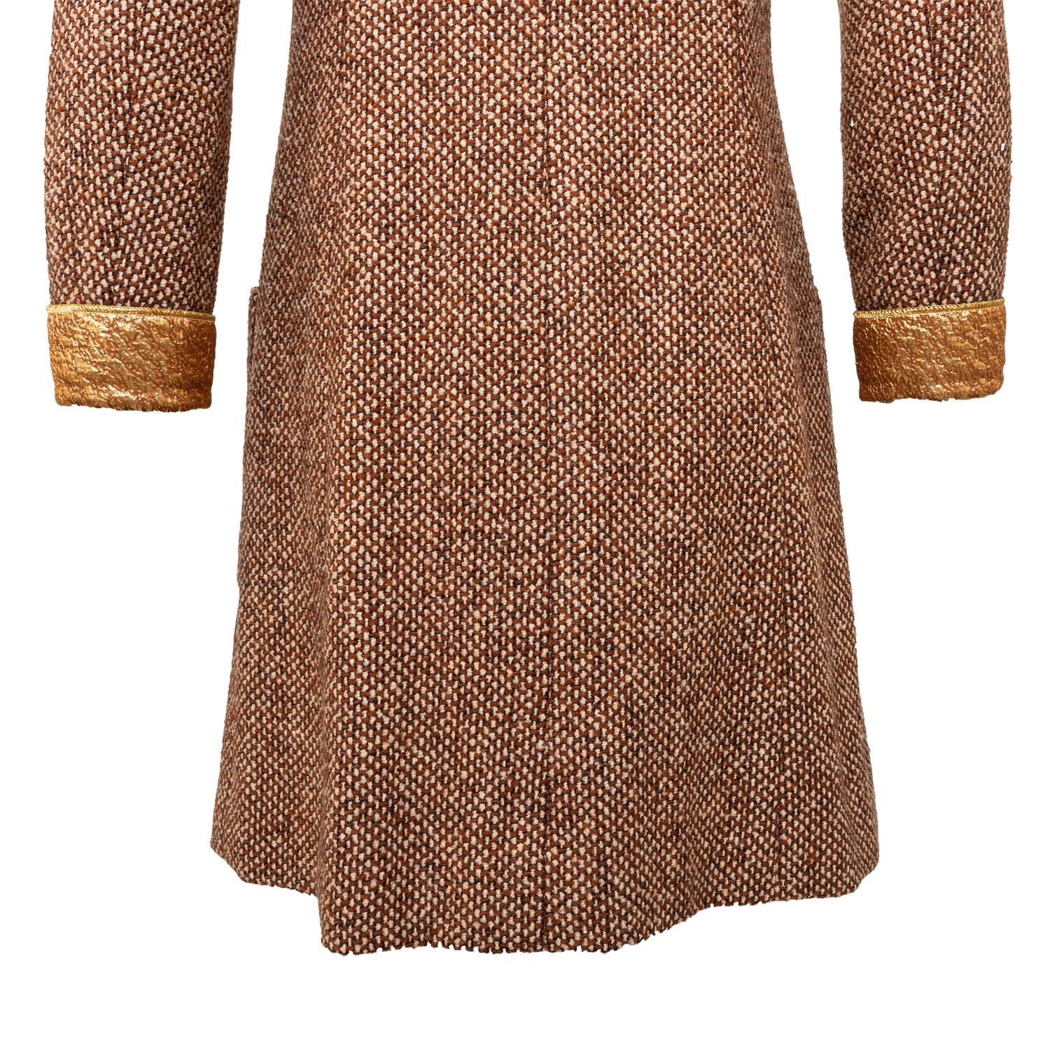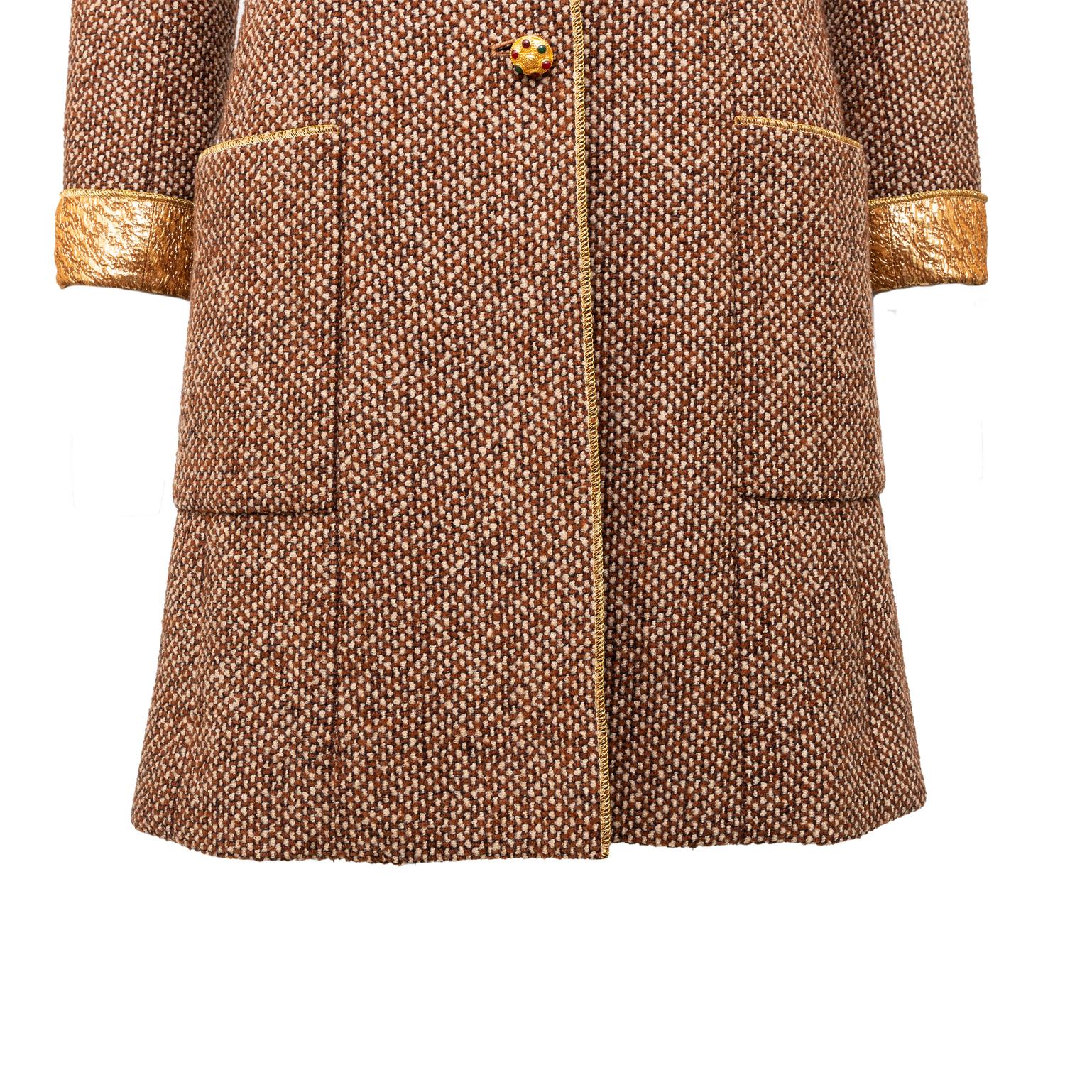 Exude vintage luxury in this 90s Chanel Vintage Long Jacket. From the Fall 1996 collection by Karl Lagerfeld, this wool blend jacket features a brown tweed pattern with glamorous gold lamé collar and cuffs, accented with glitter for a touch of glitz. Its knee-length design, slit pockets, and jeweled button closure complete the design. Size 38 FR. Remarks: There is a small fabric imperfection on the left sleeve. Very good condition
