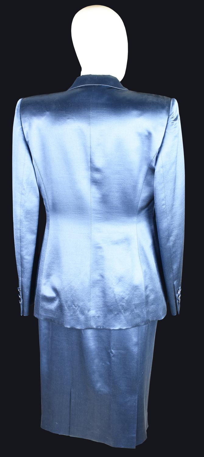 Tailleur in lana e seta. La giacca presenta spalline imbottite e fodera interna in cupro loggata, due tasche esterne con patta e un taschino interno. Bottoni ton sur ton con logo della Maison. Taglia 44 IT. Prodotto in Italia. Ben conservato.