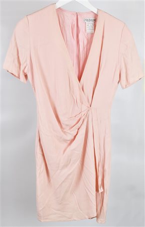 Abito rosa con scollo a V e arricciatura in vita. Cerniera posteriore e spalline imbottite. Taglia 40 FR. Prodotto in Francia. Segni d’uso e piccole macchie. Ben conservato.