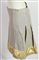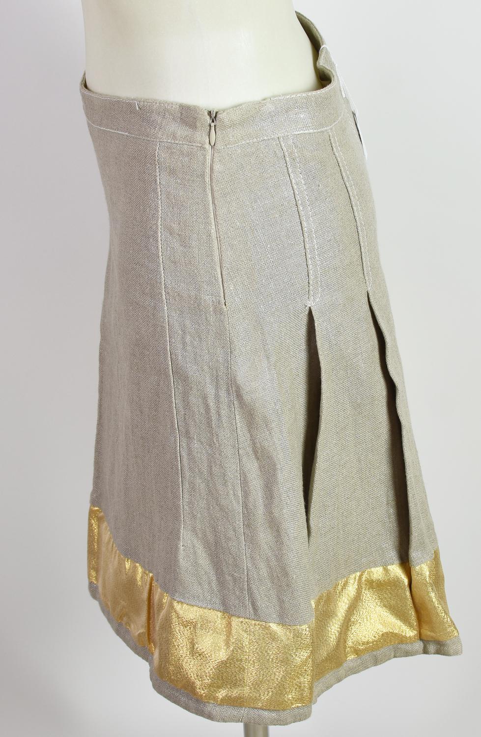Gonna a pieghe in lino con dettaglio dorato. Chiusura laterale con cerniera. Taglia 42 IT. Prodotto in Italia. Perfettamente conservato.