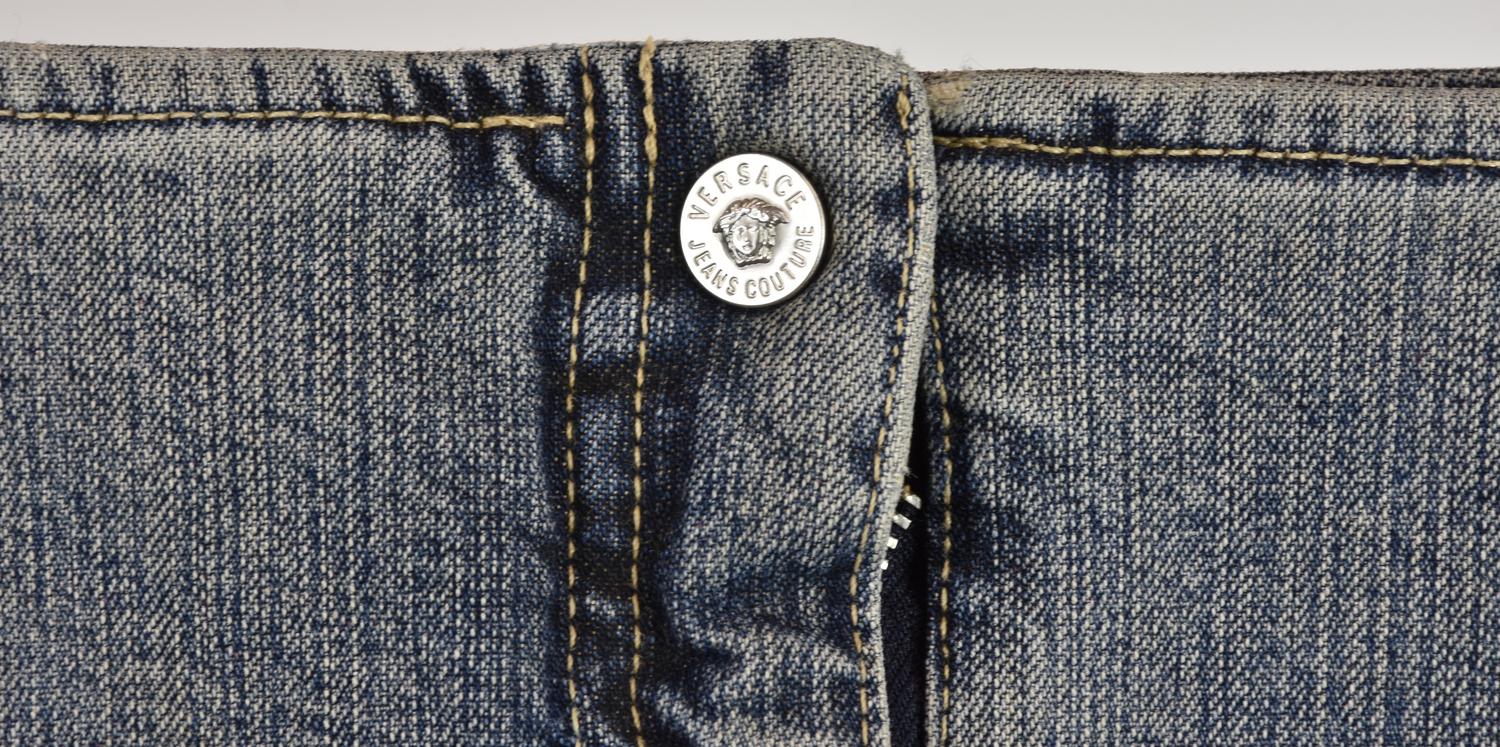 Five-pocket denim skirt with Medusa-head rivets. Size 46 IT. Made in Italy. Shows signs of use and aging. Well preserved.
