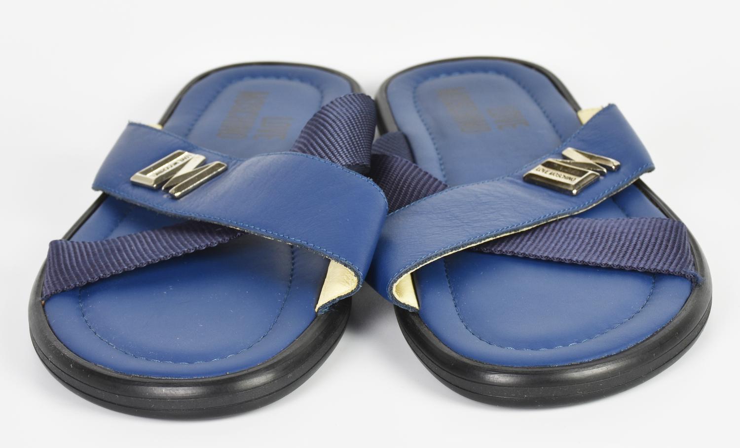 Men's blue sandals in leather and nylon. Metal logo on the strap. No size indicated, fits an IT 42/43. Perfectly preserved.