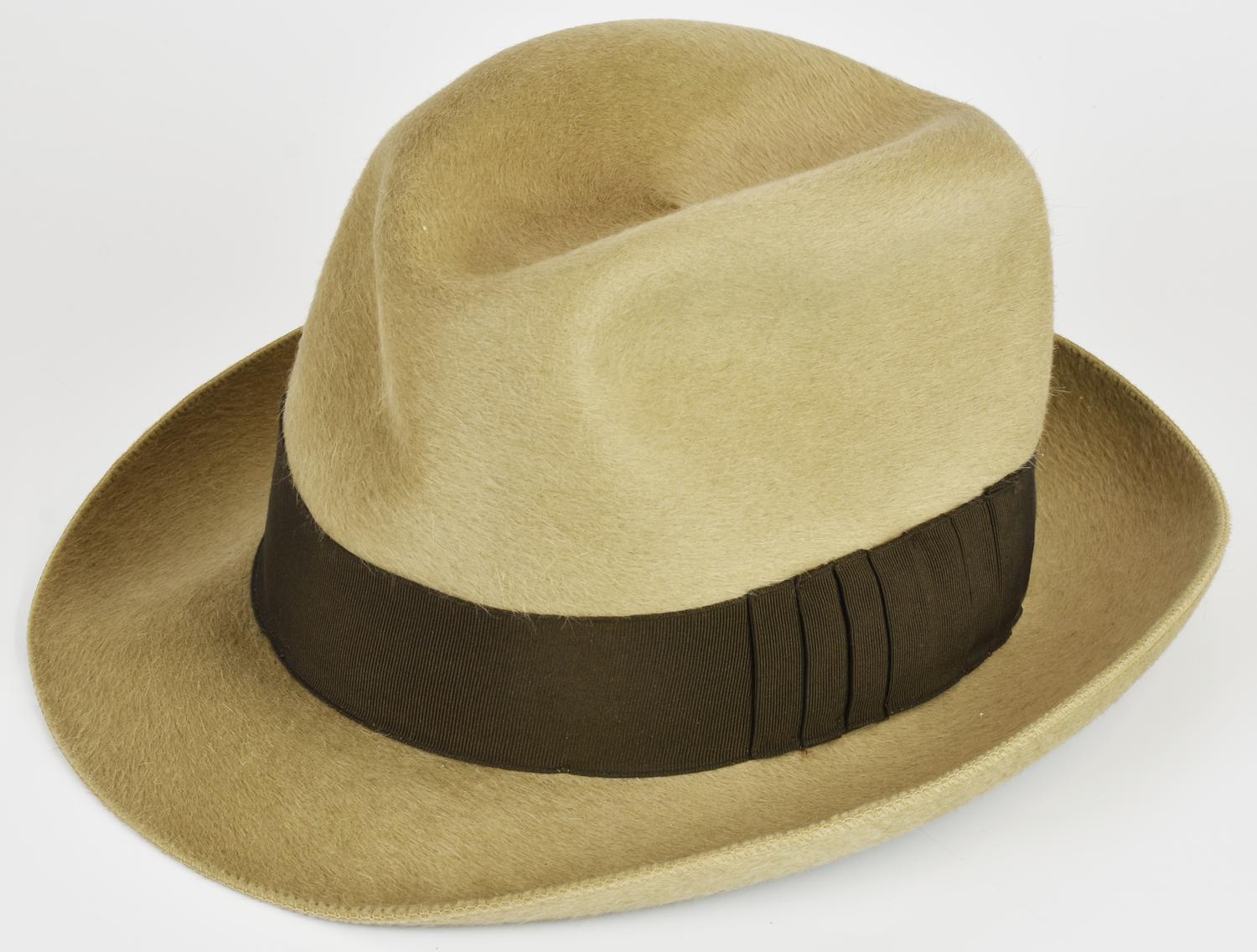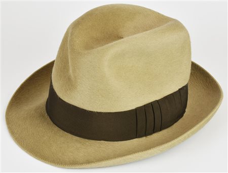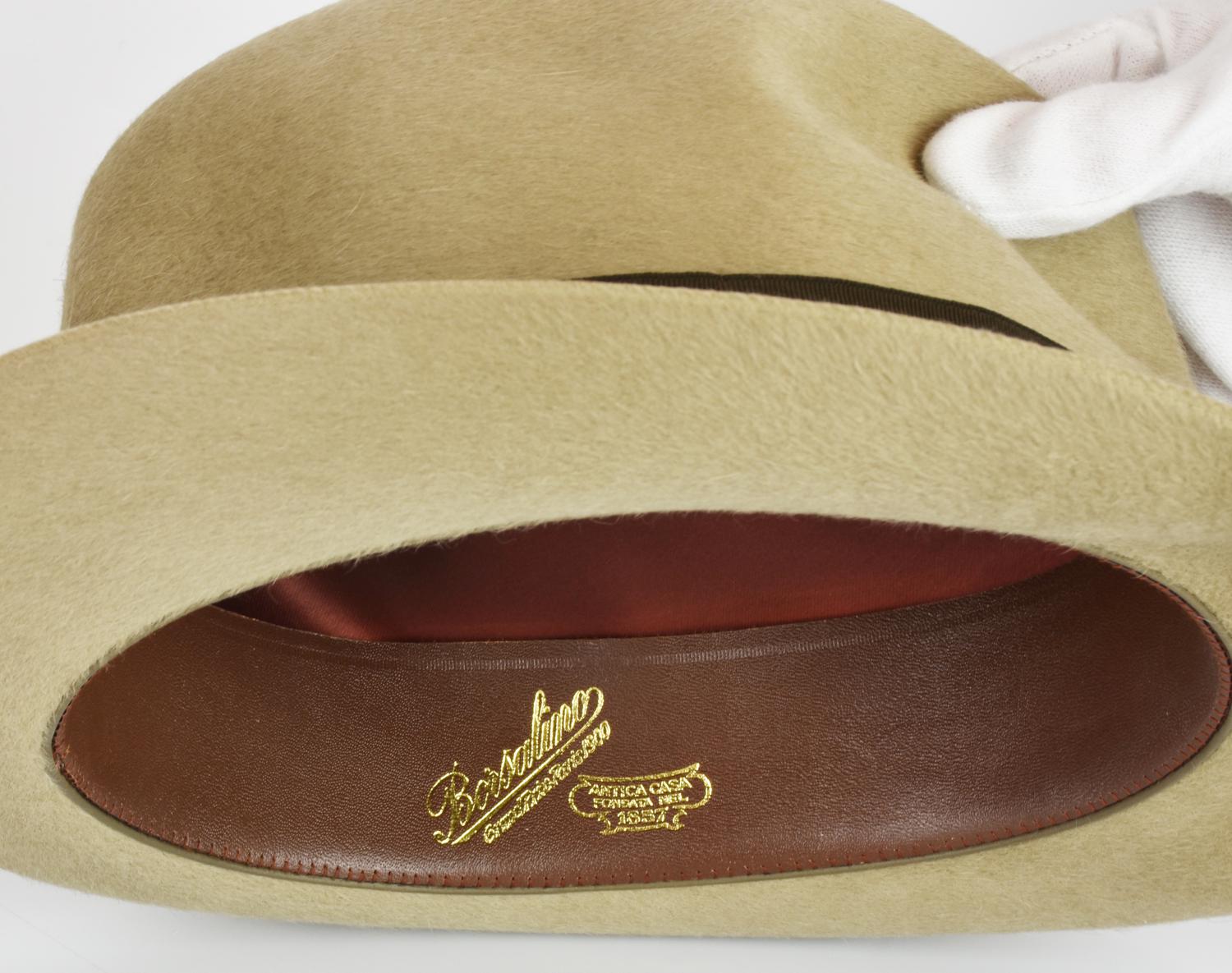 Borsalino in feltro di lana grigio e fodera in seta a tesa media. Cinta in cannetè marrone scuro. All’interno logo della Maison e del rivenditore Viarani di Torino. Taglia 5.5. Eccellente, mai indossato, pari al nuovo.