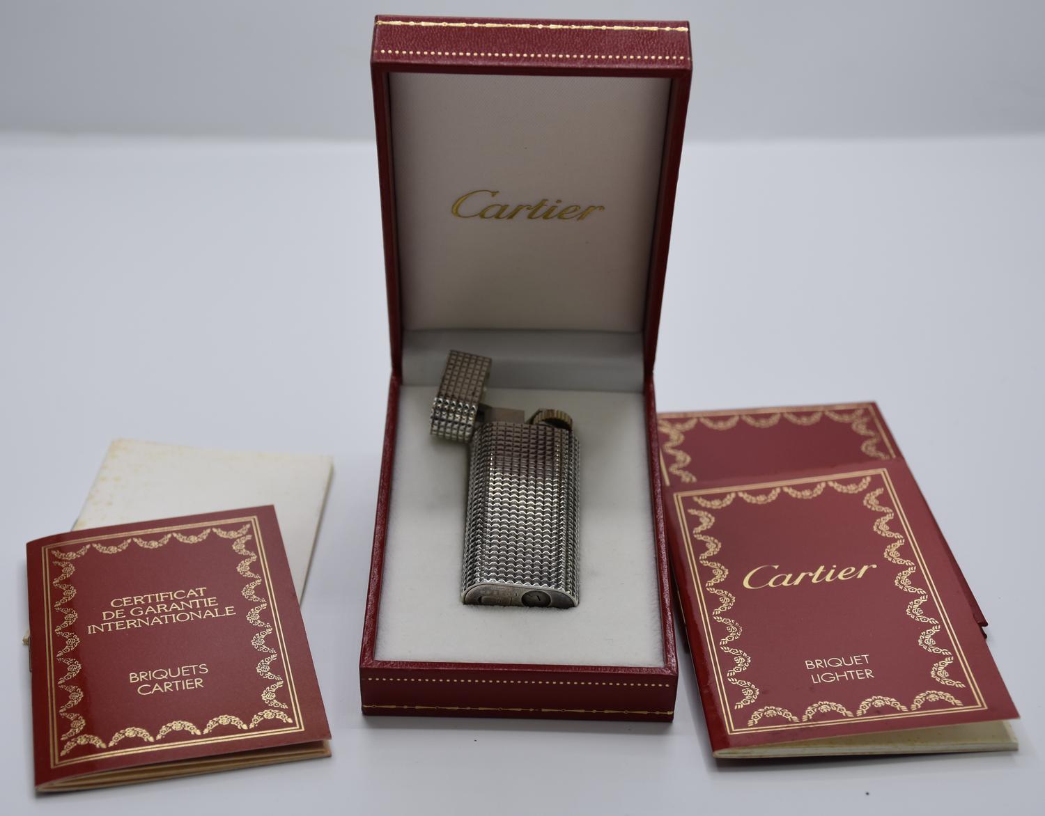 Cartier silver-plated lighter. Serial number: E 62308. Presented with original box, booklets, and warranty. Pre-owned but in excellent condition.