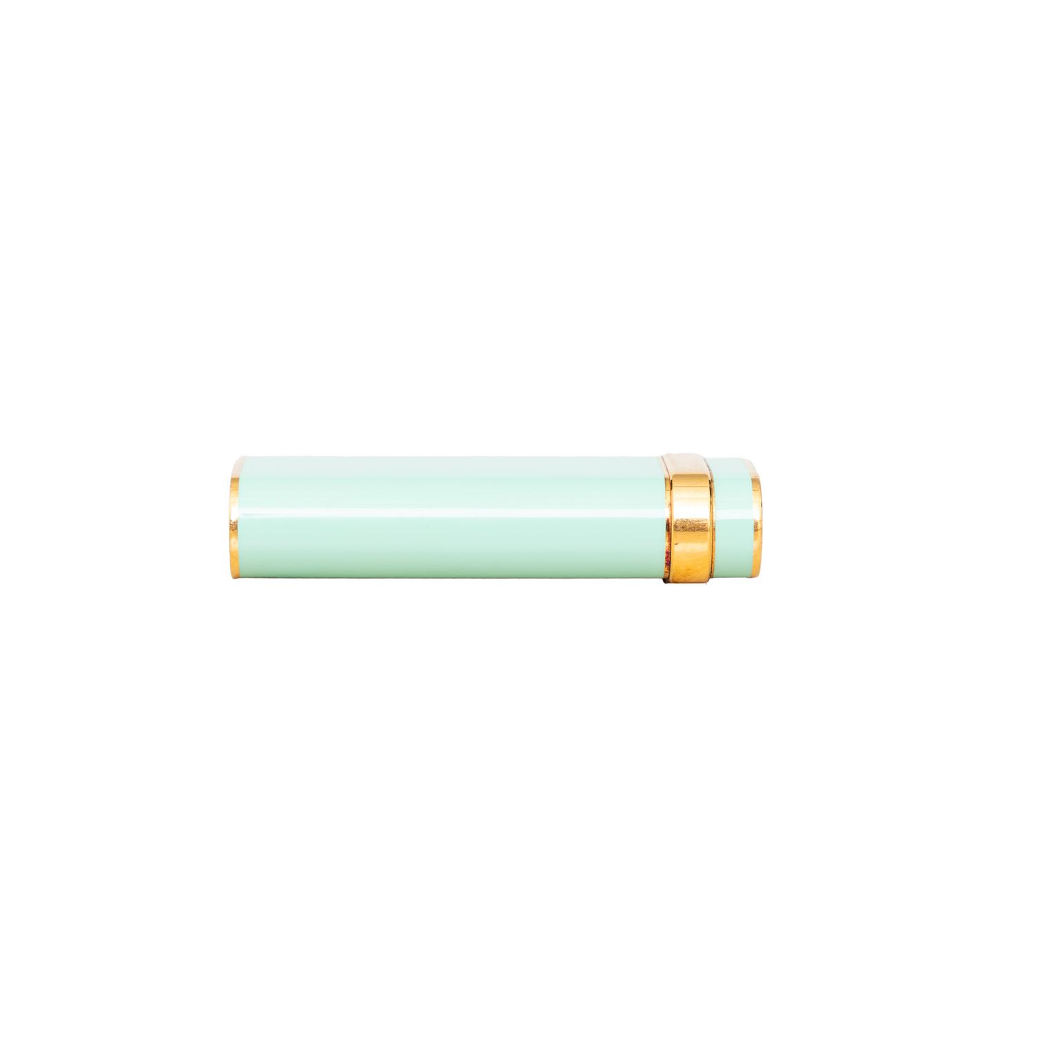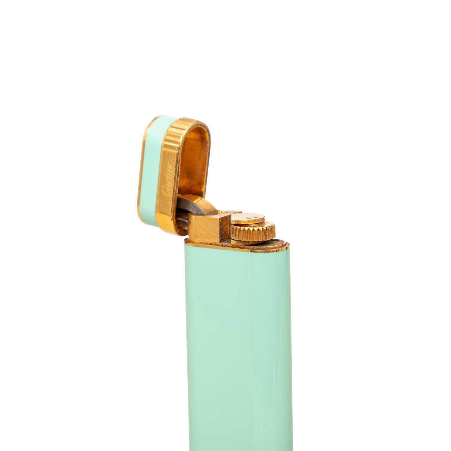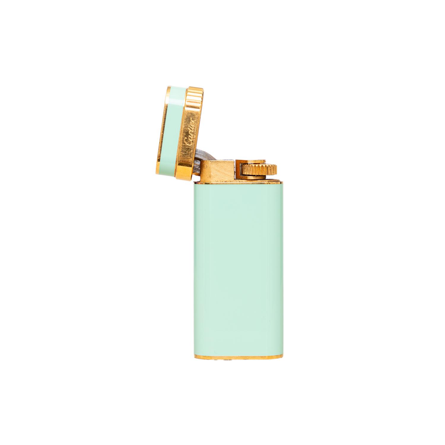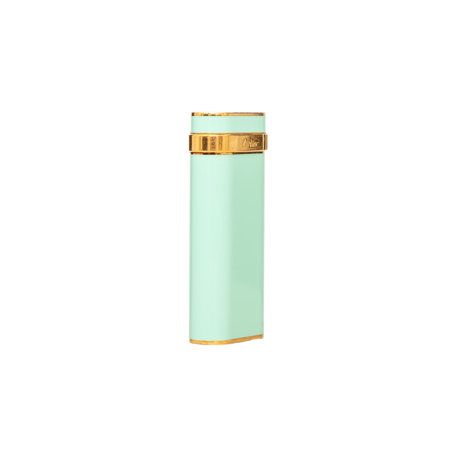 The Cartier Trinity Lacquer Lighter is a collector's item from the 90s, featuring mint green lacquer steel and gold laminated design. The Cartier brand logo is prominently displayed, making it a must-have for any Cartier enthusiast. Remarks: There are some scratches and signs of wear but very good conditions.