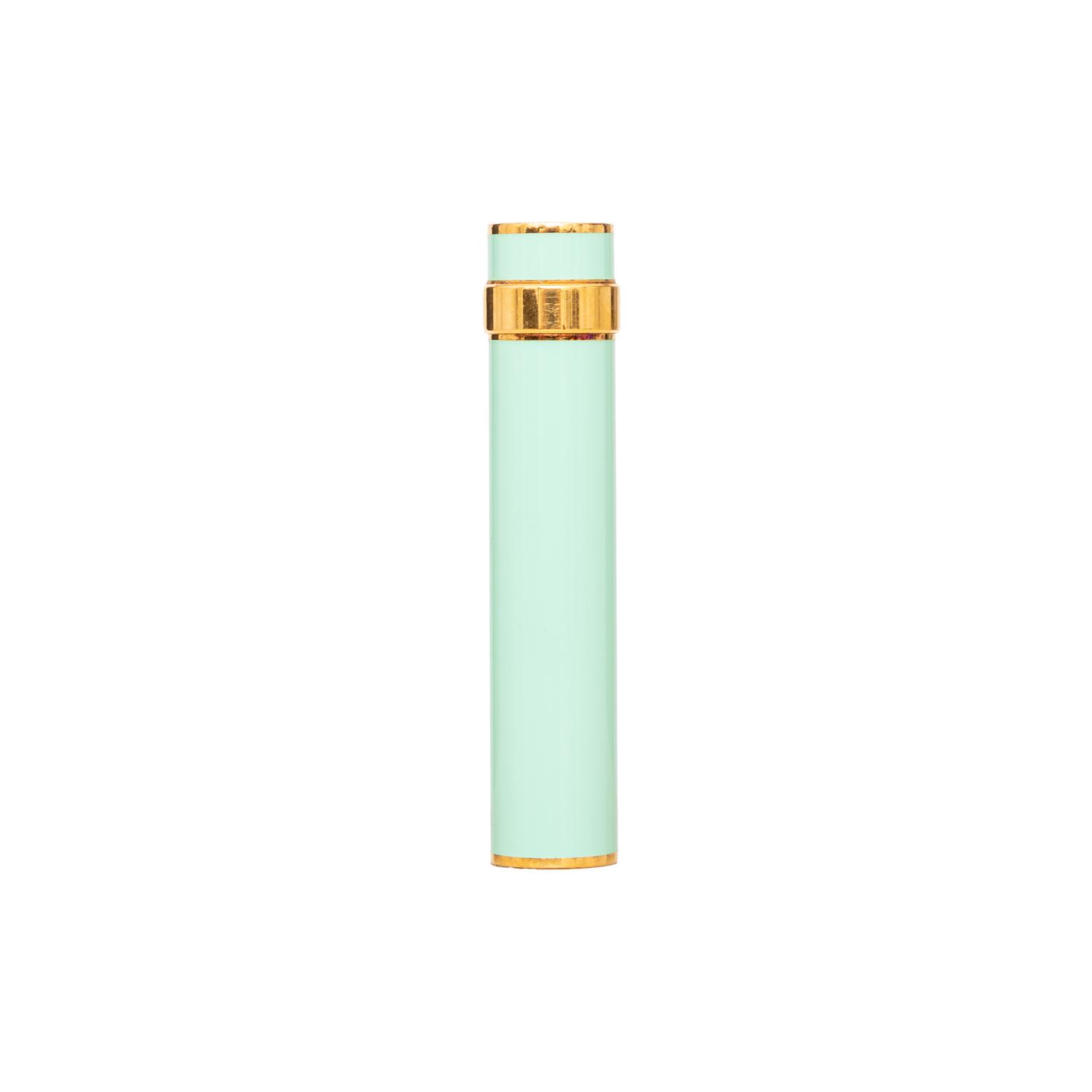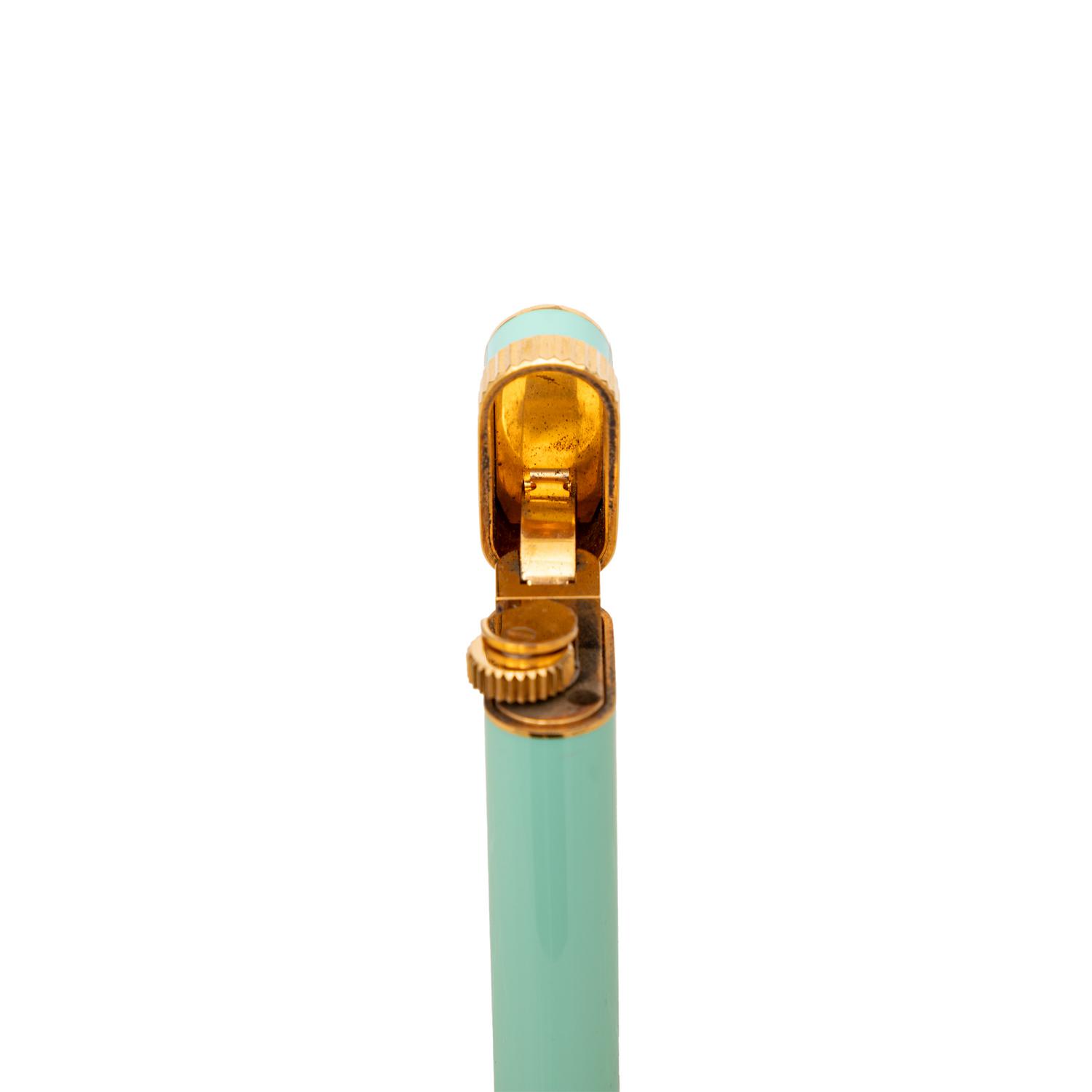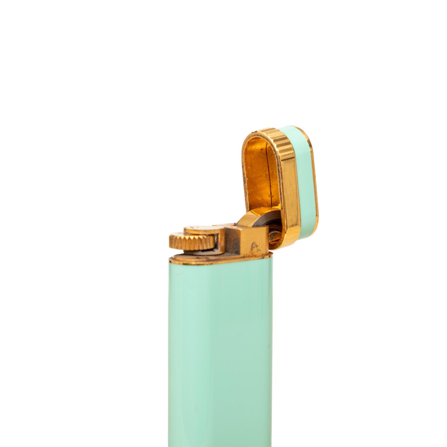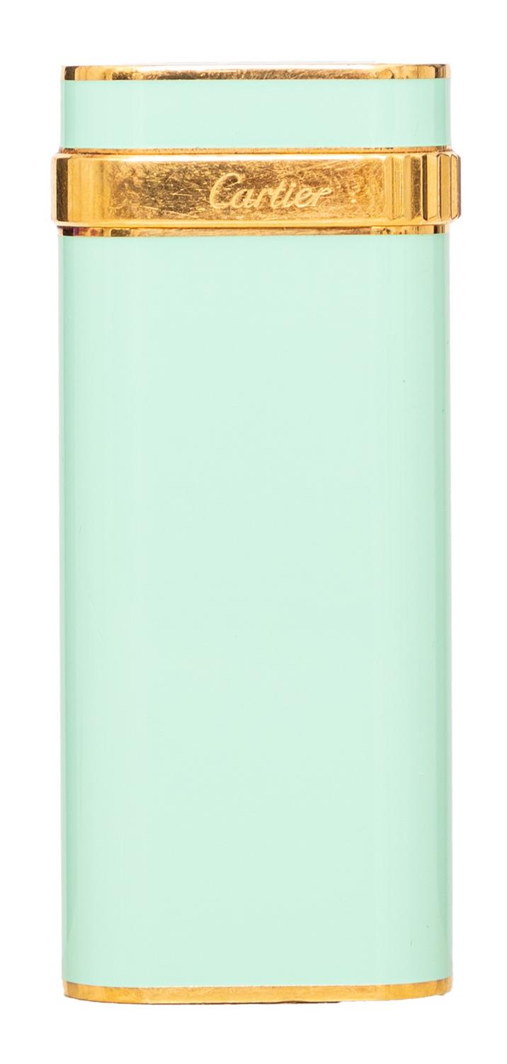 The Cartier Trinity Lacquer Lighter is a collector's item from the 90s, featuring mint green lacquer steel and gold laminated design. The Cartier brand logo is prominently displayed, making it a must-have for any Cartier enthusiast. Remarks: There are some scratches and signs of wear but very good conditions.