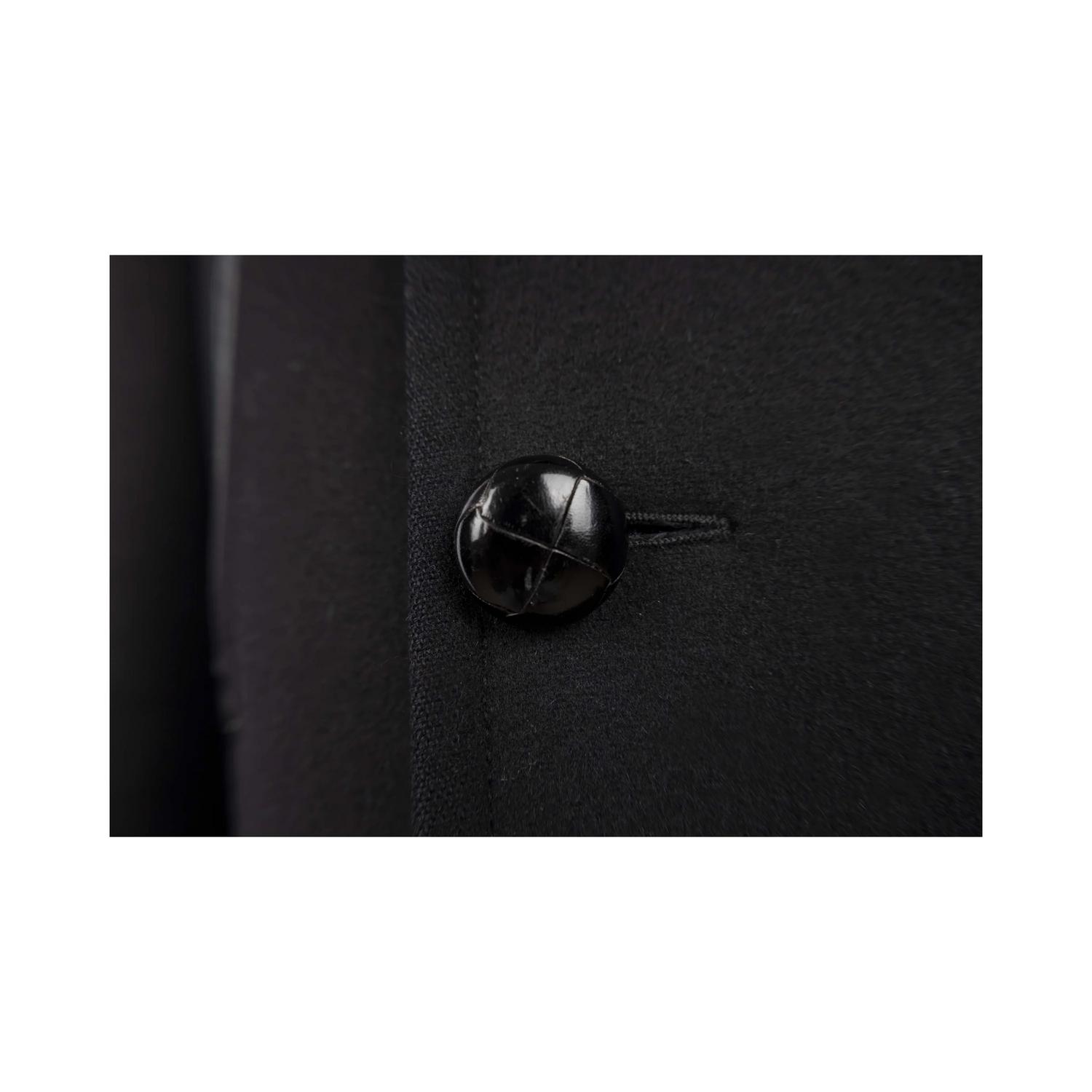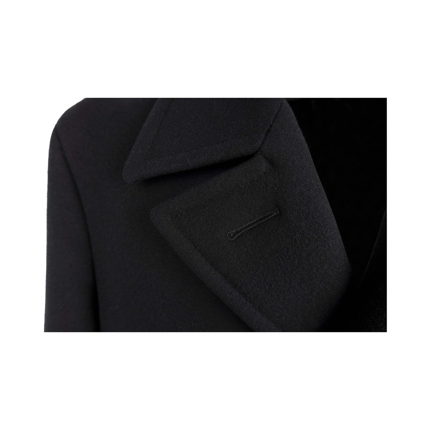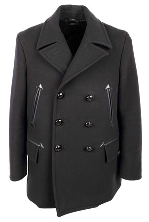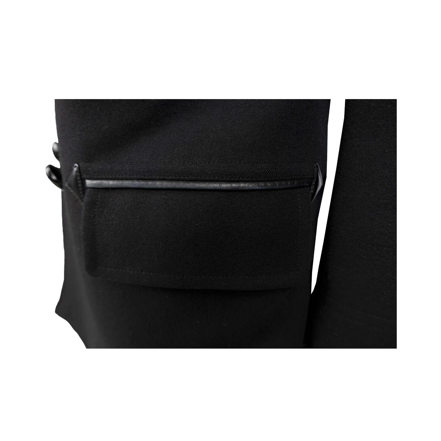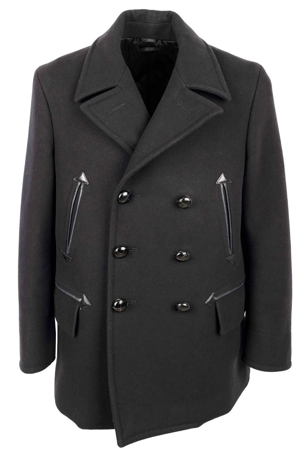 Tom Ford coat in black, featuring a double-breasted design with a lapel collar. It has two vertical pockets with leather piping, a unique and elegant detail that adds a touch of luxury to the jacket and two pockets with flaps. The jacket has a padded lining made of polyester and mix of cotton ad cupro. Size 50 IT. Remarks: The label on the neck is slightly washed off. Excellent condition.