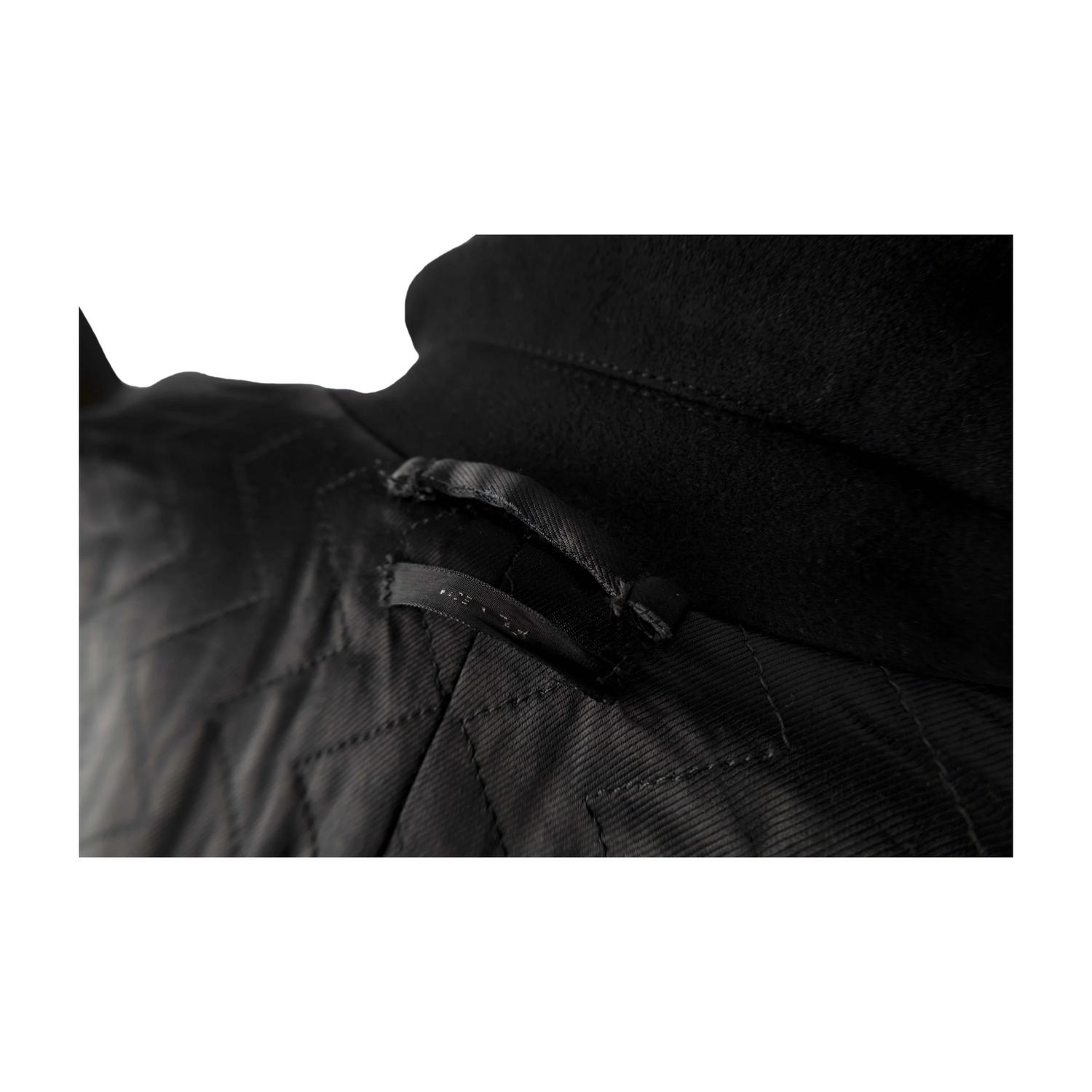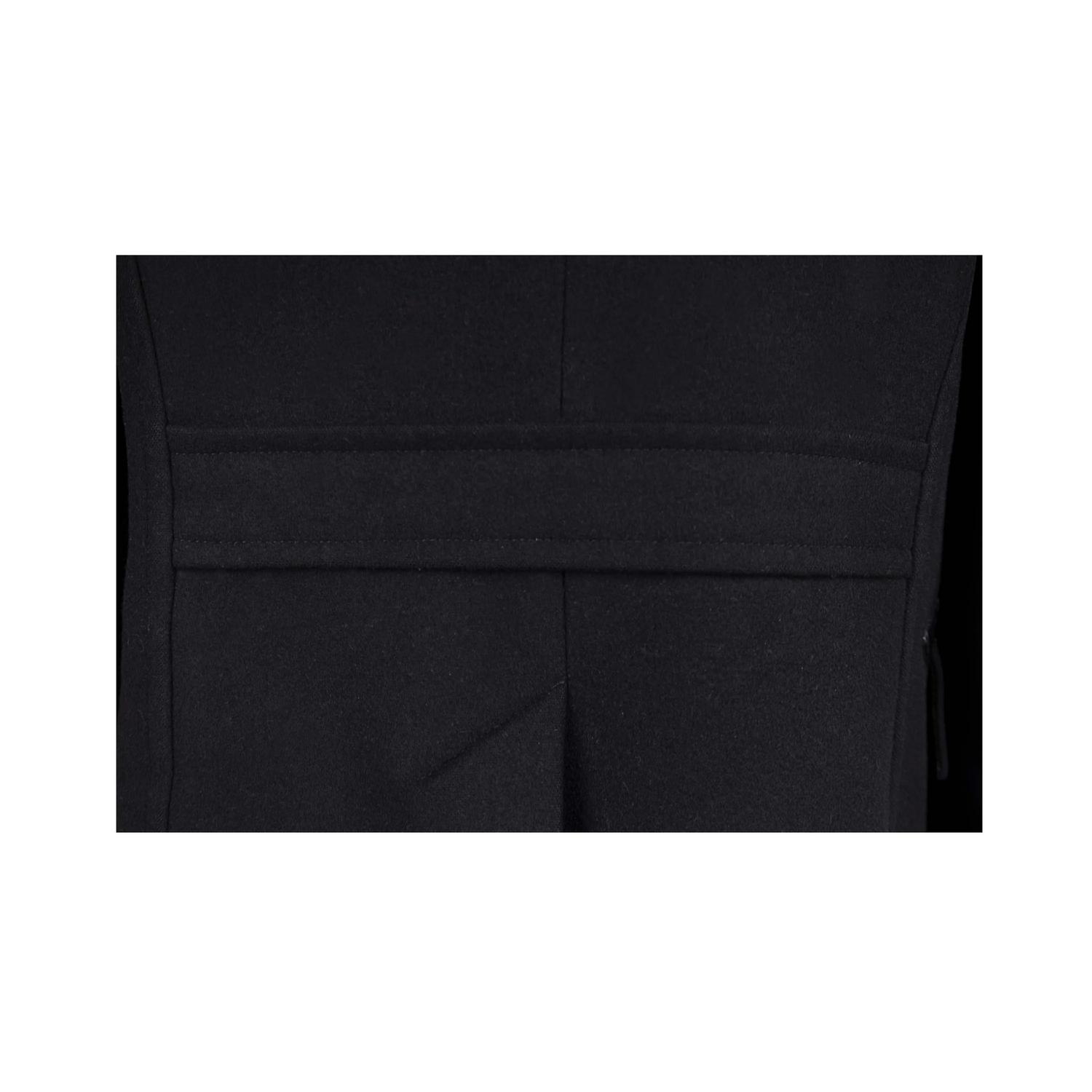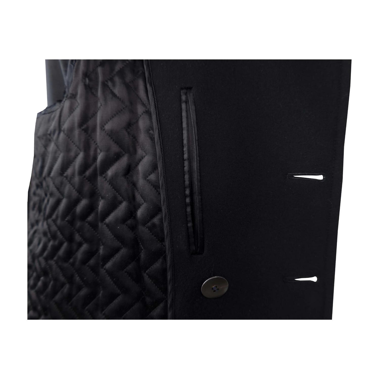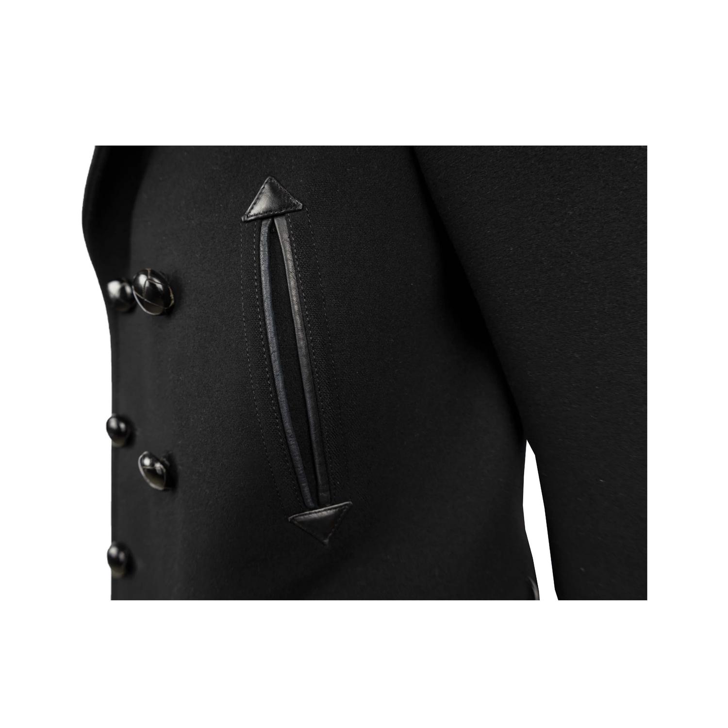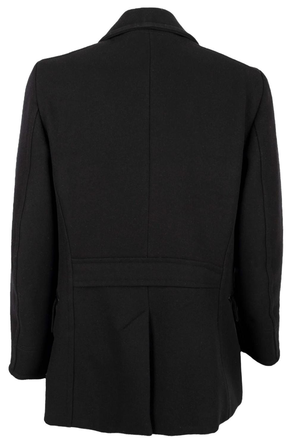 Tom Ford coat in black, featuring a double-breasted design with a lapel collar. It has two vertical pockets with leather piping, a unique and elegant detail that adds a touch of luxury to the jacket and two pockets with flaps. The jacket has a padded lining made of polyester and mix of cotton ad cupro. Size 50 IT. Remarks: The label on the neck is slightly washed off. Excellent condition.