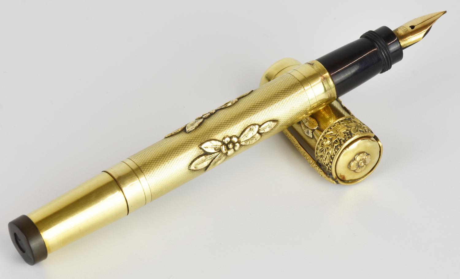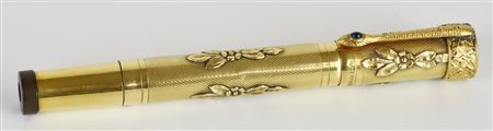 Penna stilografica retrattile con corpo laminato in oro 18K e decorazioni incise. Pennino firmato e cappuccio a vite. Lunghezza 12 cm. Presenta segni d’uso. Inchiostrata.