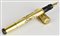 Retractable fountain pen with an 18K gold-plated body and engraved decorations. Signed nib and screw-on cap. Length: 12 cm. Shows signs of use. Inked.
