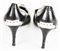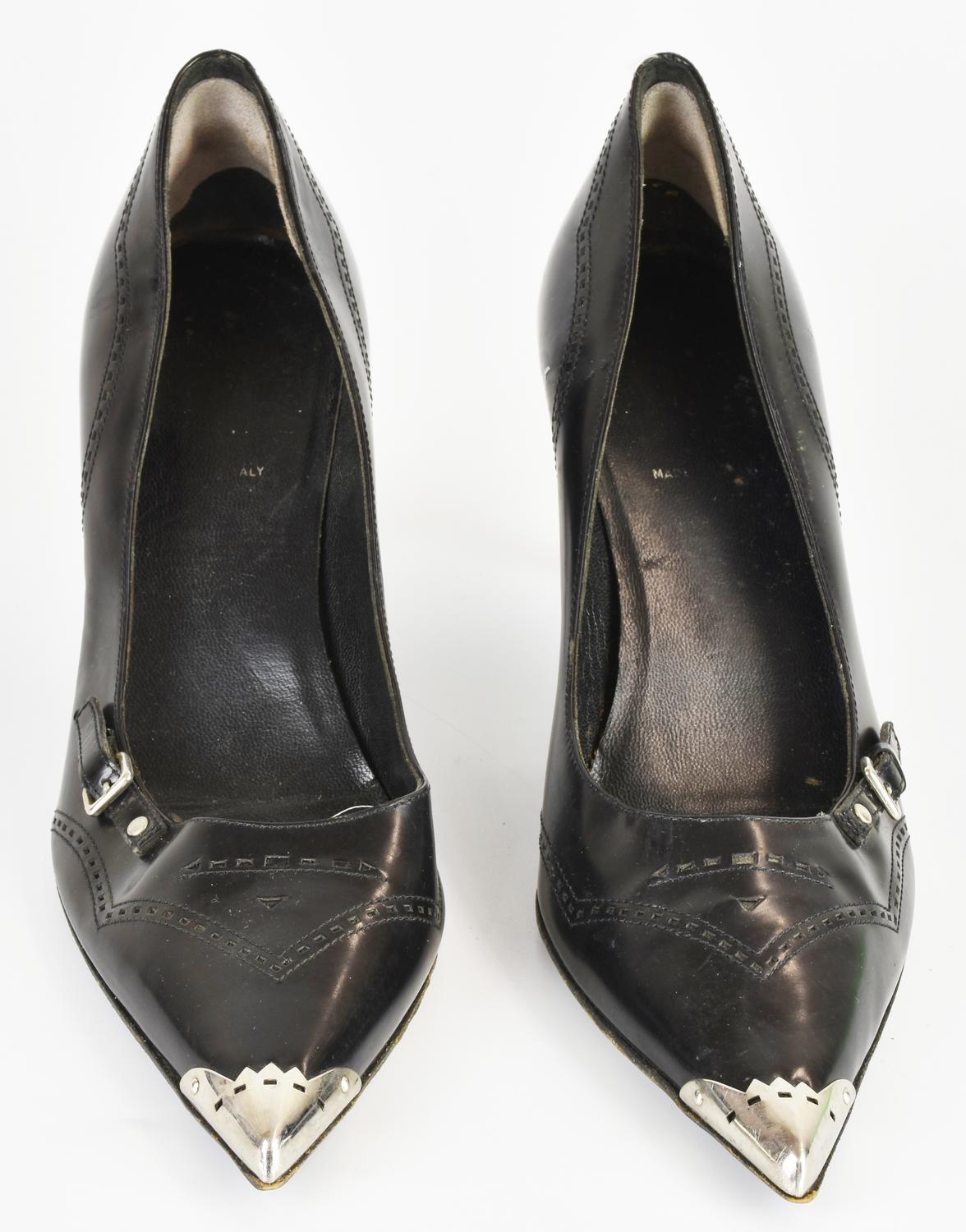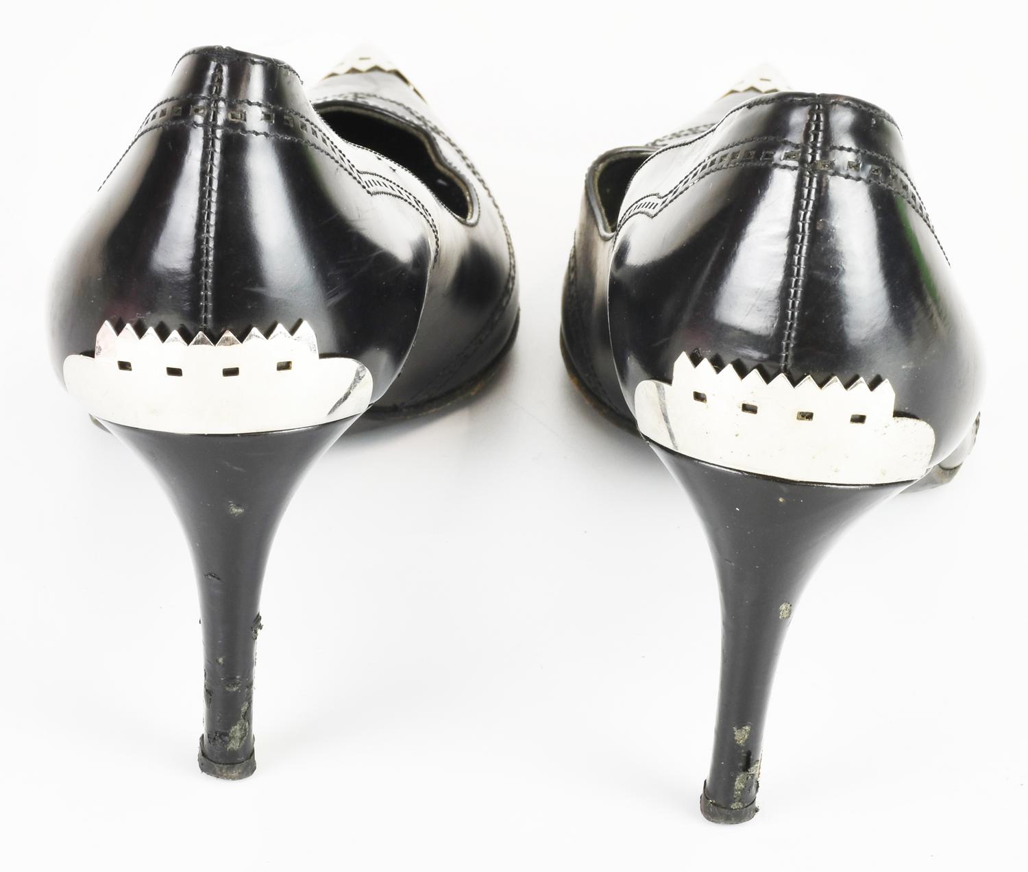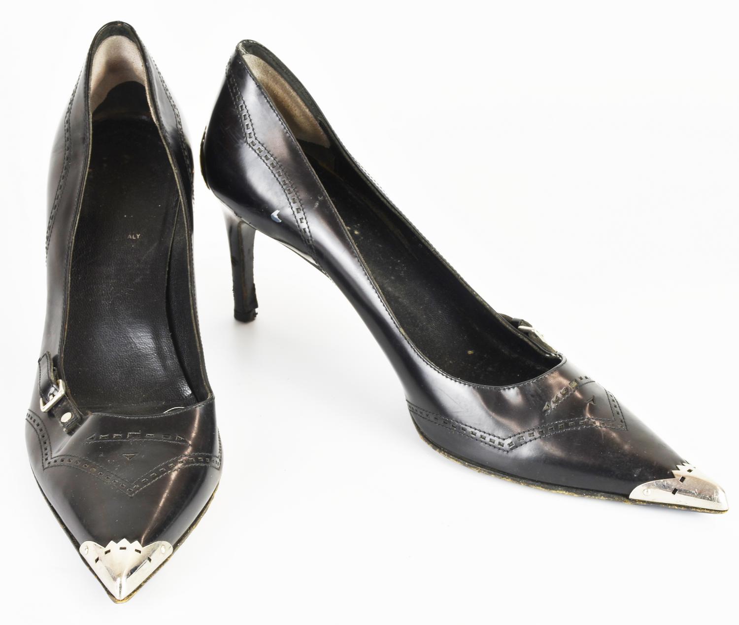 Decollete’ in pelle traforata con dettagli in metallo sulla punta e sul tallone. Tacco di 7,5 cm. Taglia 37. Prodotte in Italia. Segni d’uso. Discretamente conservate.