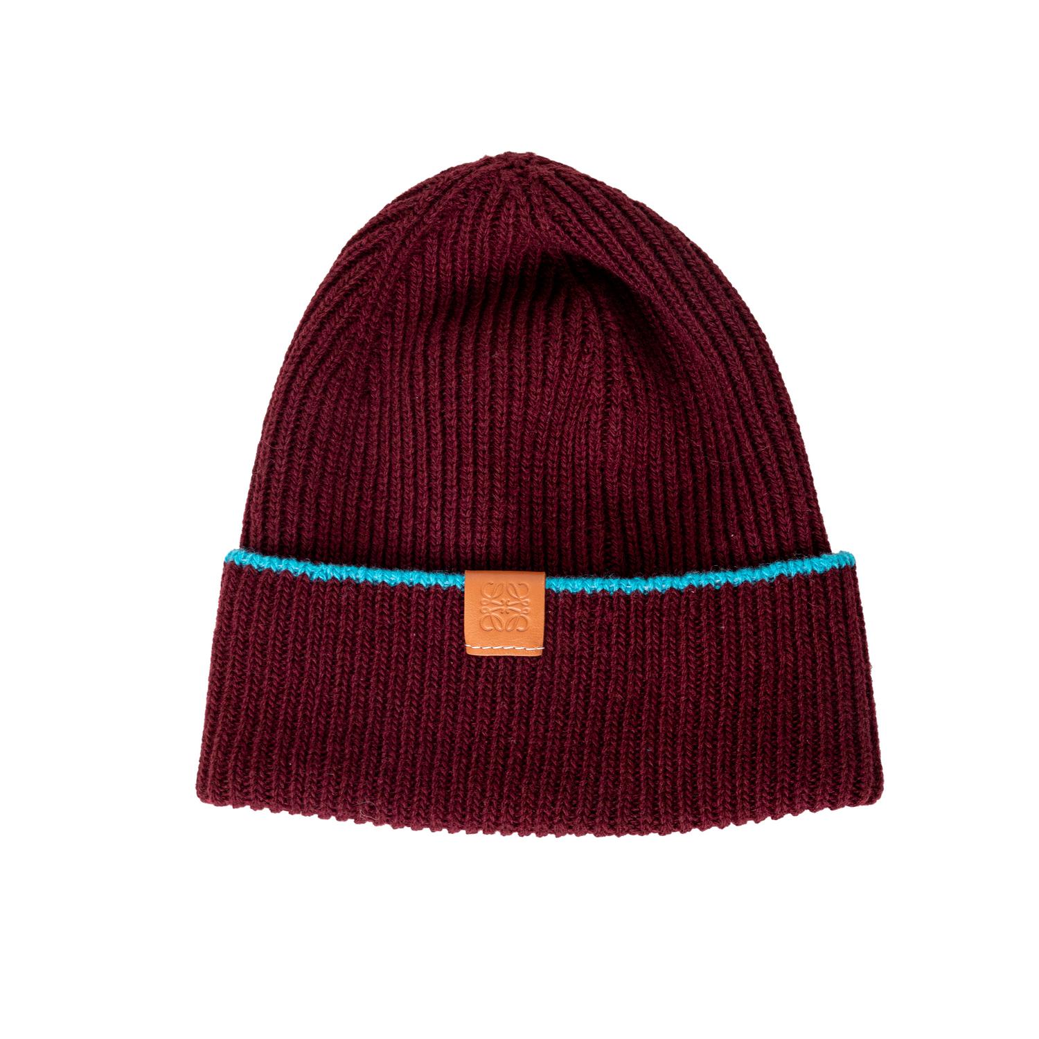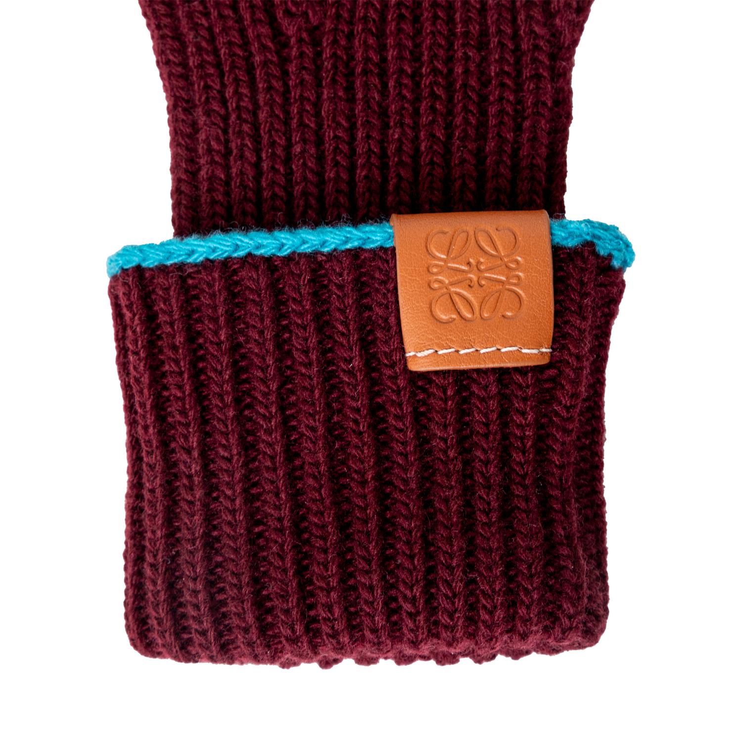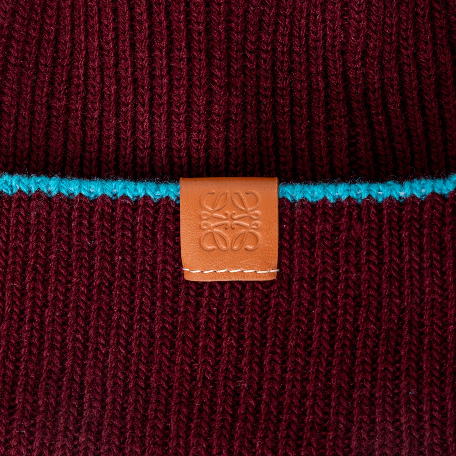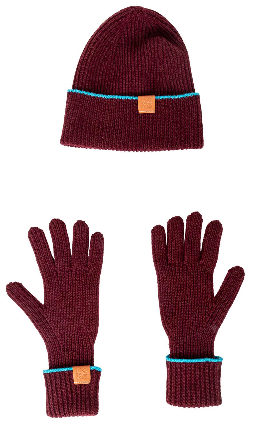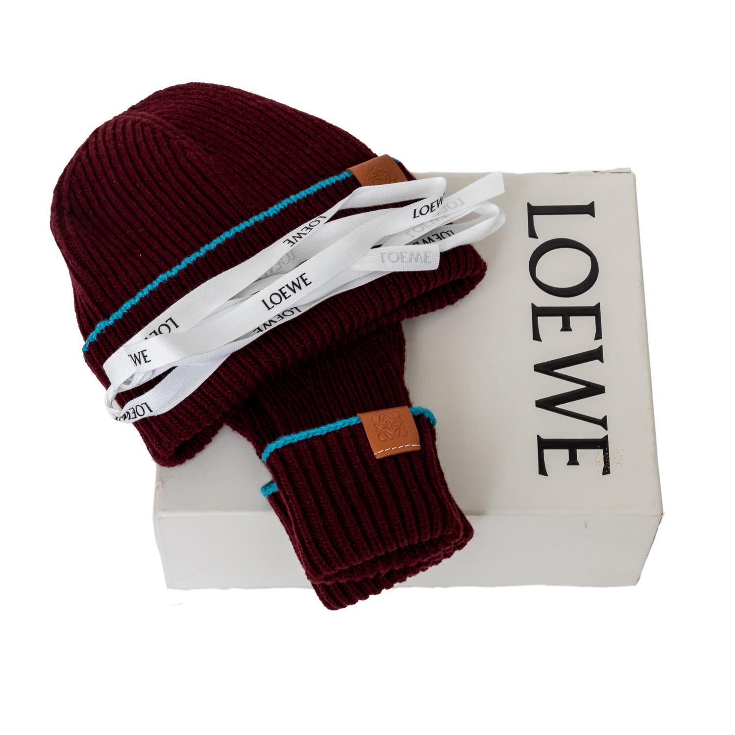 Upgrade your winter accessories with the Loewe Knitted Hat and Glove Set. Crafted with high-quality wool, this set features a chic deep burgundy color and a pop of turquoise blue. The tan leather patch, embossed with the anagram logo, adds a touch of luxury to this set, perfect for a present. Inclusion: box. Remarks: In unused condition.