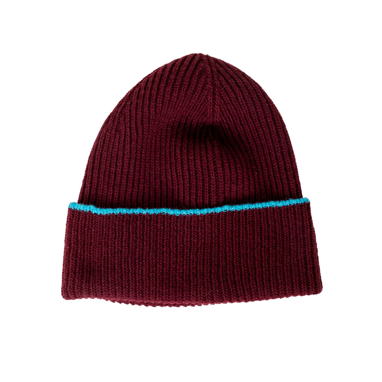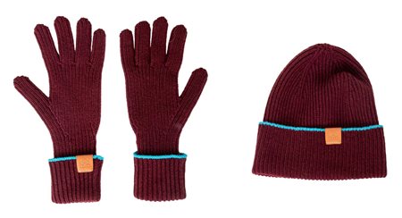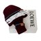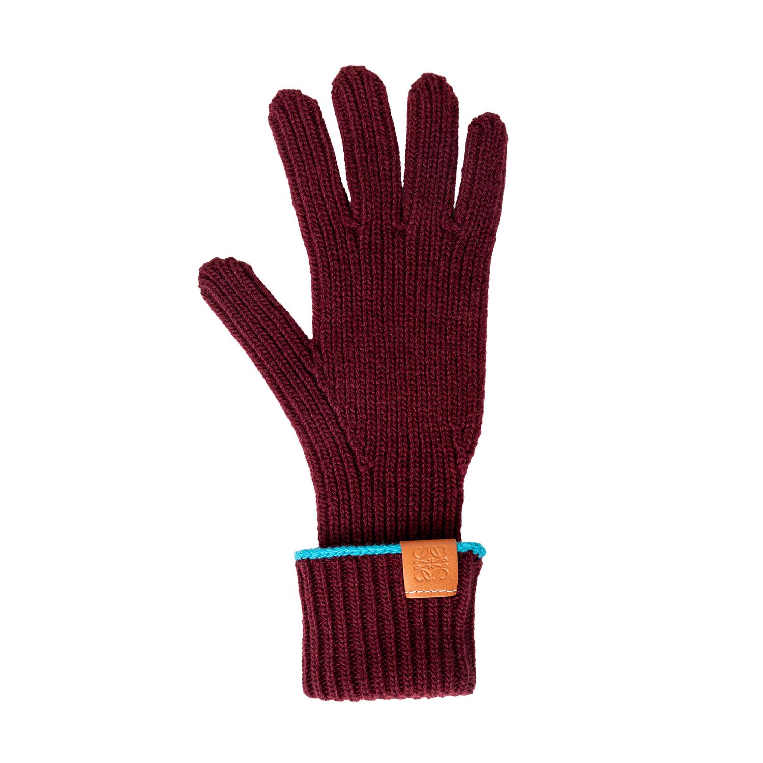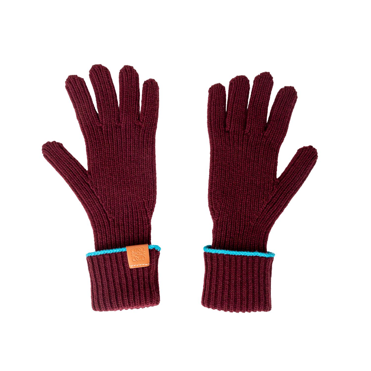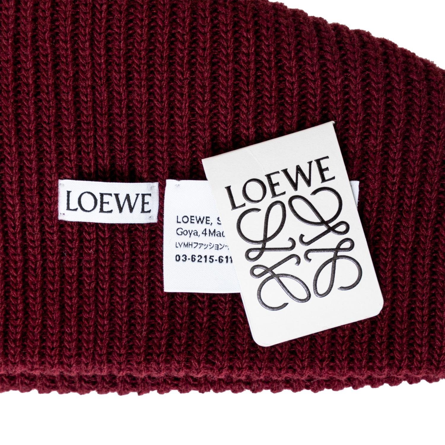 Upgrade your winter accessories with the Loewe Knitted Hat and Glove Set. Crafted with high-quality wool, this set features a chic deep burgundy color and a pop of turquoise blue. The tan leather patch, embossed with the anagram logo, adds a touch of luxury to this set, perfect for a present. Inclusion: box. Remarks: In unused condition.