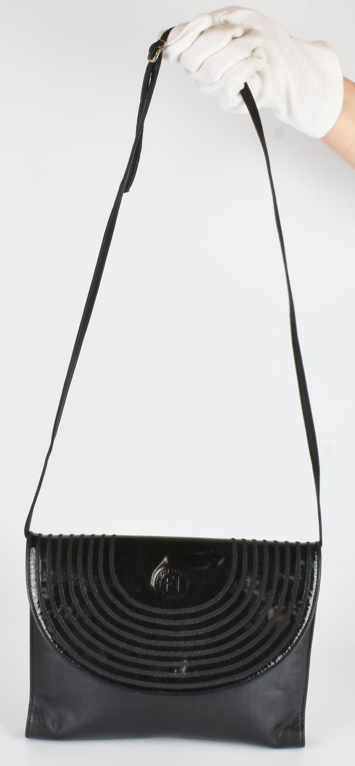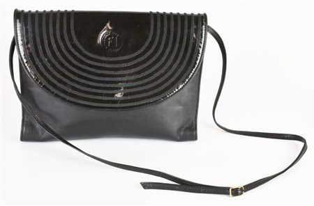 Borsa a tracolla in pelle nera. Tracolla rimovibile. Chiusura con patta frontale in vernice. Interno organizzato in tre vani, uno chiuso con cerniera e un taschino laterale con cerniera. Logo impresso sulla patta. Cm 25,50x20,00x3,00. Prodotto in Italia. Presenta normali segni del tempo ma ottime condizioni generali. Ben conservata.