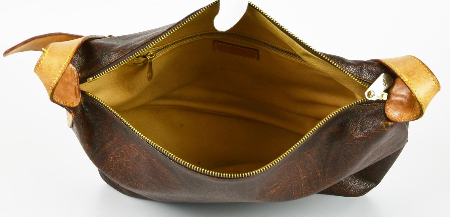 Leather shoulder bag with paisley print, adjustable strap, and front metal logo. Features a zip closure. The leather interior is organized in a single compartment with a side zip pocket. Gold-tone metal hardware. Dimensions: 38.00 x 28.00 x 10.00 cm. Product reference code: 1043569. Made in Italy in September 1998. There are some stains and signs of wear on the interior and strap, but the overall condition remains good. Well preserved.